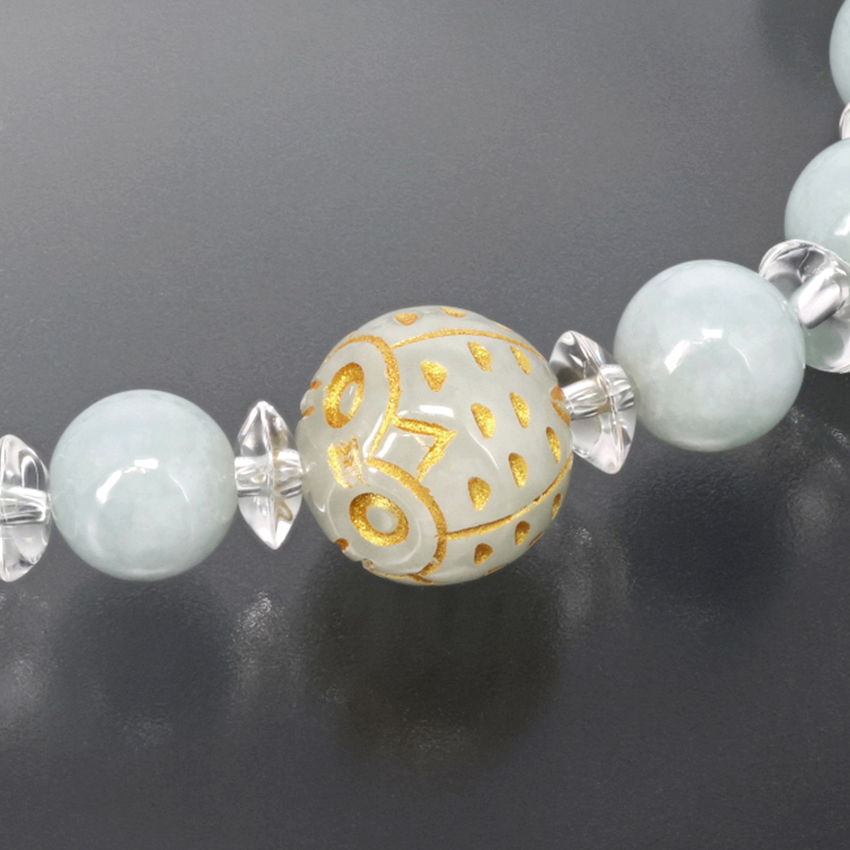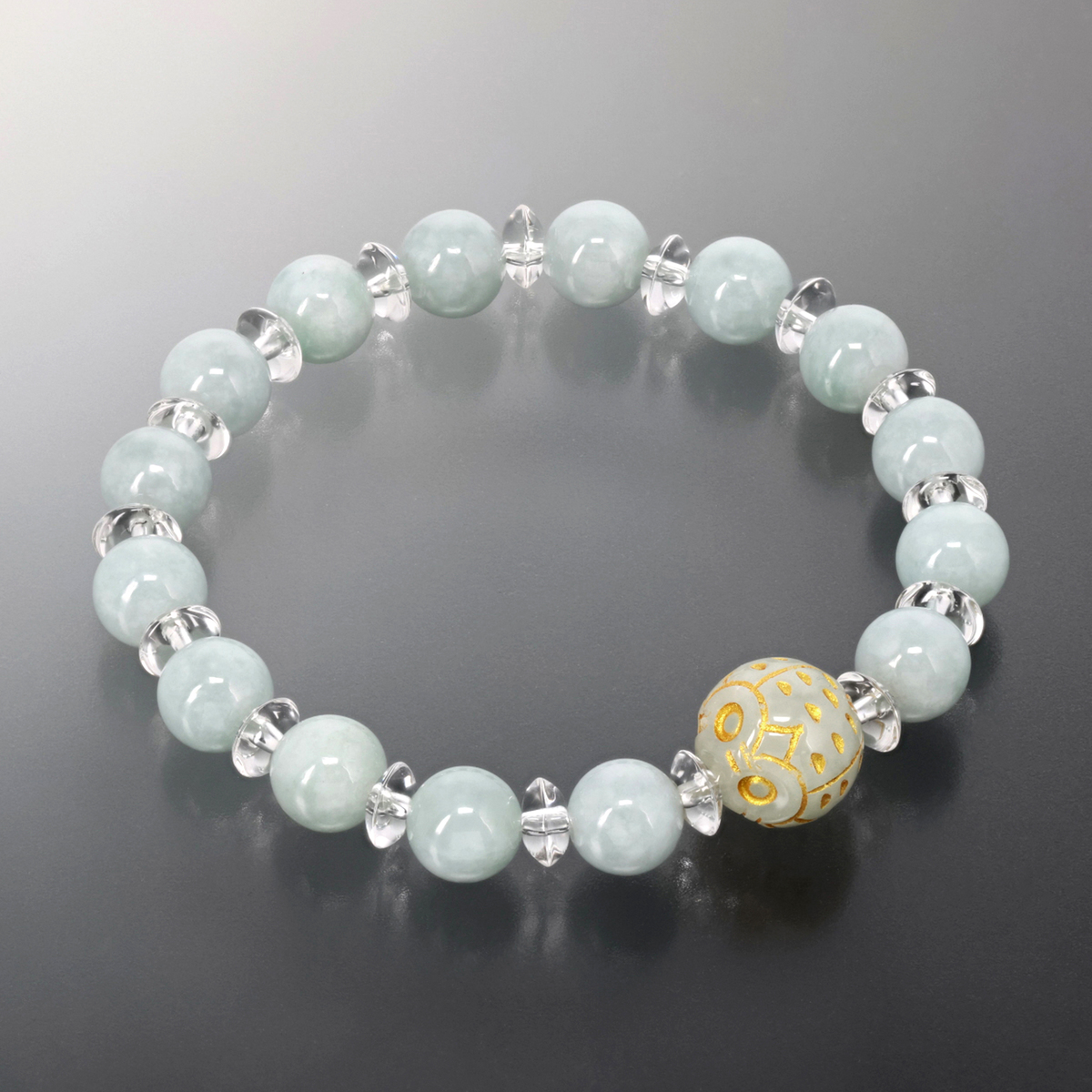 翡翠に幸運のモチーフであるふくろうを手彫りで刻んだサークルブレス。翡翠をベースに水晶をアクセントに加えたデザインが、日常にそっと寄り添います。翡翠の石言葉は「成功・繁栄・幸運・幸福」、水晶は「幸運・浄化・純粋・無垢」です