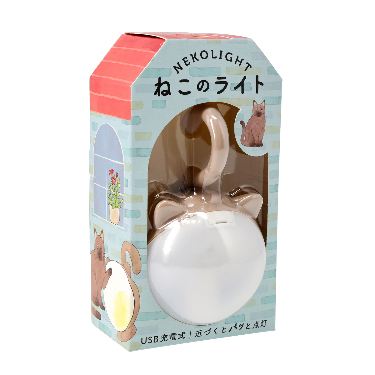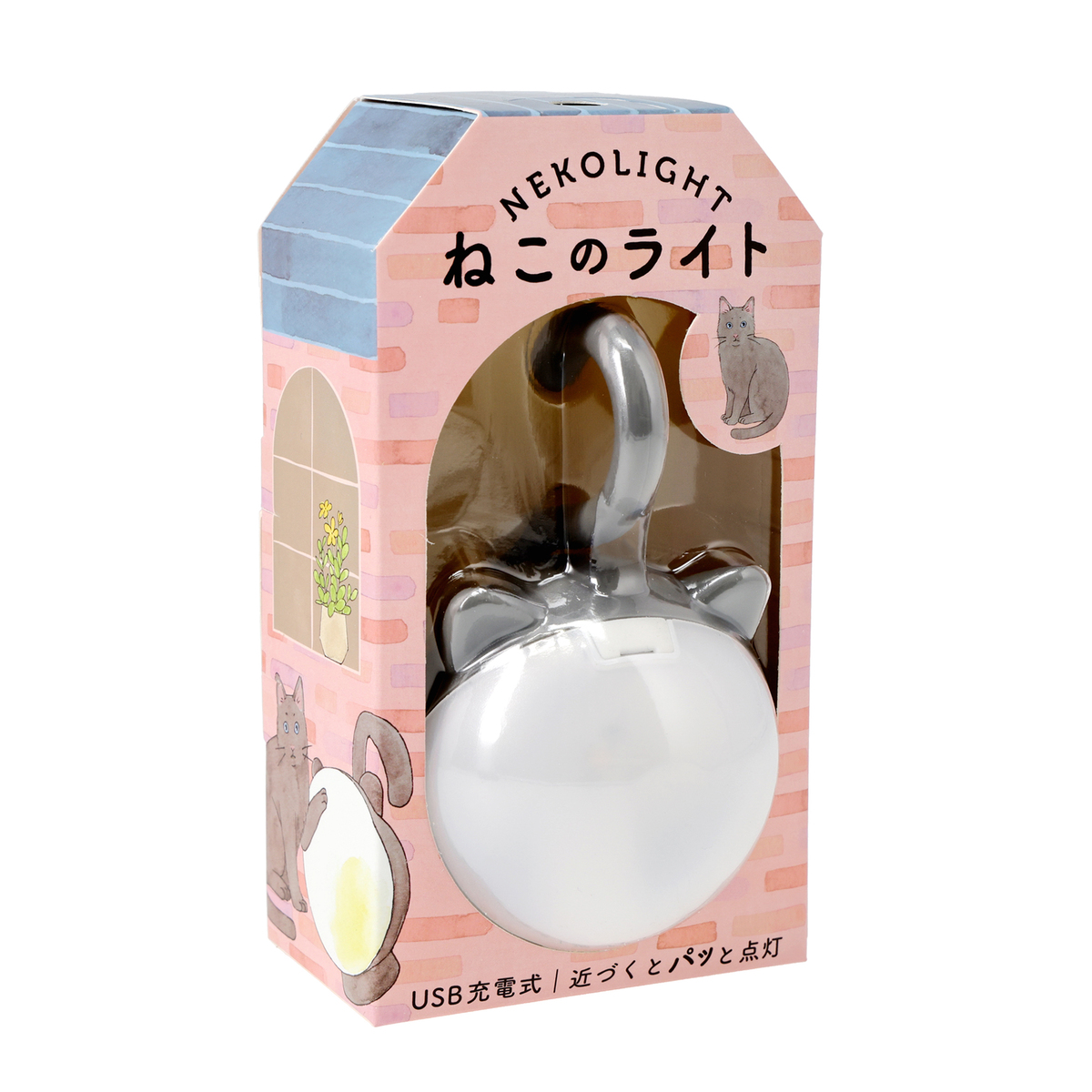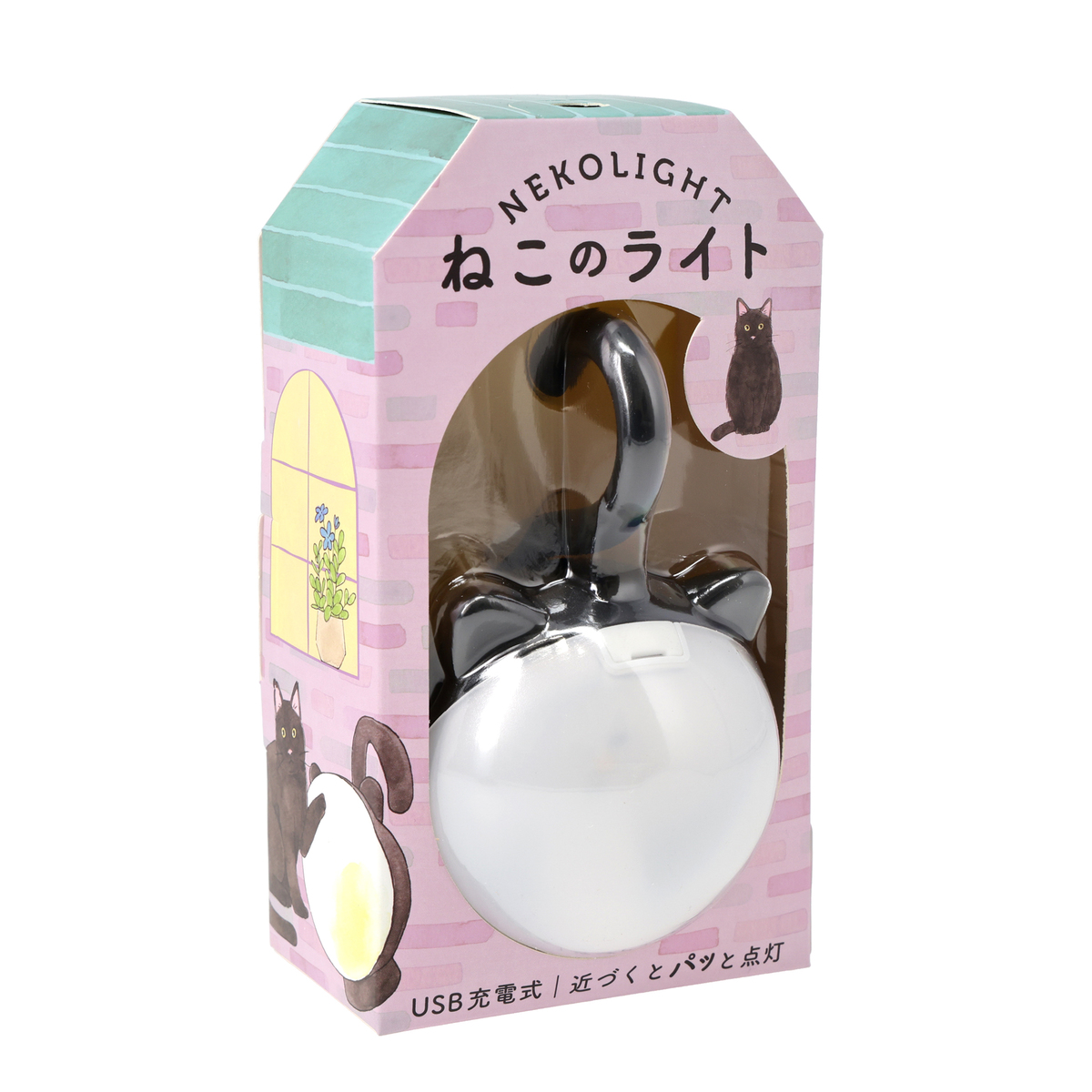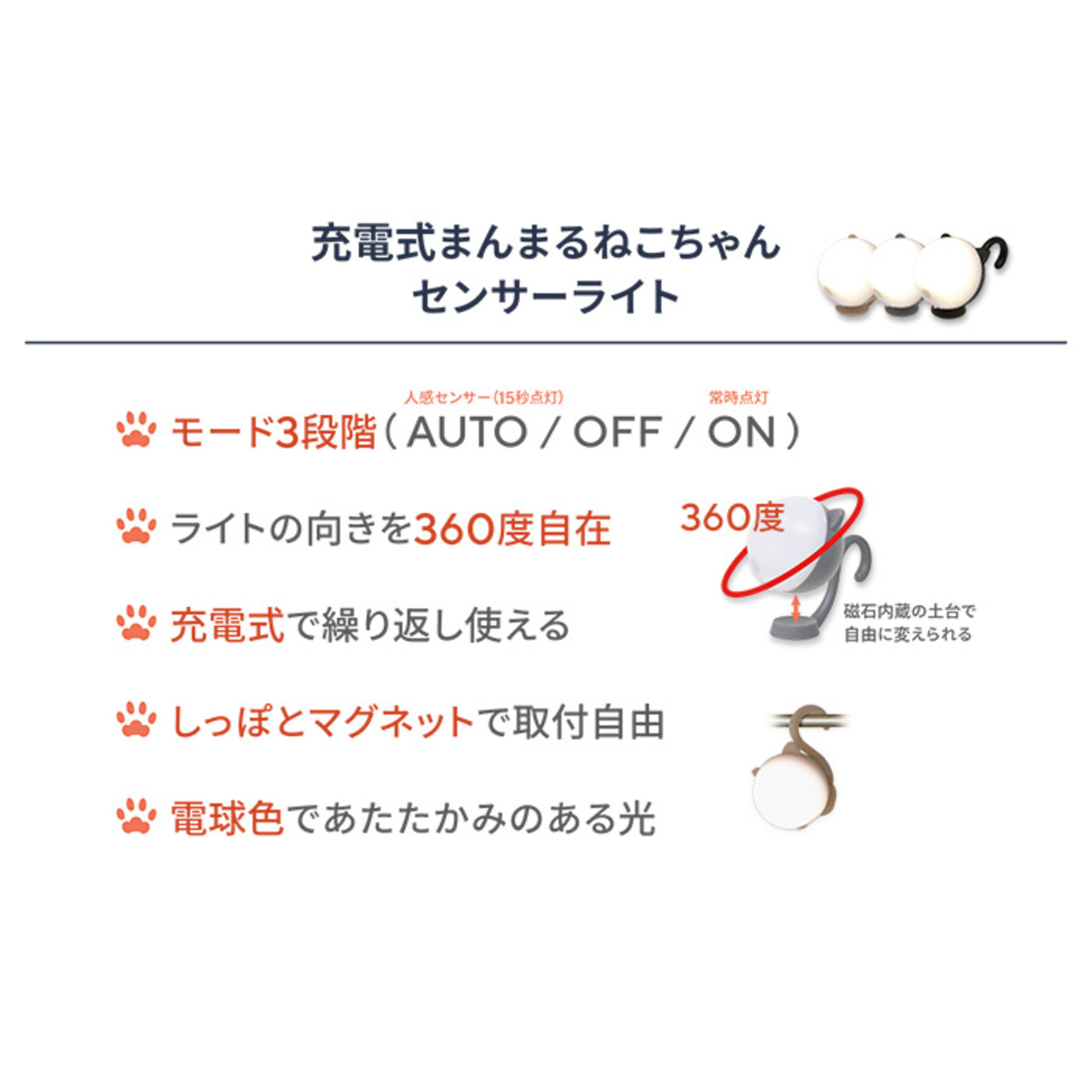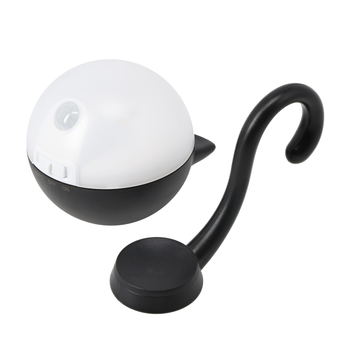 ねこちゃんのフォルムのセンサーライト。暗い場所で人を感知し自動点灯するAUTOモード(*1,*2)、常時点灯のONモード、OFFの3段階で切替られます