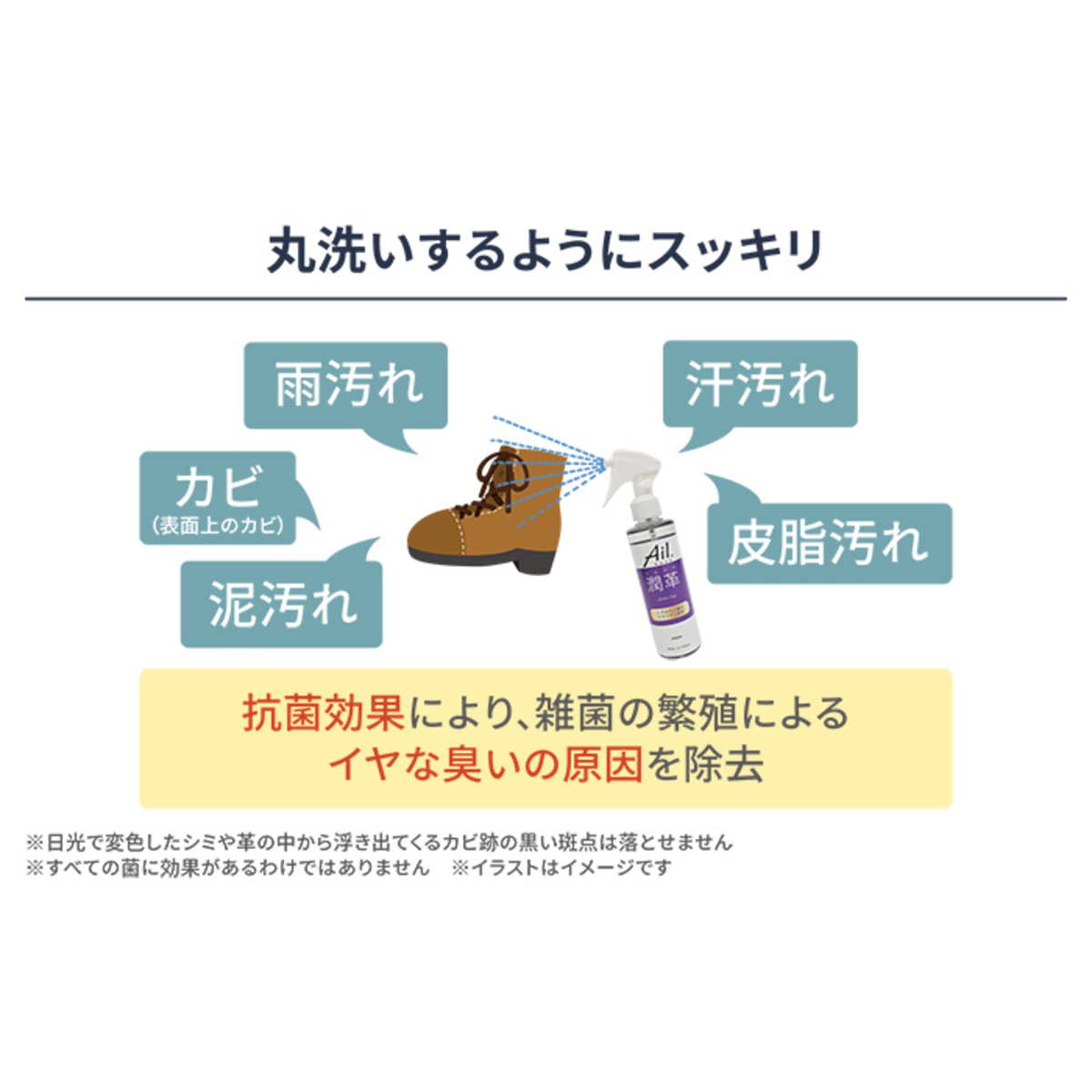 革靴の雨汚れや革靴内の汗汚れなどに、水に溶かして洗い流すイメージでスプレーをたっぷりと吹きかけて、付属のクロスやお手持ちのタオル類でやさしく拭き取るだけ。汚れを浮き立たせて拭き取ることで、革製品の汚れ*を洗い落とし、嫌な臭いの原因を除去します