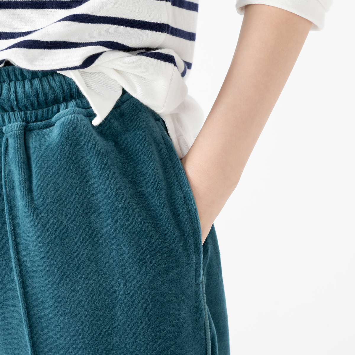 ベロアタッチのカットソー素材を使用。滑らかな起毛の肌触りと、微光沢のある表面感があたたかみを感じさせます。ヒップポケットにはオリジナルミニワッペンを付けました