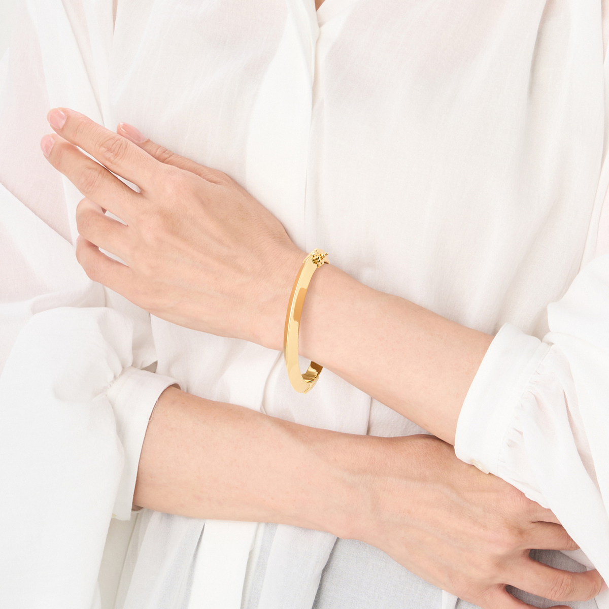 鏡面の輝きが美しいスタイリッシュなデザインのバングル。シンプルながらも存在感があり、カジュアルからフォーマルまで幅広いスタイルにマッチします