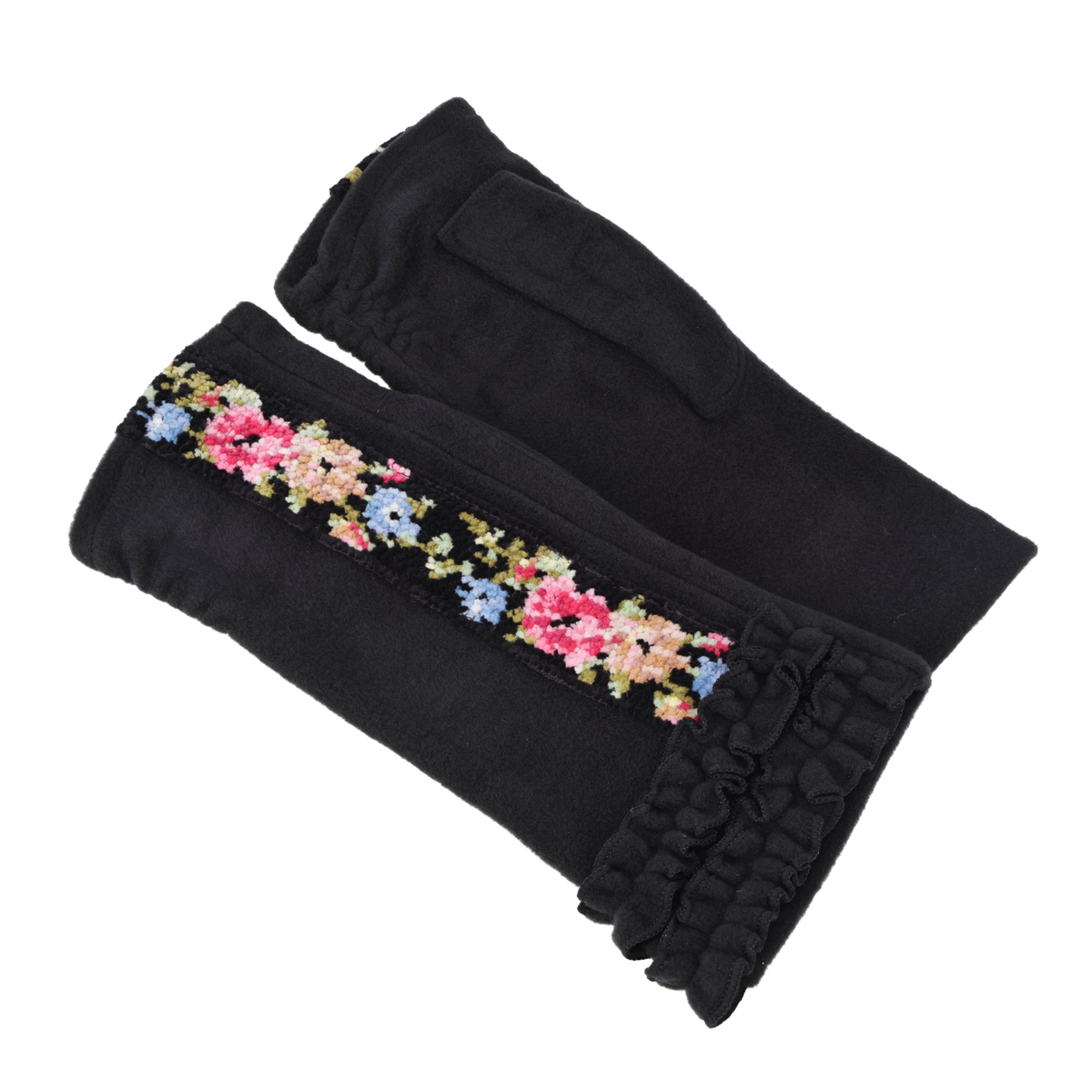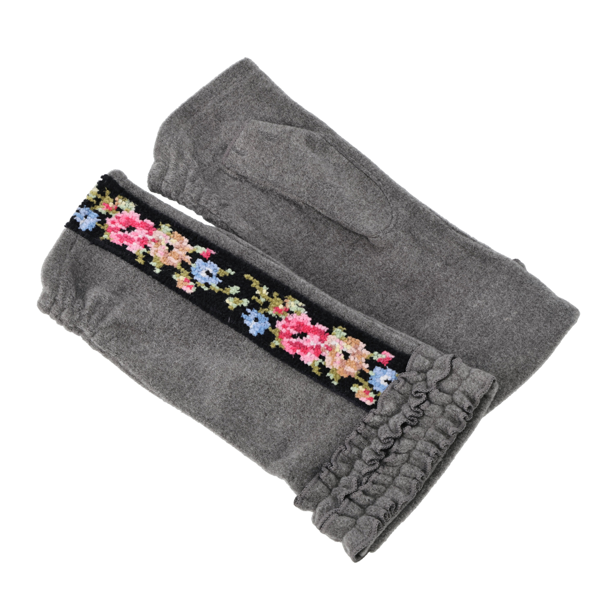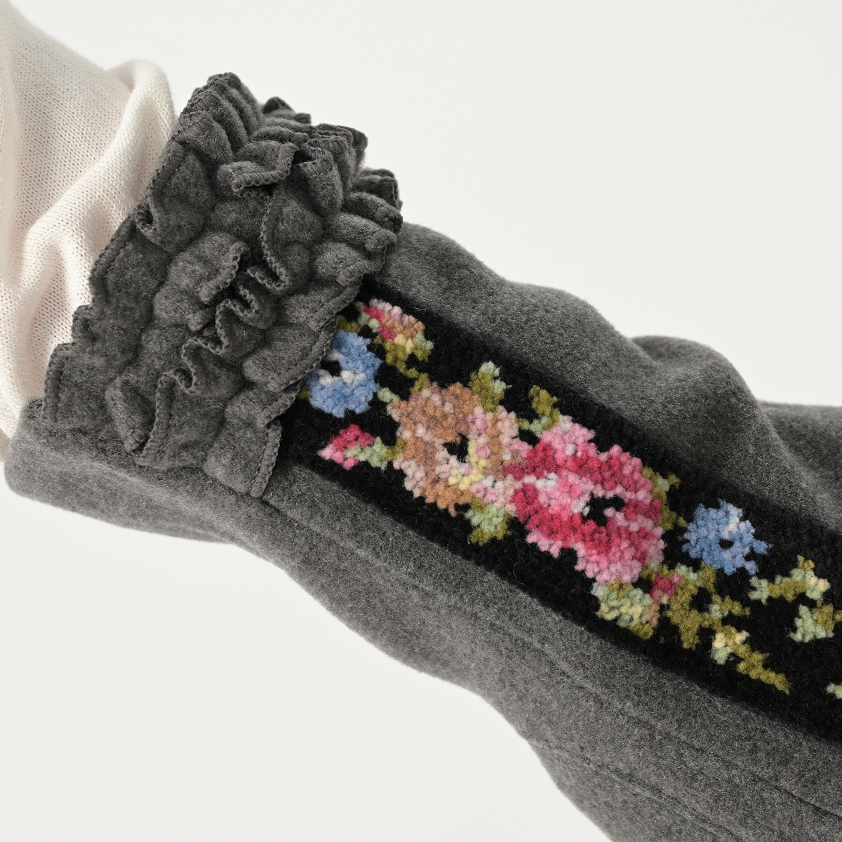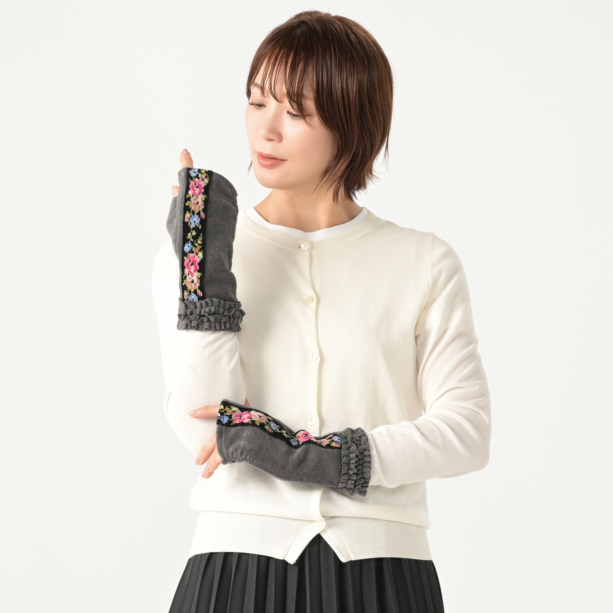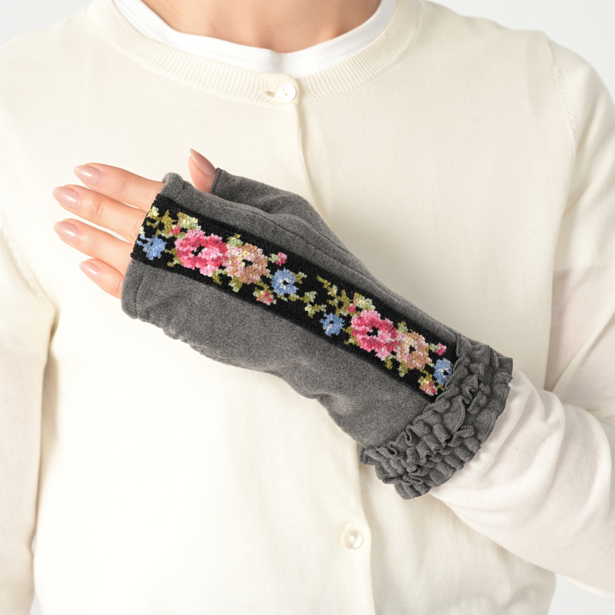 シェニール織のテープをあしらったショート手袋。手首側にはフリルを加え、フェミニンなデザインに仕上げました。汚れたらお家で手洗いが可能です