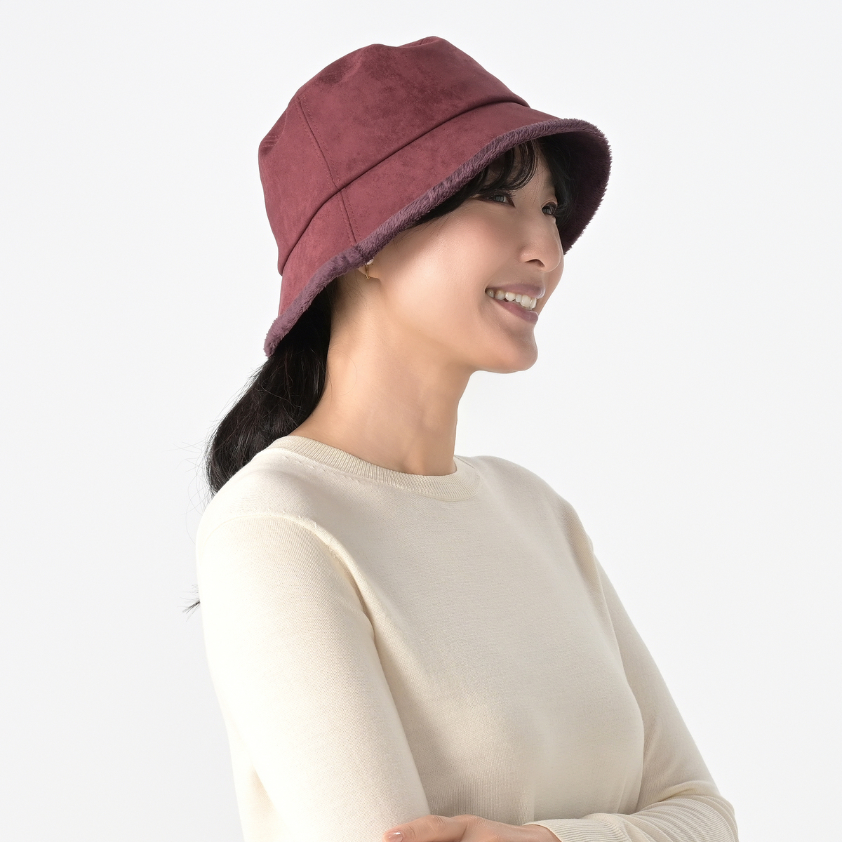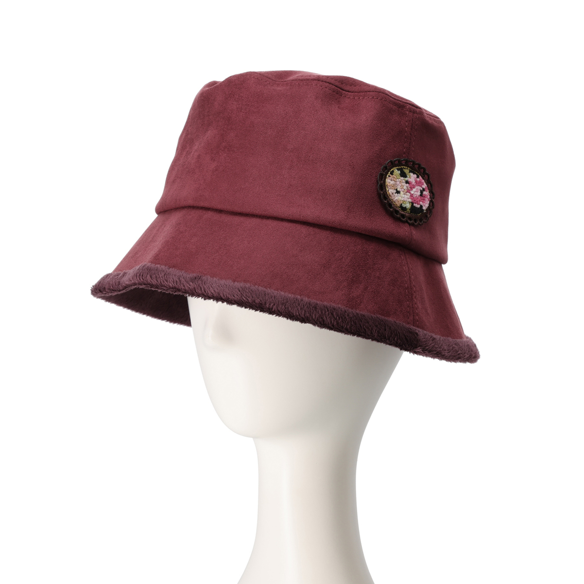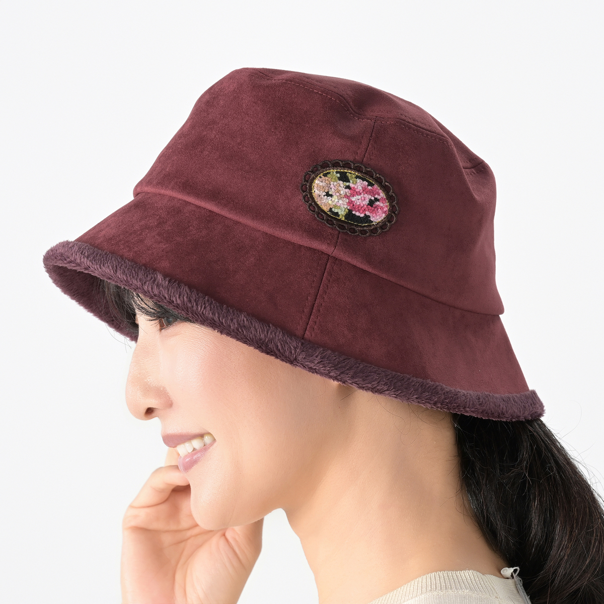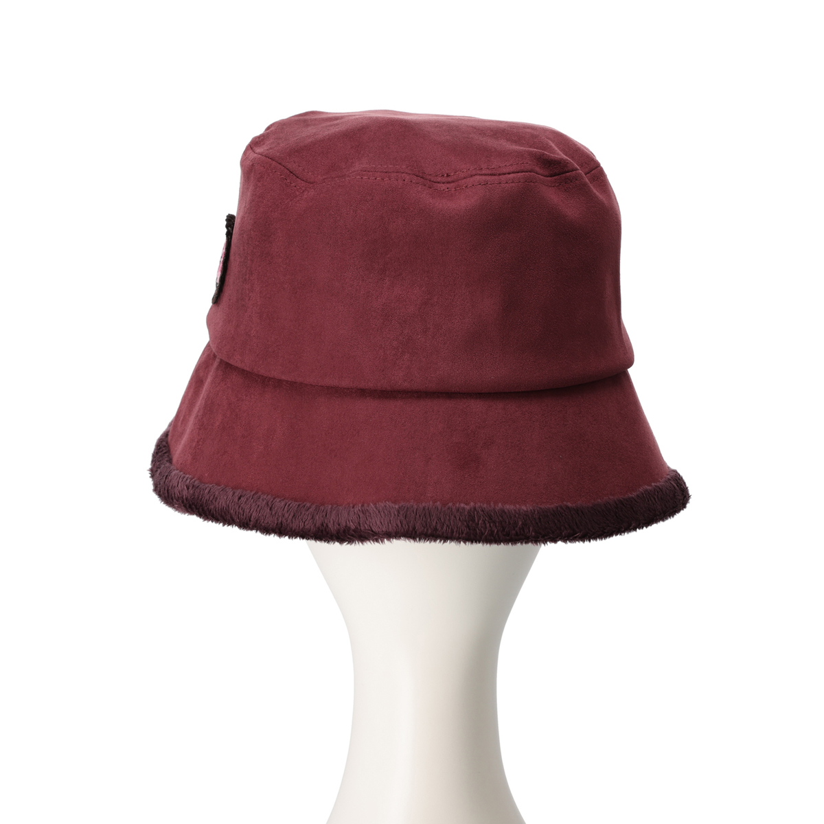 スエード調の表地にシェニール織ワッペンをあしらったバケットハット。つば裏にはボア生地を使い、秋冬らしい温もりを感じられるデザインに仕上げています