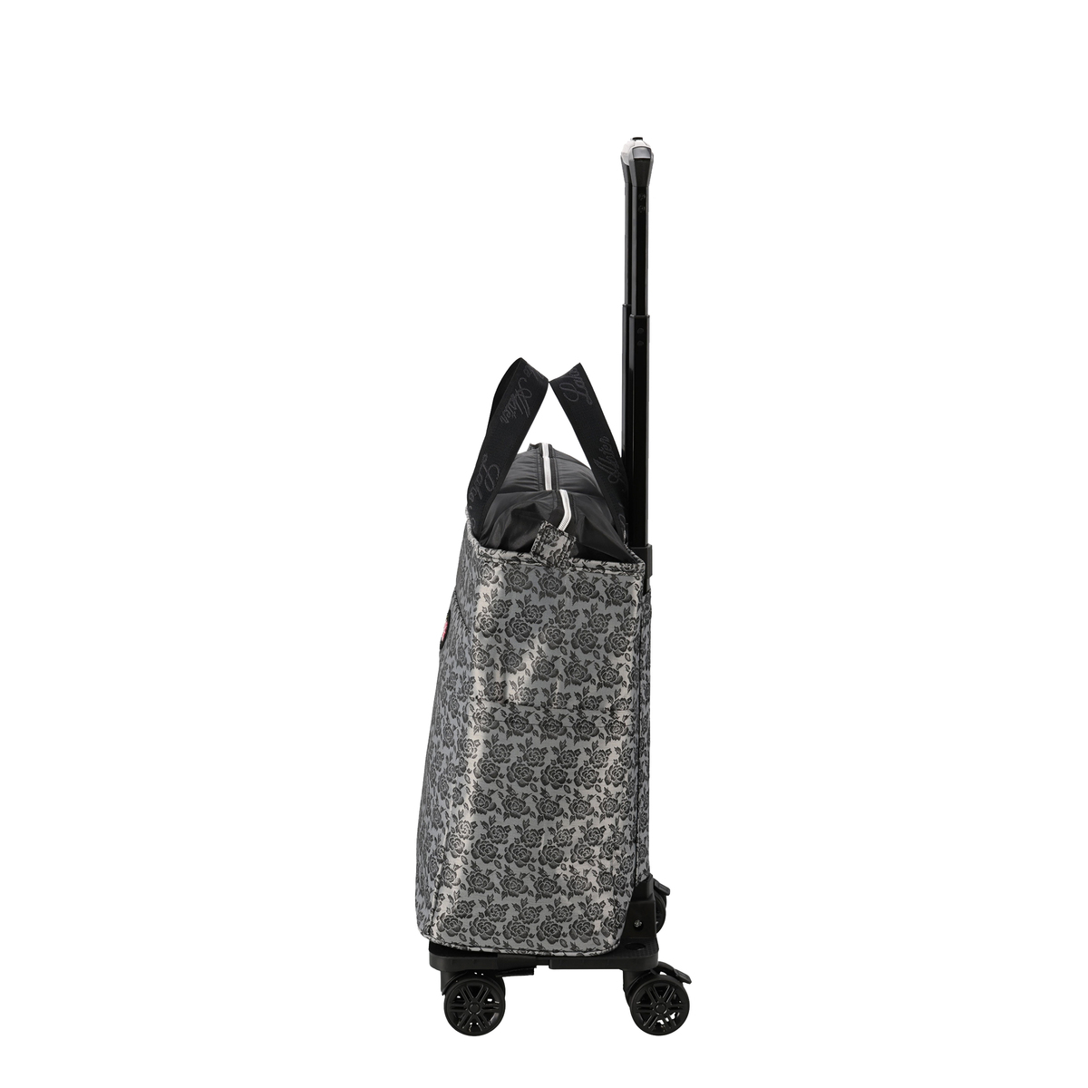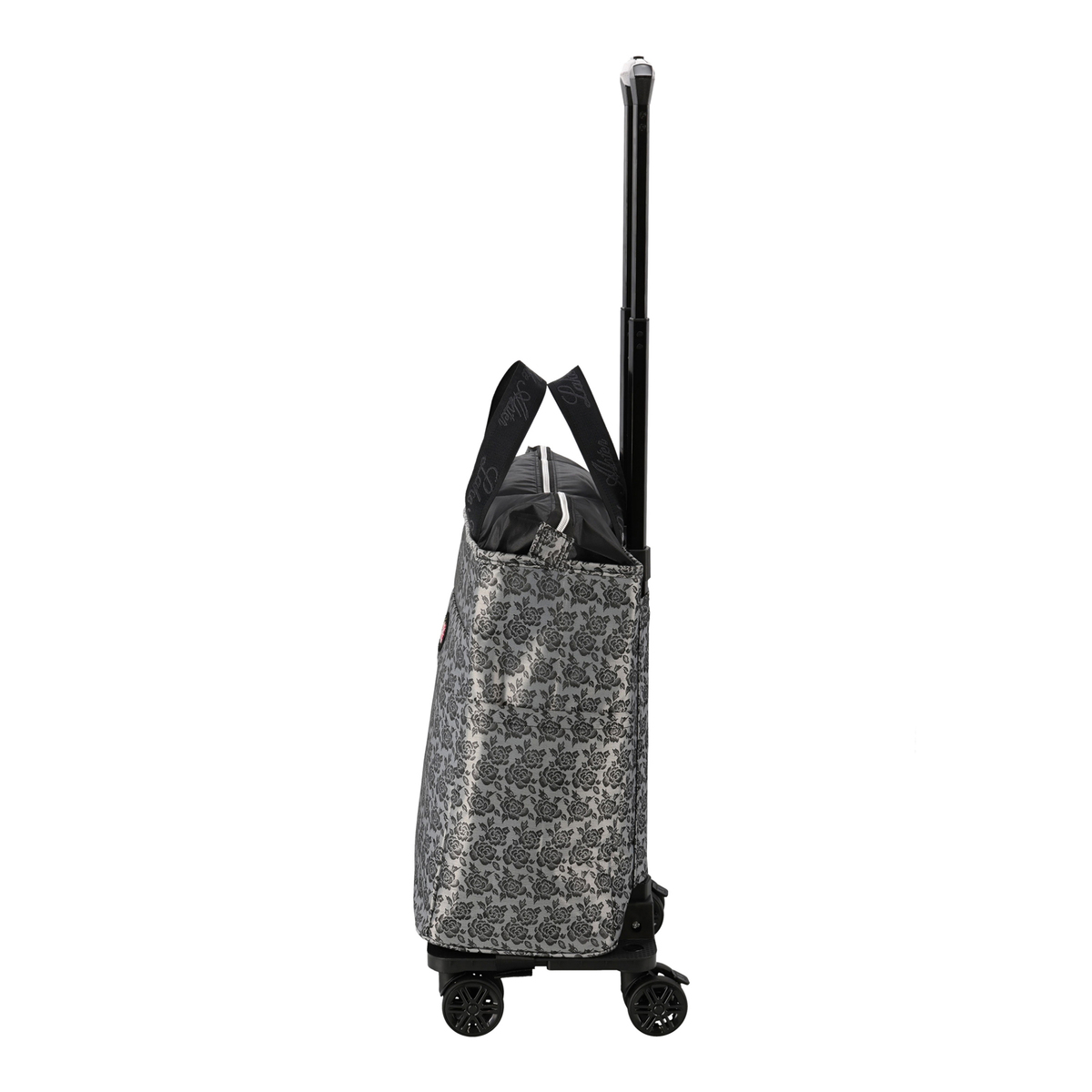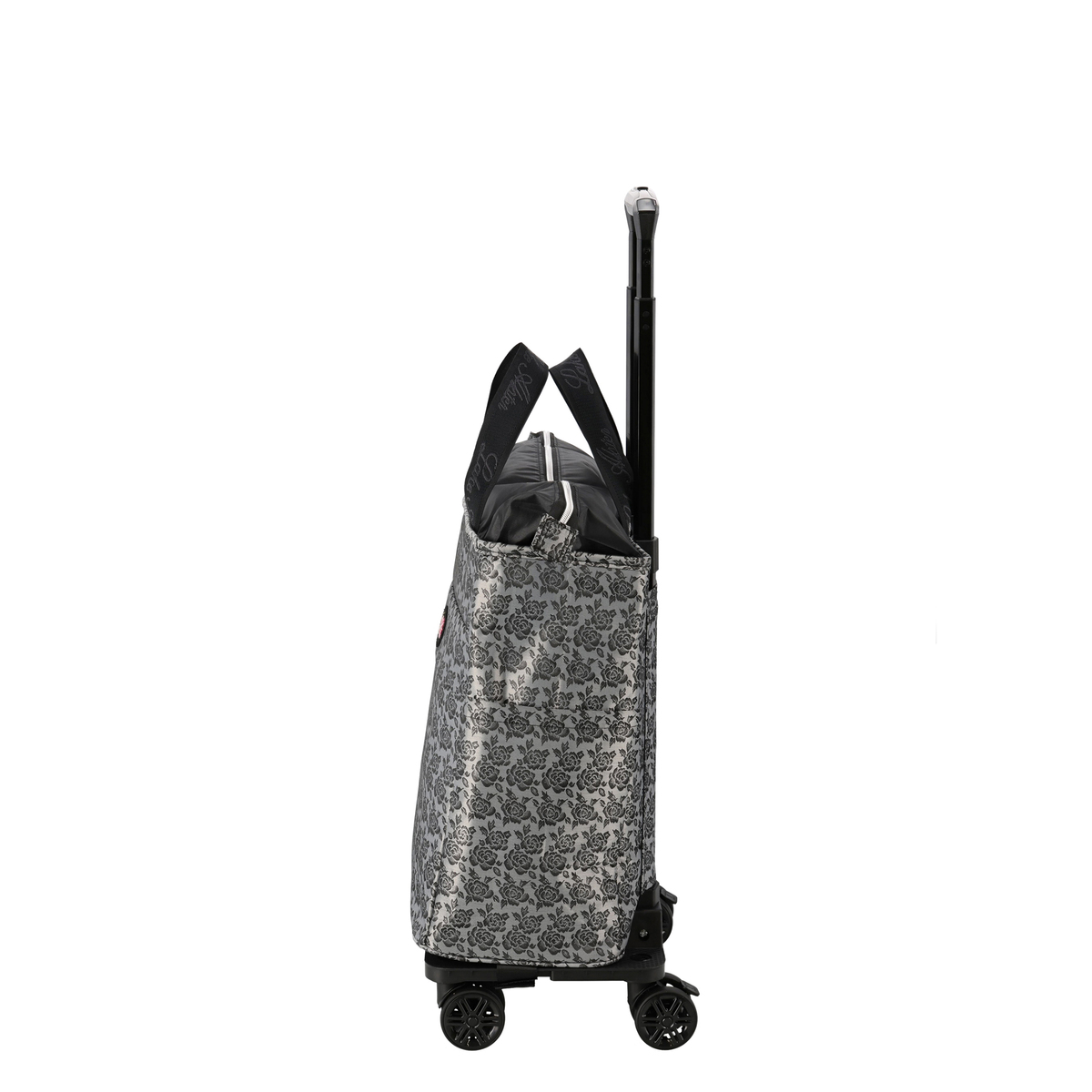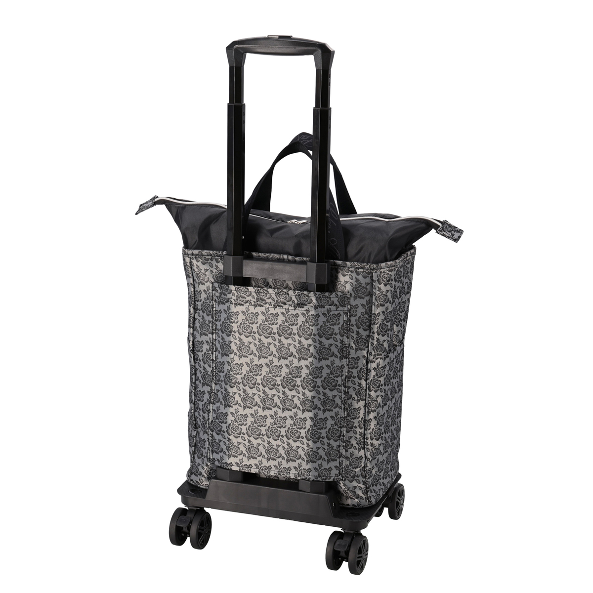 ローズのジャカード織が目を惹く4輪カート。さらにローズ柄のシェニール織りワッペンもあしらいポイントに。四輪可動式タイヤで安定感があり、スムーズに移動できます