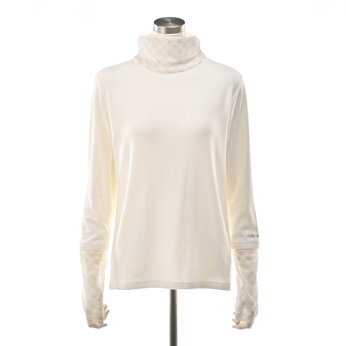 ハイネックが首周りを暖かくカバー。袖のチュール部分は長めに生地を取ることで、くしゅっと感を演出しています。レイヤードのポイントとして着回しやすい配色に仕上げました