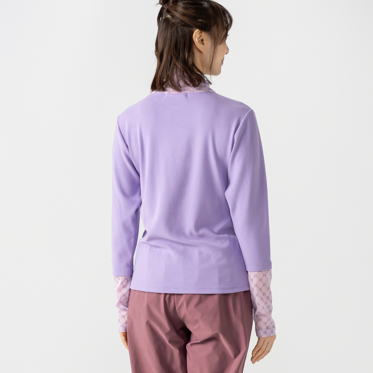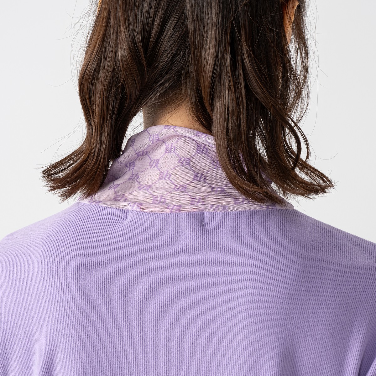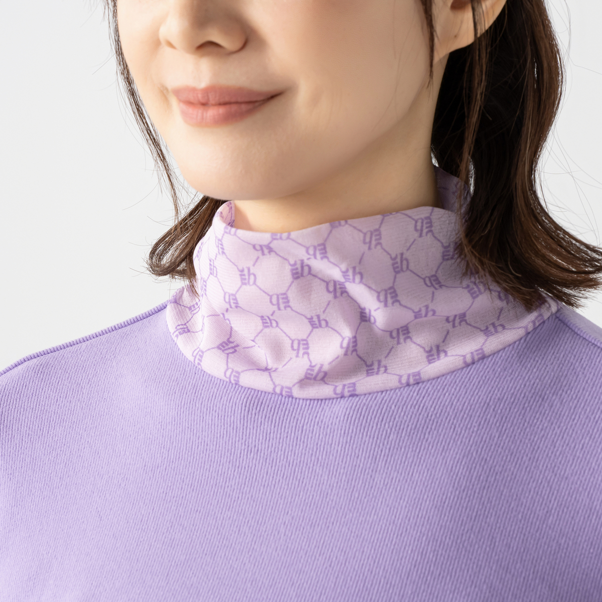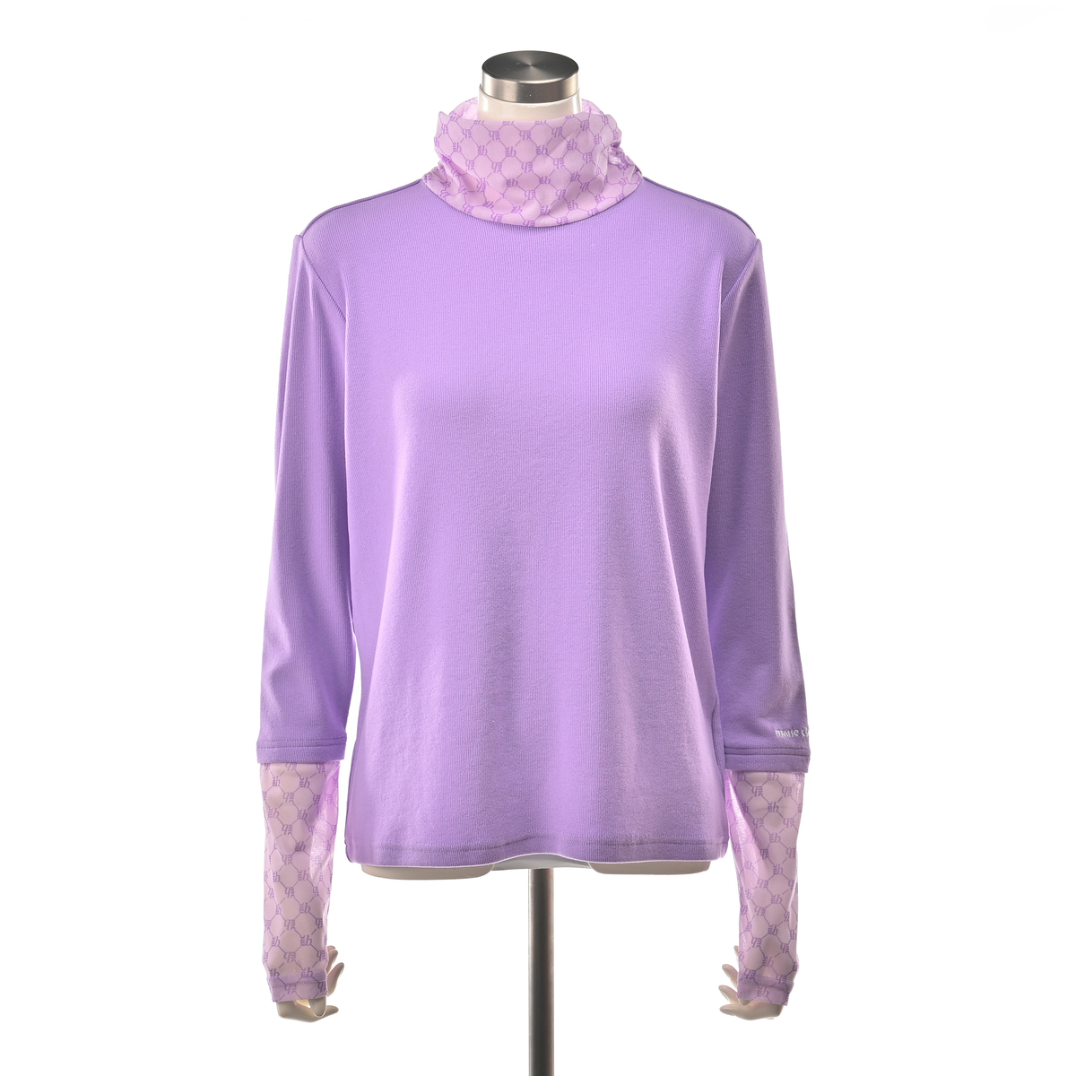 配色使いがポイントのシアーハイネックインナートップス。本体は微起毛のリブニット生地で、ふんわり滑らかで肌触りが良く快適です。首元と手首部分はチュールレースを使用して華やかな印象をプラス。UVカットの生地を使用しています