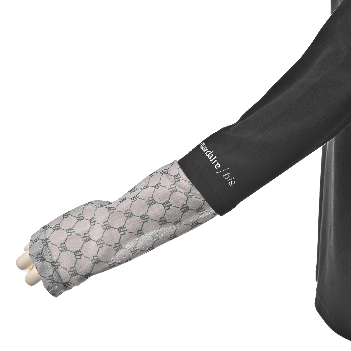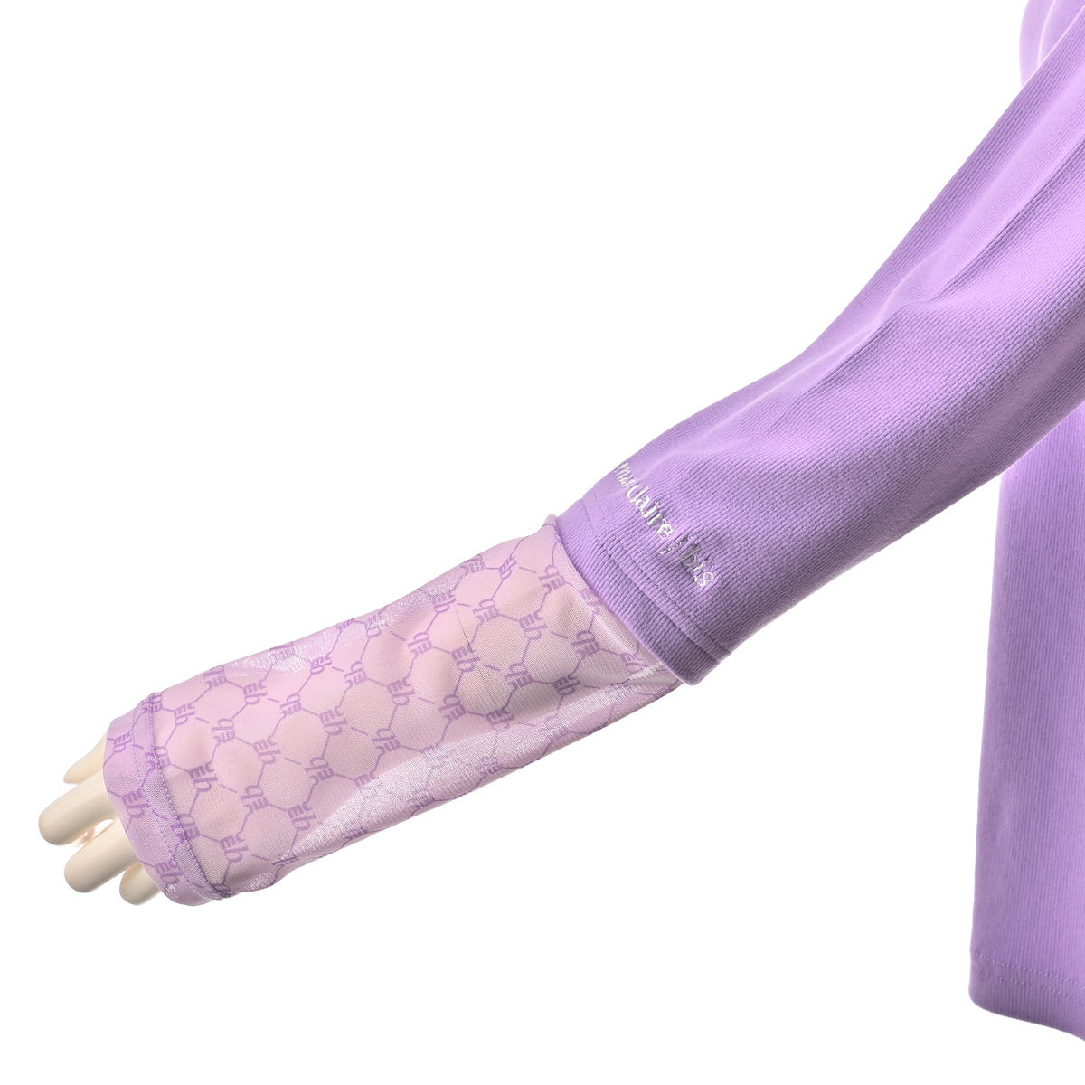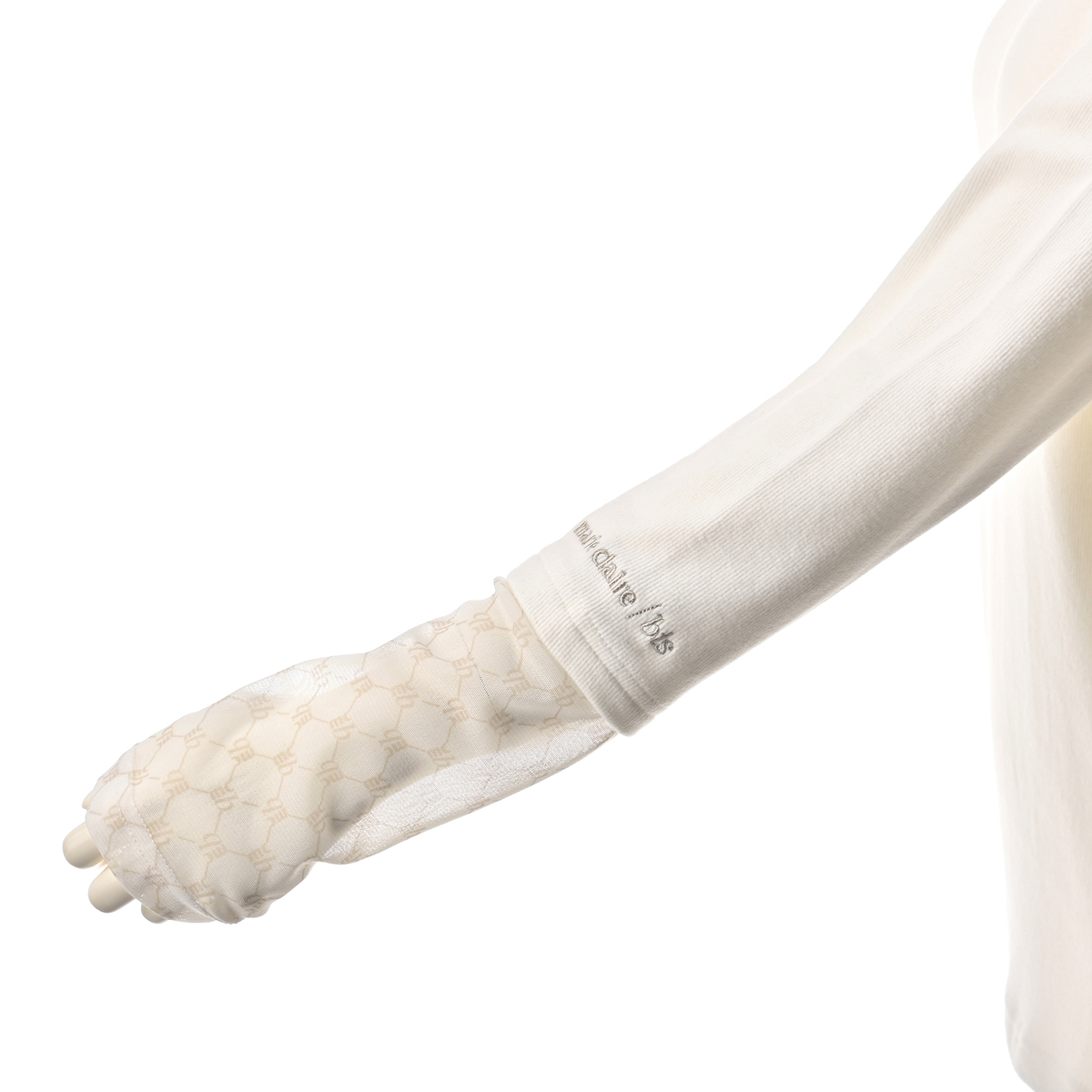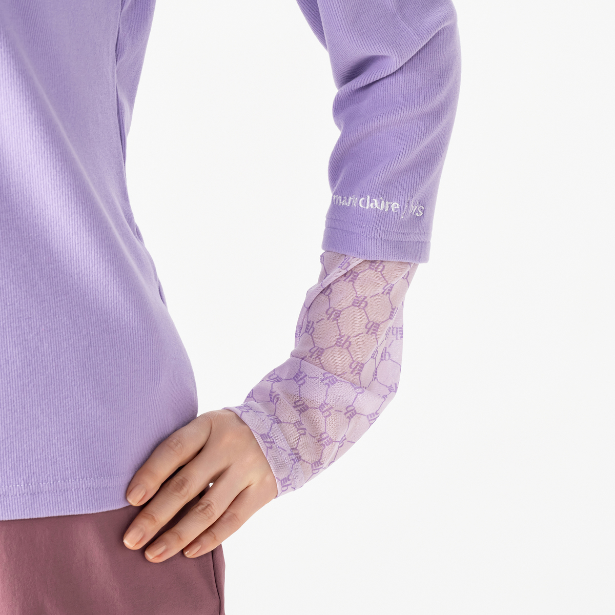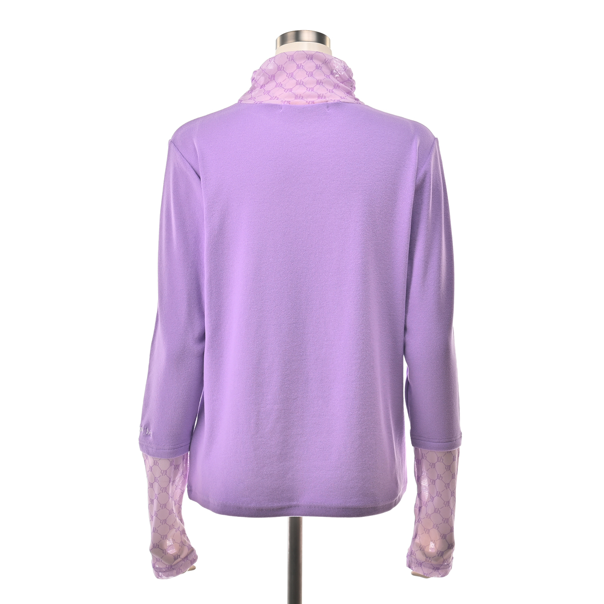 配色使いがポイントのシアーハイネックインナートップス。本体は微起毛のリブニット生地で、ふんわり滑らかで肌触りが良く快適です。首元と手首部分はチュールレースを使用して華やかな印象をプラス。UVカットの生地を使用しています