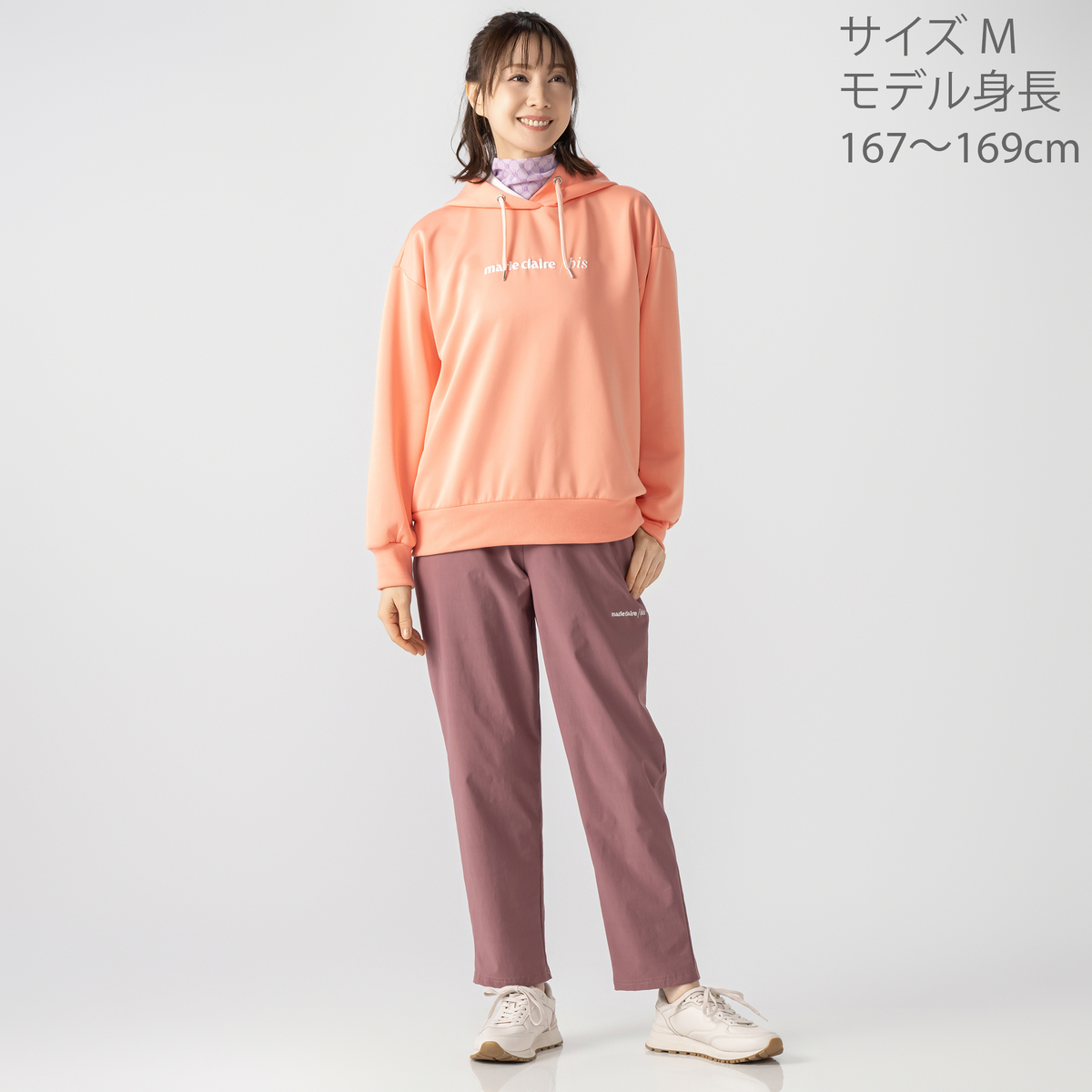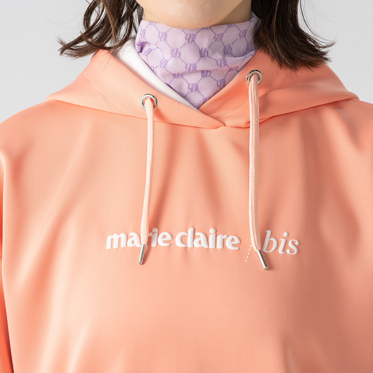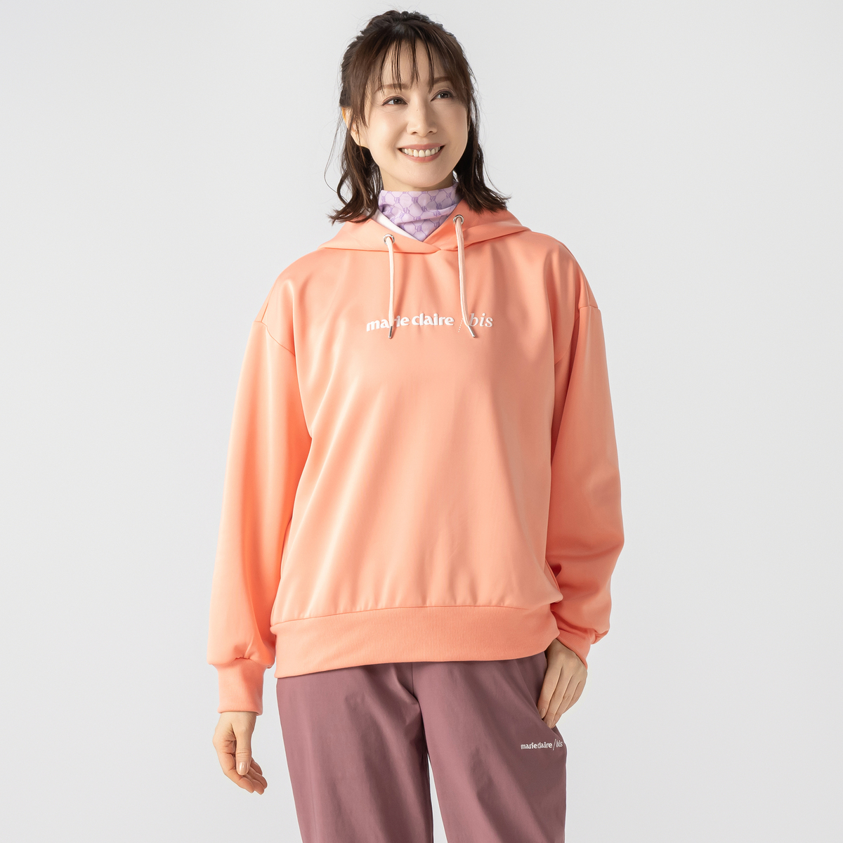 marie claire/bisのフーディプルオーバー。フード裏の配色が顔周りを明るく見せてくれます