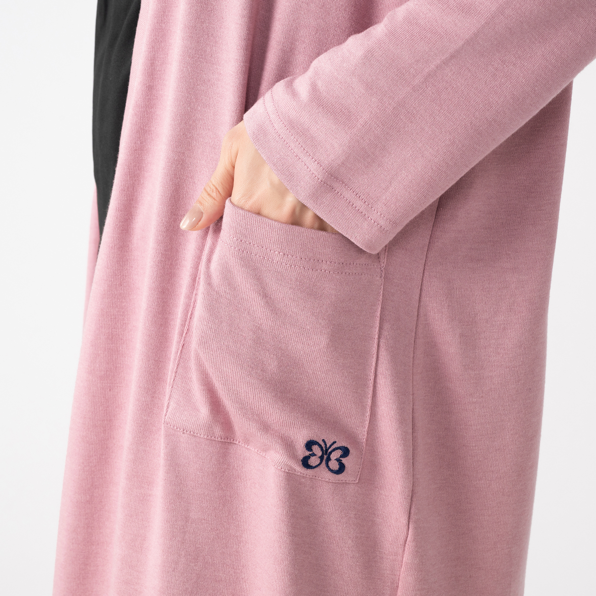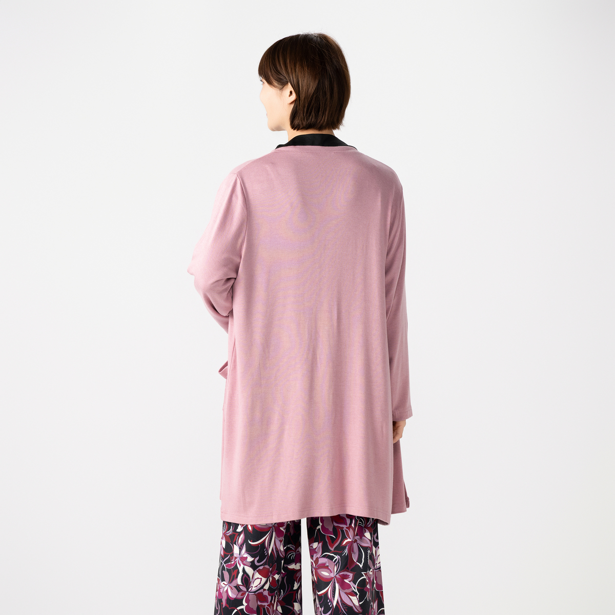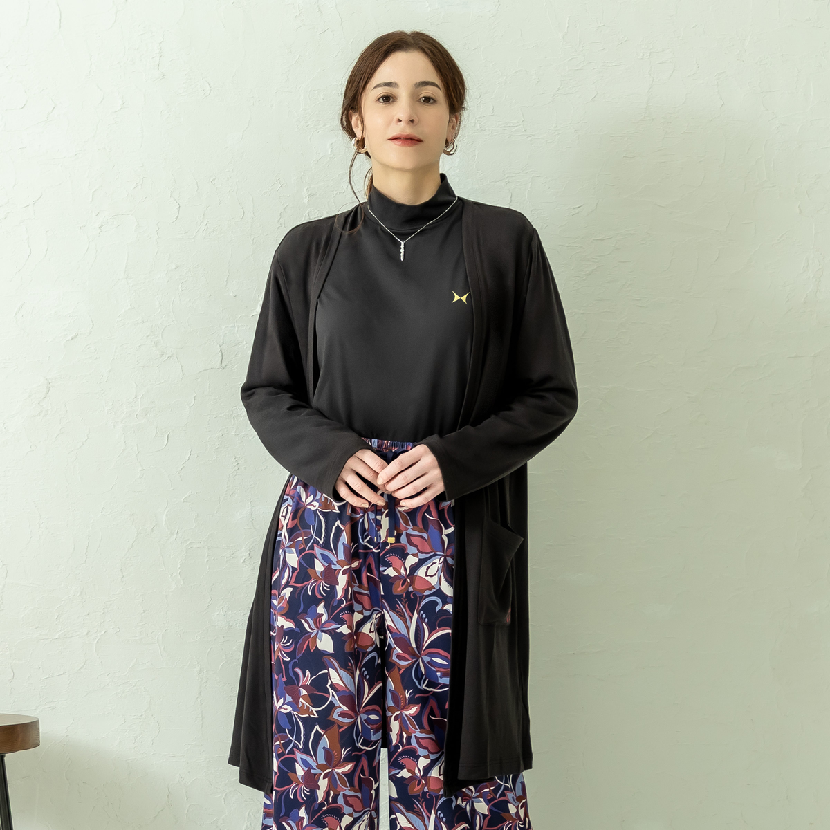 素材の落ち感を活かしたゆったりとした身幅に、着物のような前合わせを重ねたパターン設計。膝上までの長めの丈が、気になる体型を自然にカバーしながら、お腹・ヒップ・太ももの冷え対策にも役立ちます