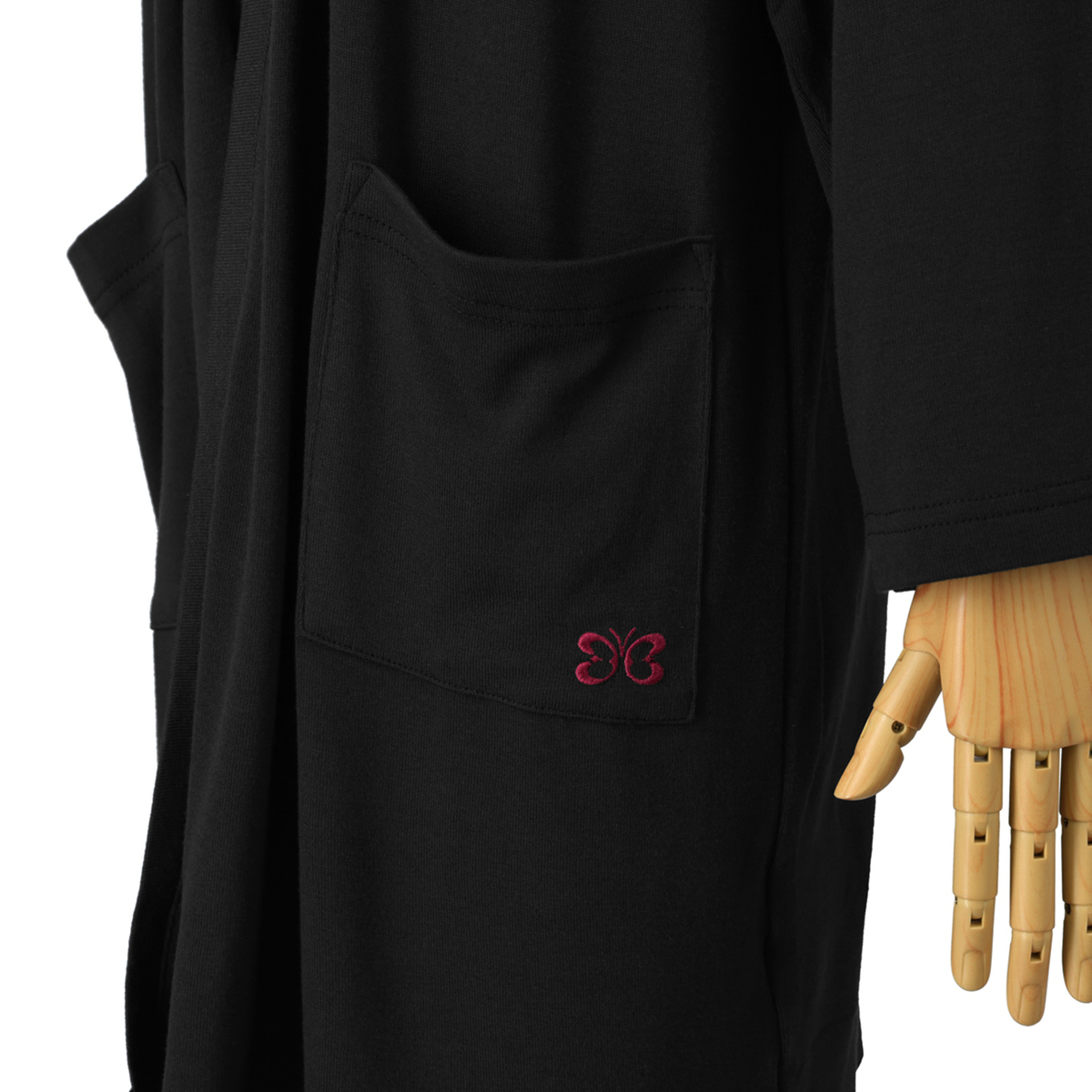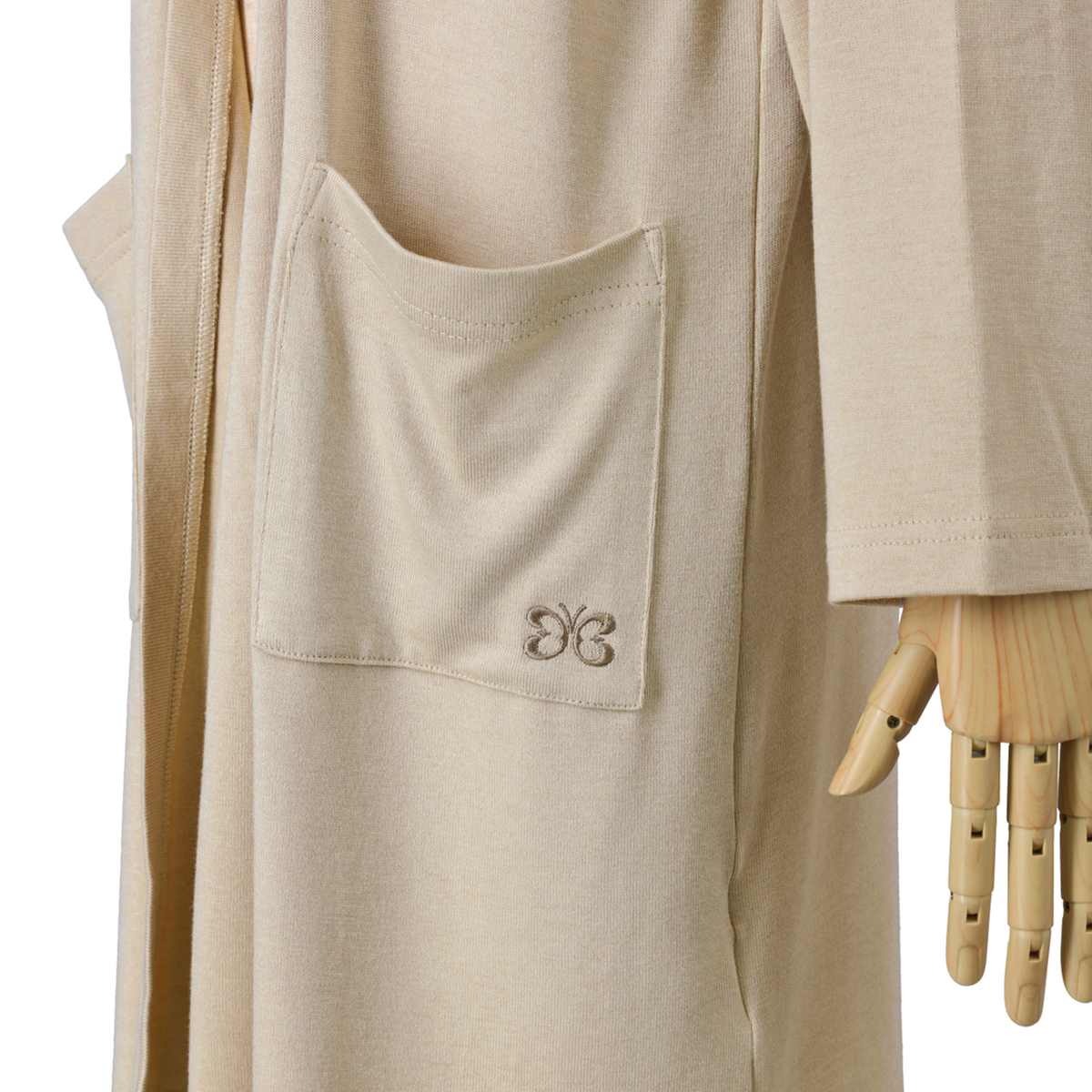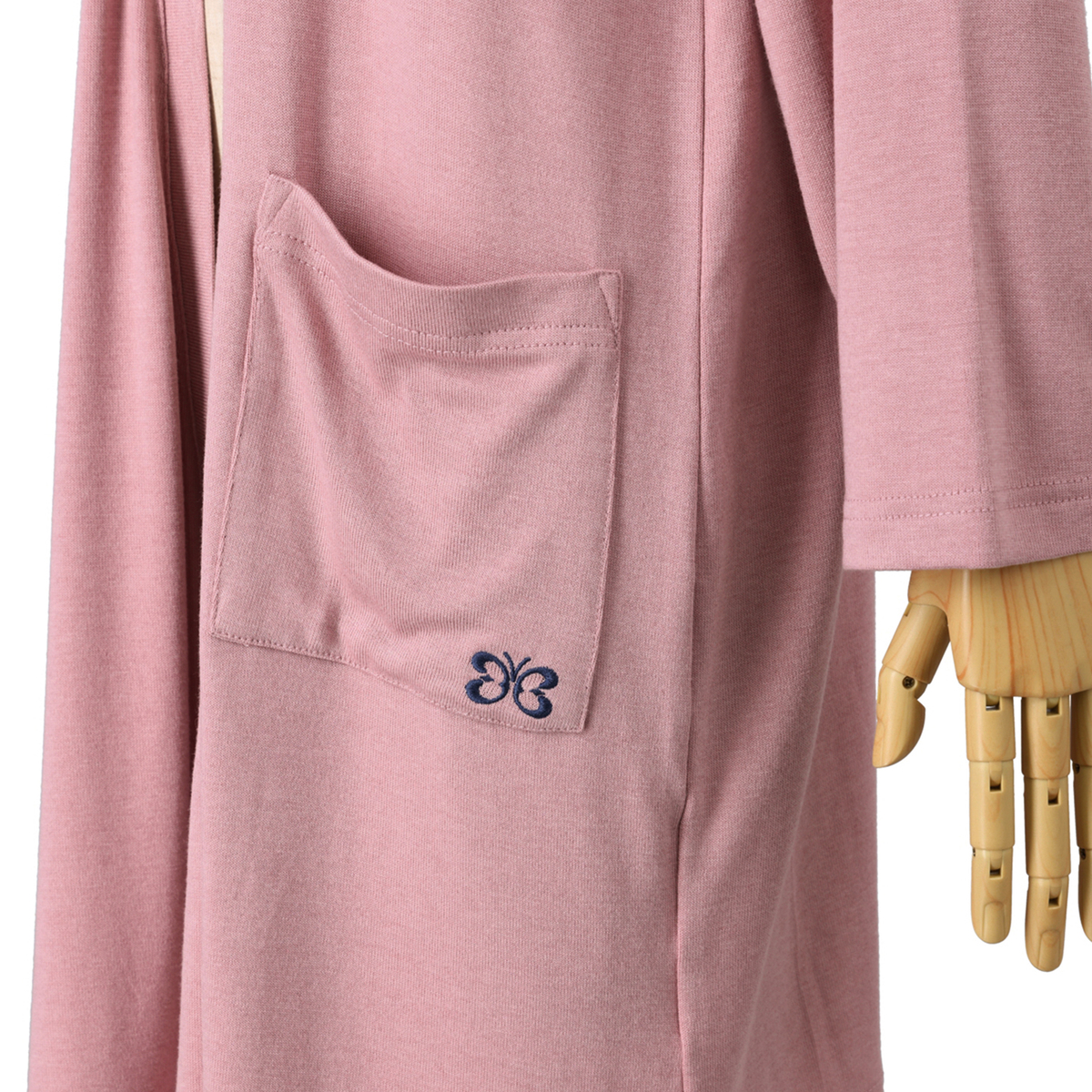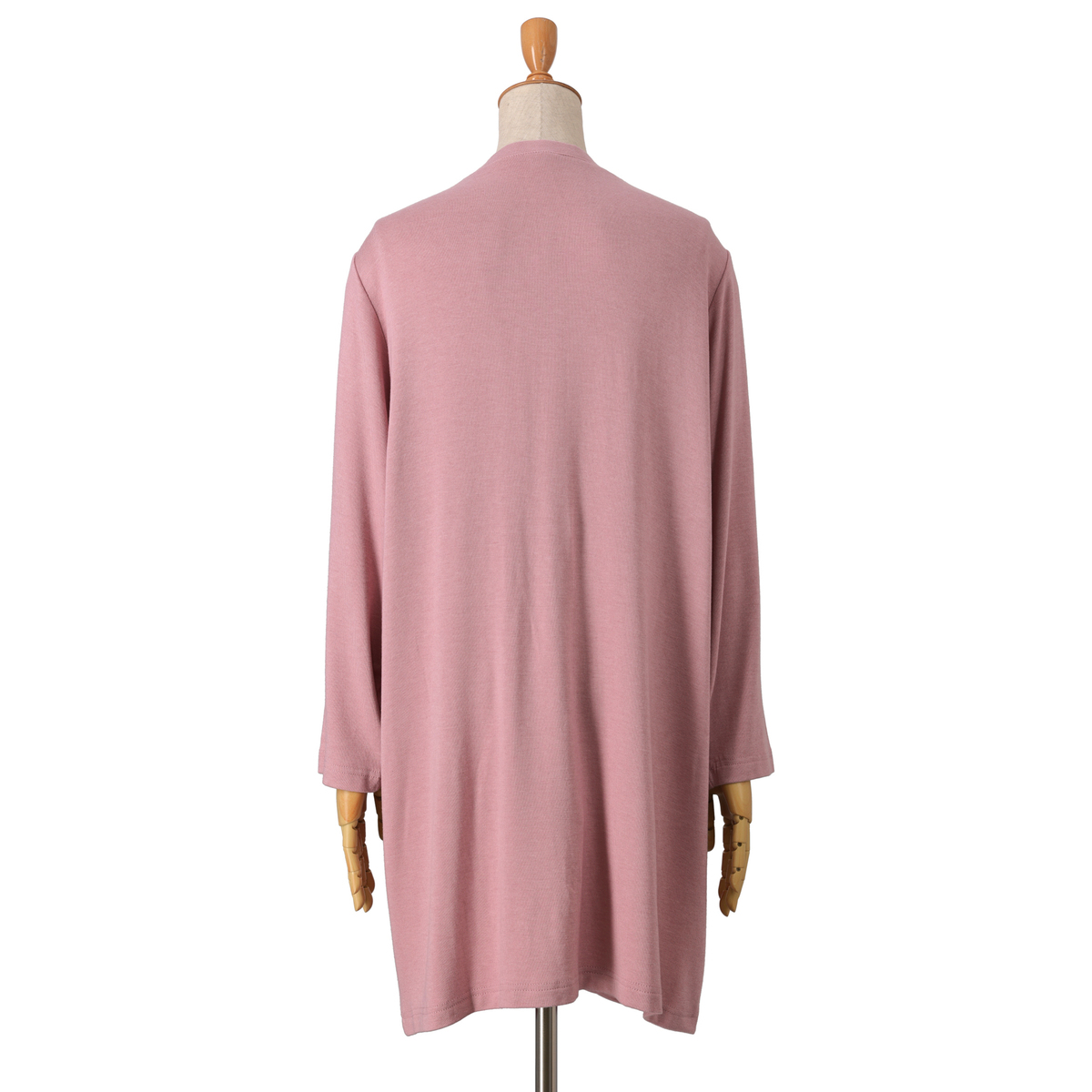 素材の落ち感を活かしたゆったりとした身幅に、着物のような前合わせを重ねたパターン設計。膝上までの長めの丈が、気になる体型を自然にカバーしながら、お腹・ヒップ・太ももの冷え対策にも役立ちます