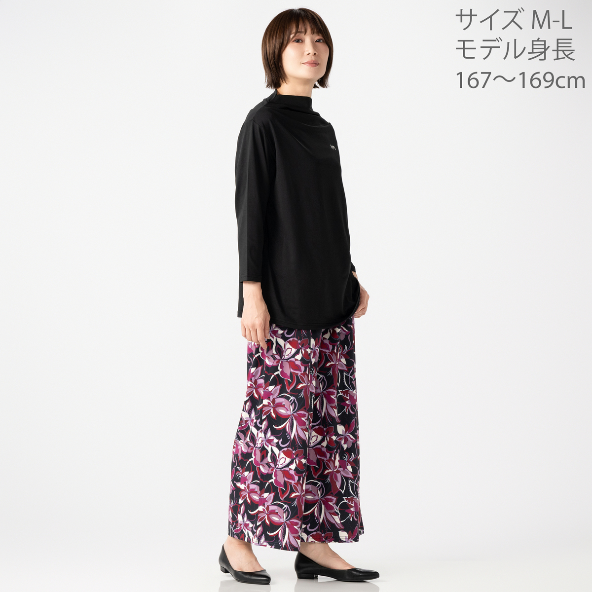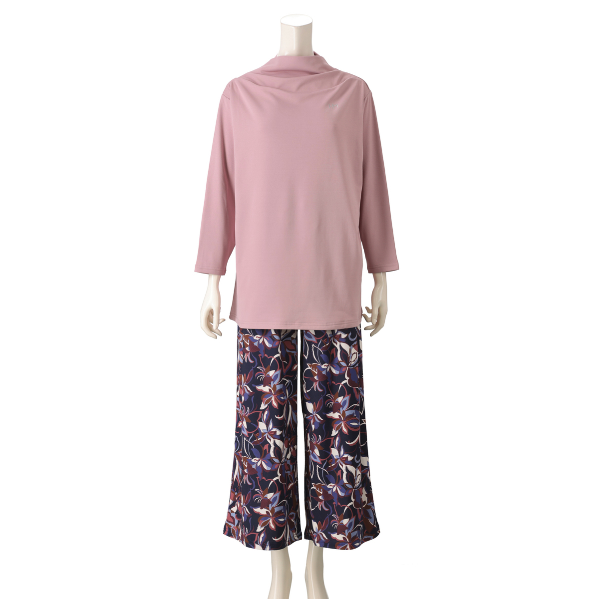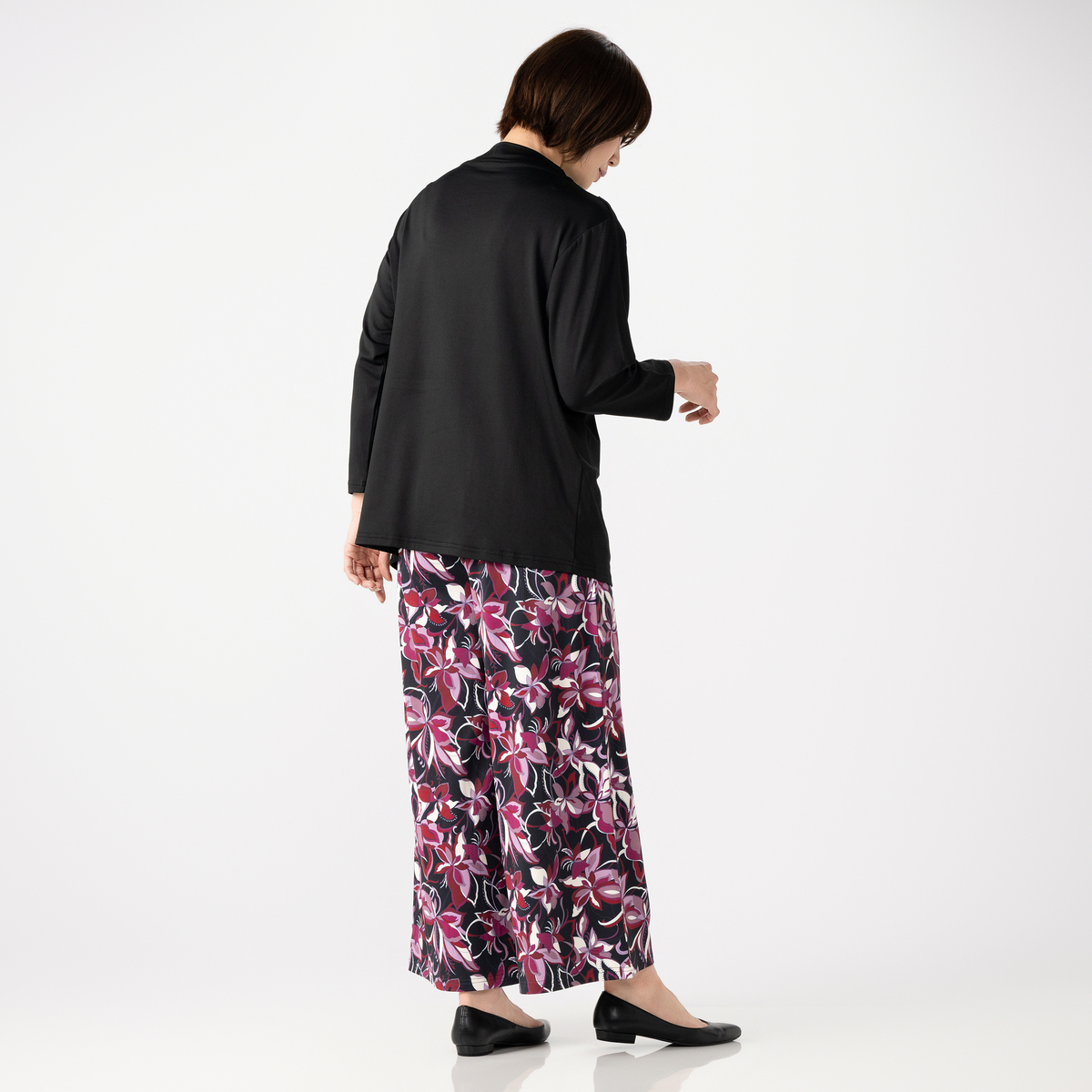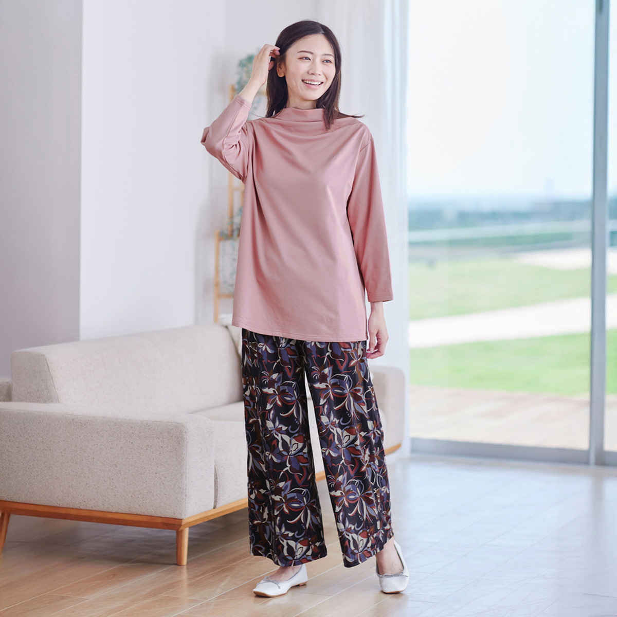 上下は同素材で、表側はつるんとして上品な光沢感があり、裏側微起毛の暖かみを感じられるカットソーを使用。縦横斜めによく伸びて、身体を動かしやすく長時間快適な着心地。楽な着心地なのに気品あるスタイルが完成します