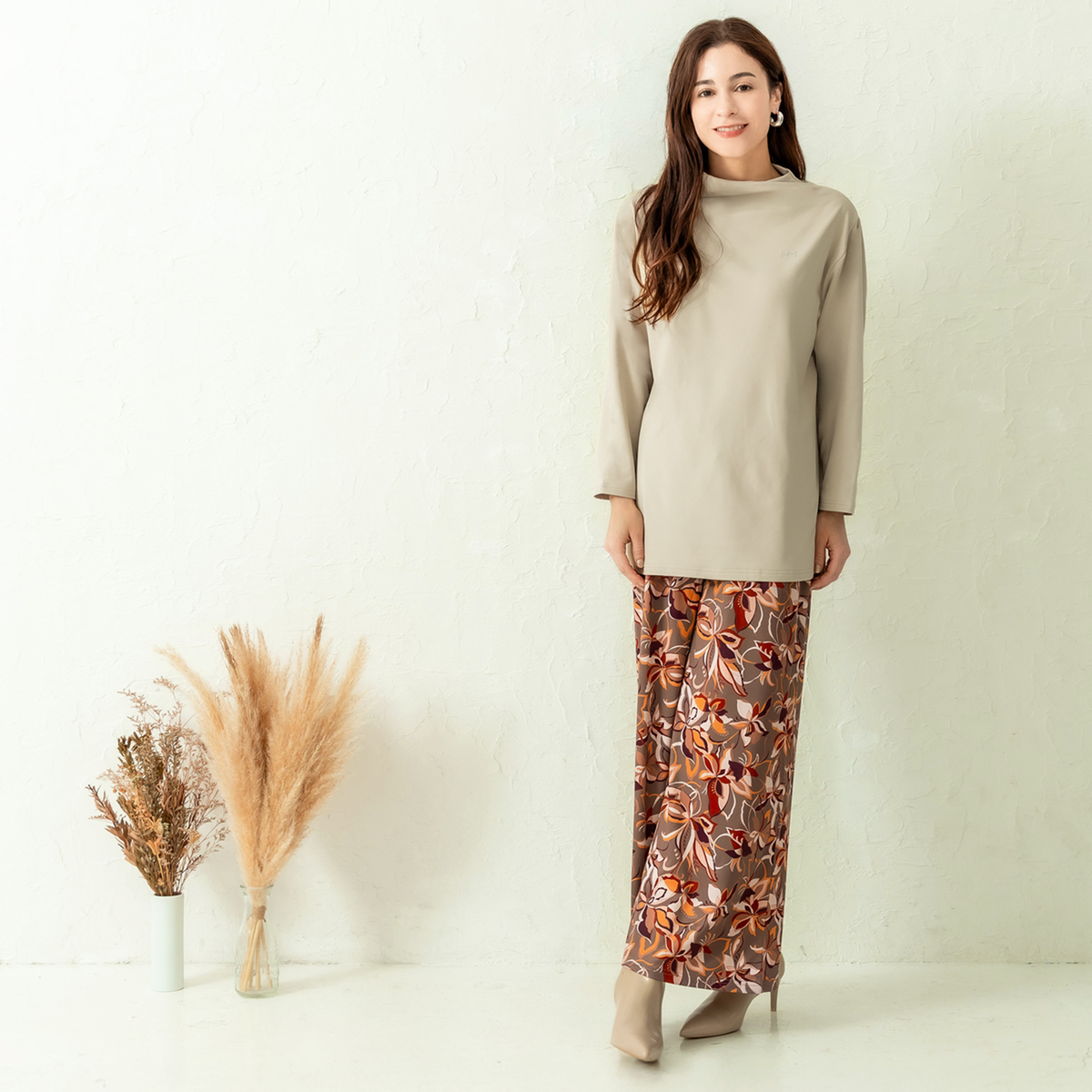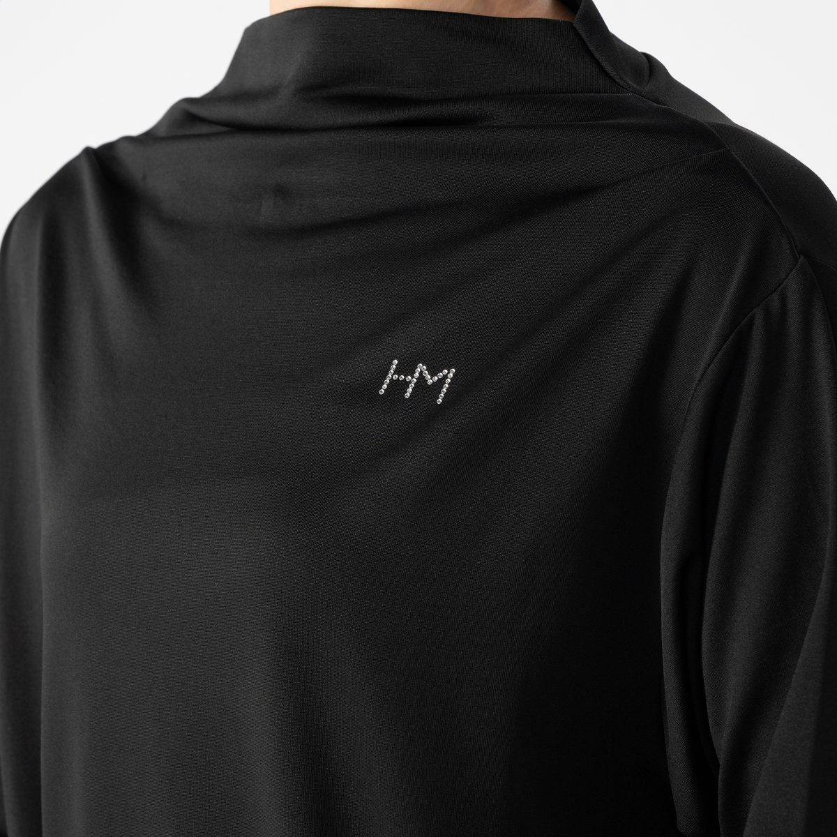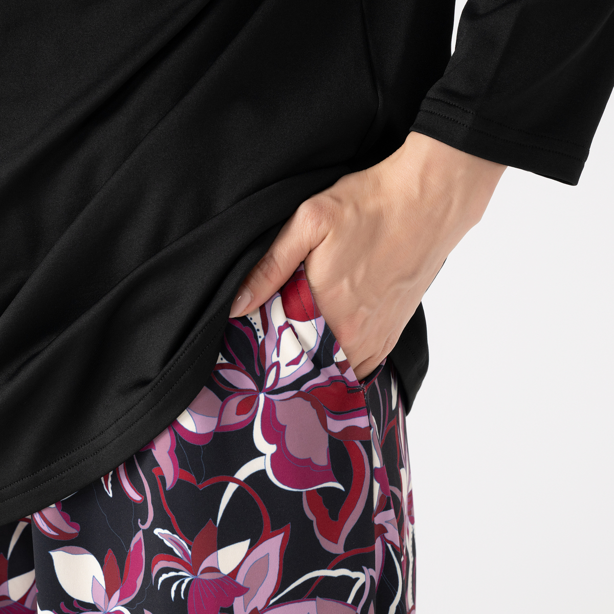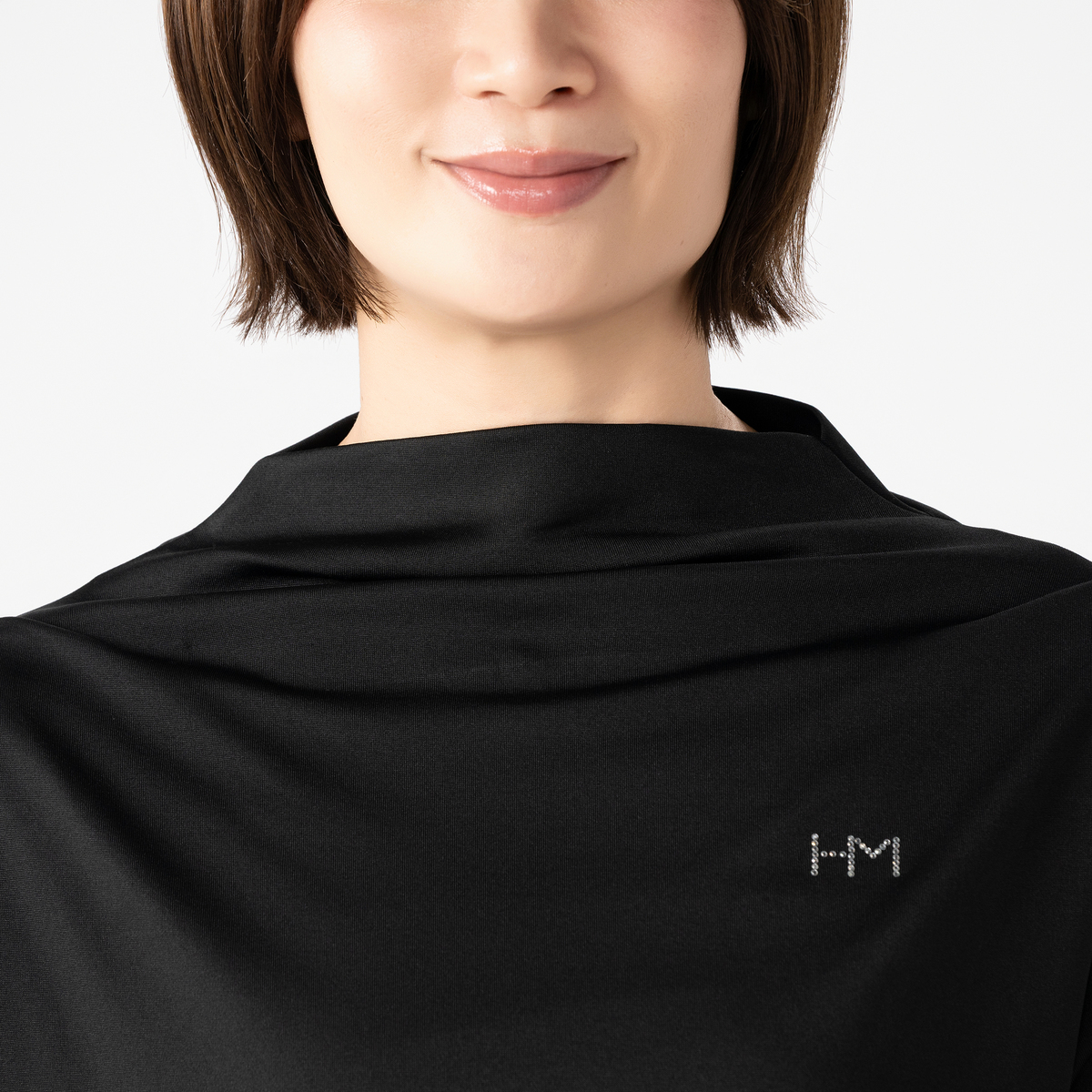 上下は同素材で、表側はつるんとして上品な光沢感があり、裏側微起毛の暖かみを感じられるカットソーを使用。縦横斜めによく伸びて、身体を動かしやすく長時間快適な着心地。楽な着心地なのに気品あるスタイルが完成します