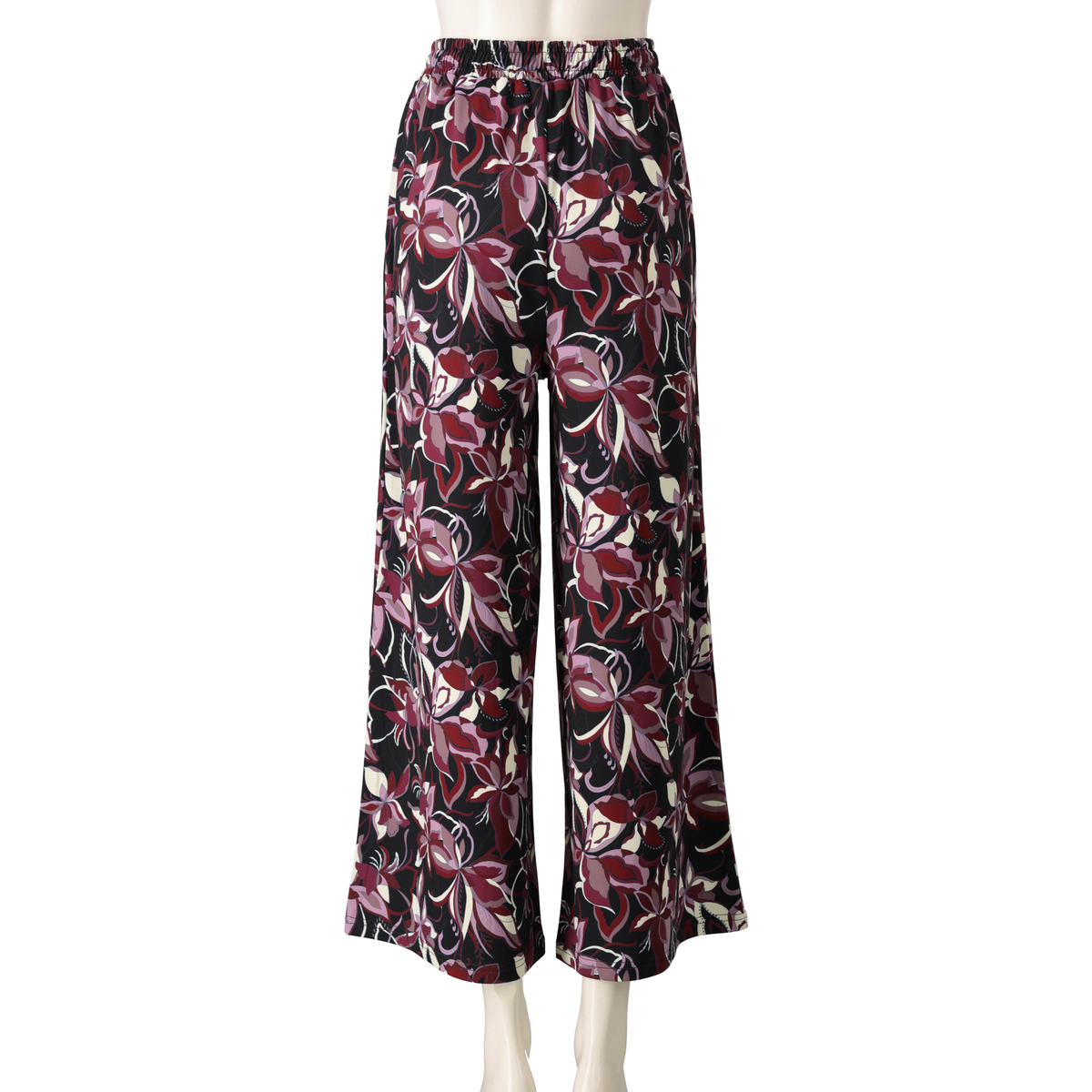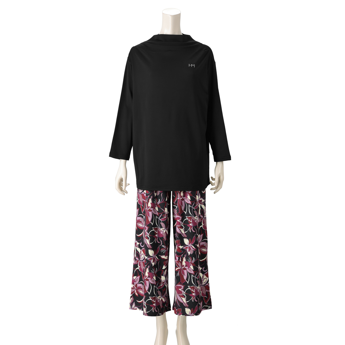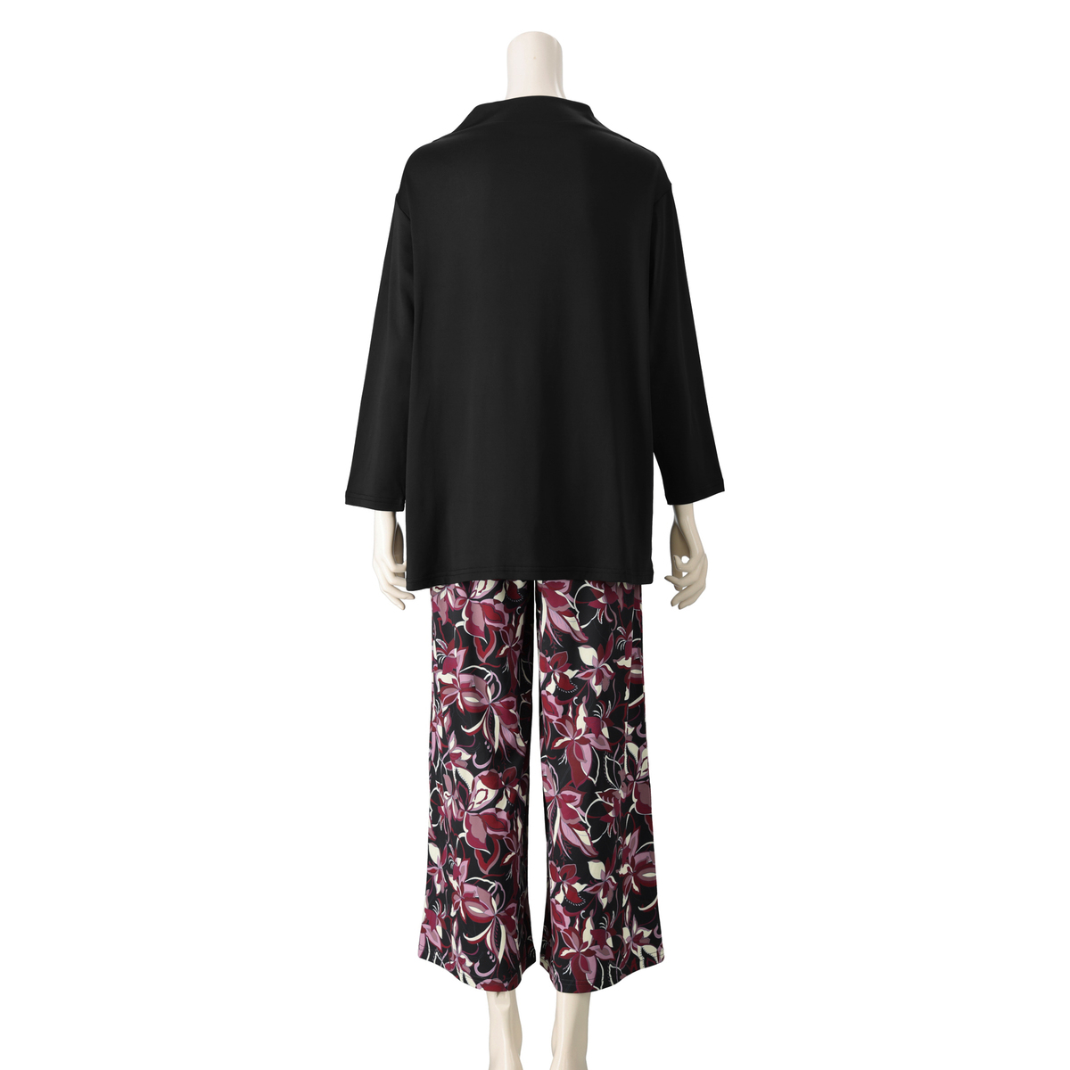 エレガントで上品、そして東洋のエッセンスなどHANAE MORIらしさを詰め込んだ上下セットです。蝶や花をあしらったパンツの総柄プリントが印象的で、シンプルなトップスの左胸にはジルコンであしらったロゴマークが煌めきます。リラックスシーンだけでなく、会食、ドライブ、旅行などで活躍します