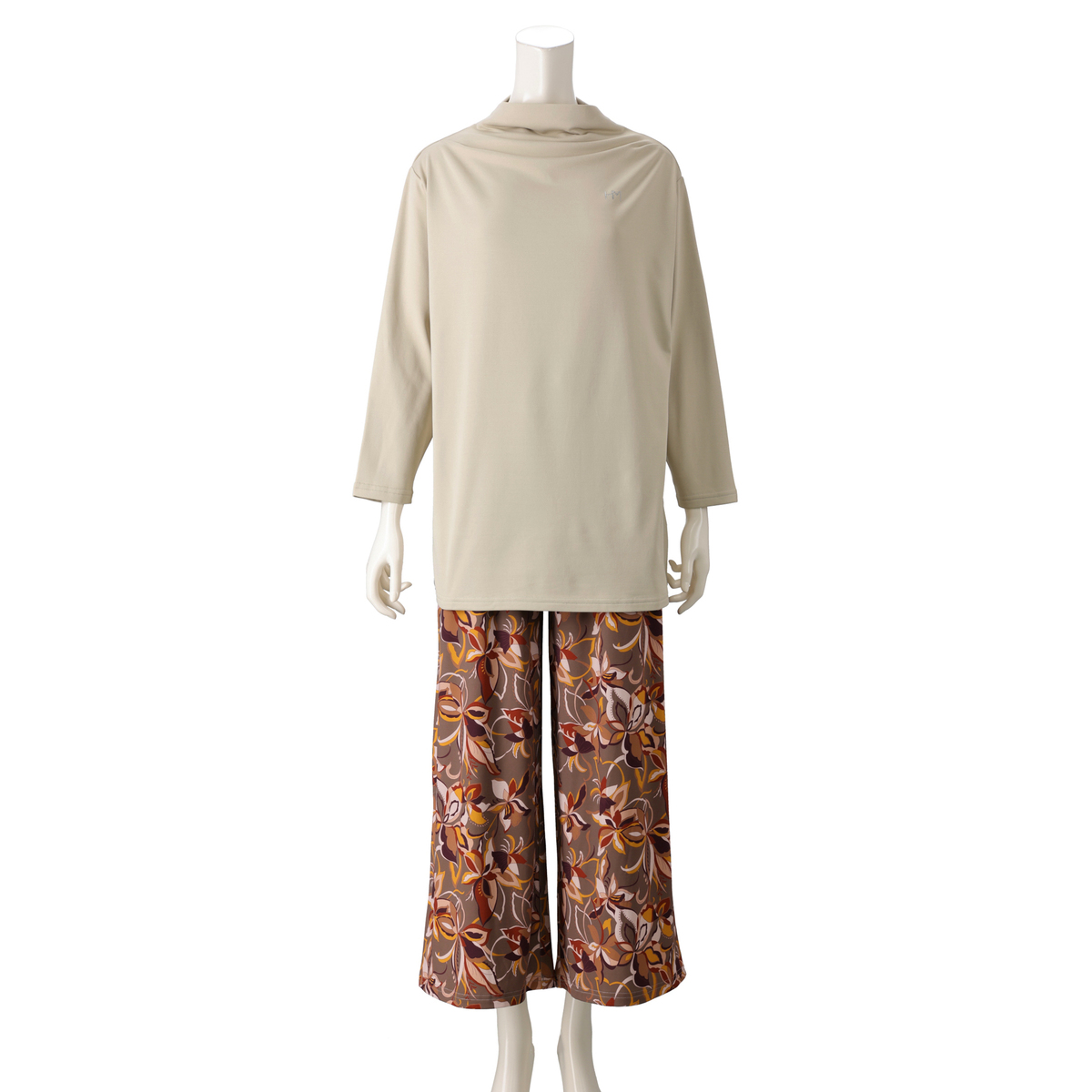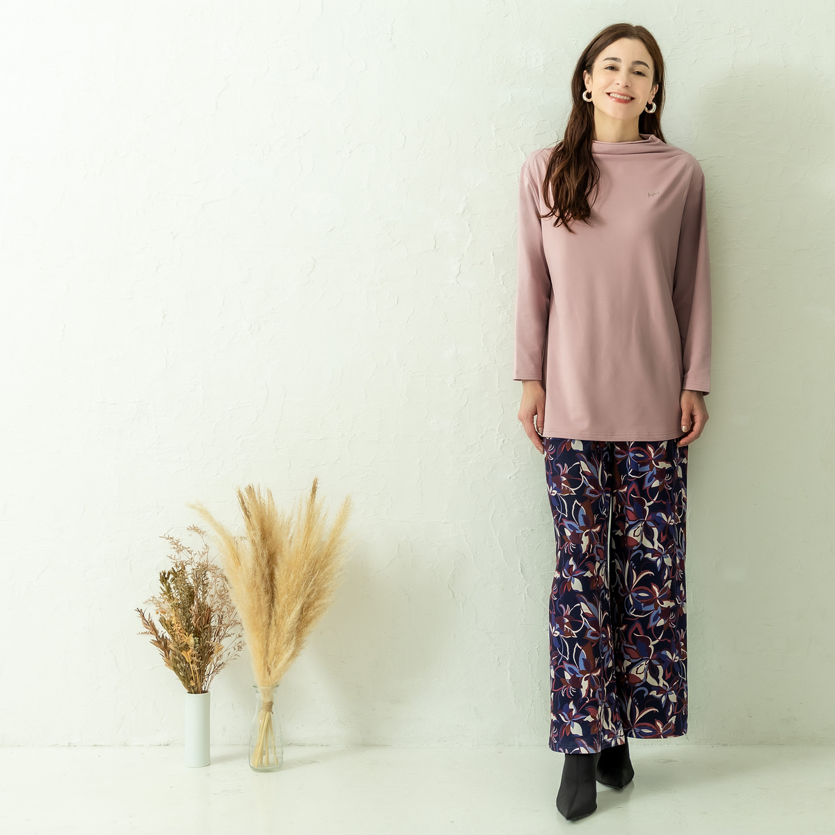 トップスは、ゆとりのある身幅と袖幅でボディラインも目立ちにくく二の腕もカバー。こだわりの少し高めのネックラインが上に視線を集め、全体的にスッキリと見えます。パンツはワイドなストレートラインで股上も深く、気になるヒップや太ももが目立ちにくいデザインです