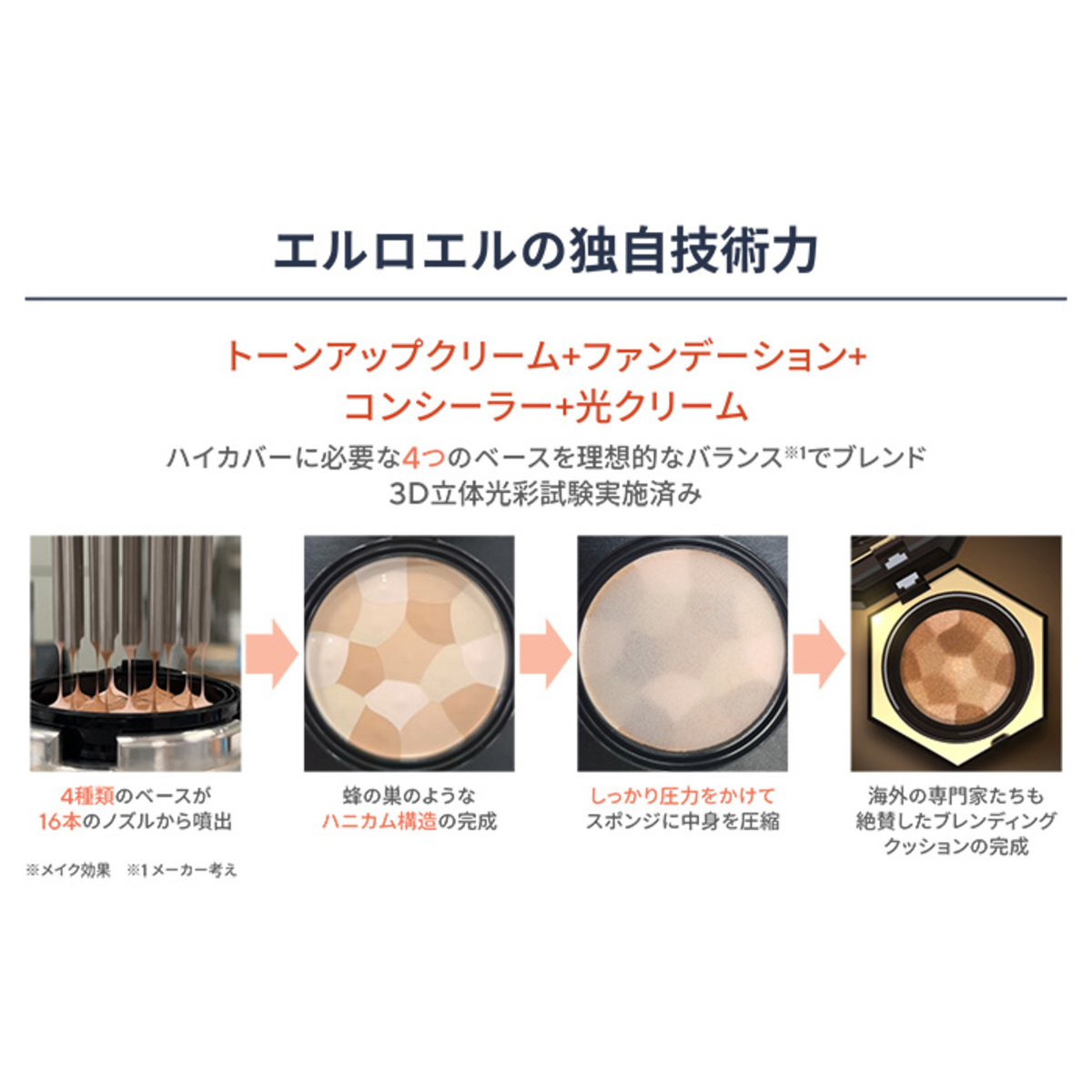 [商品内容] ・ELROEL ブレンディングクッションHD レフィル 12.5g ※SPF50+/PA+++ [使用方法] パフをクッション部分にぐっと押し当てて、ファンデを染み込ませます。肌にポンポンとスタンプを押すイメージで塗ります [注意事項] ※お肌に異常が生じていないかよく注意して使用してください。化粧品がお肌に合わないとき即ち次のような場合には、使用を中止してください。そのまま化粧品類の使用を続けますと、症状を悪化させることがありますので、皮膚科専門医等にご相談されることをおすすめします 1.使用中、赤み、はれ、かゆみ、刺激、色抜け(白斑等)や黒ずみ等の異常があらわれた場合 2.使用したお肌に、直接日光があたって上記のような異常があらわれた場合(2)傷やはれもの、しっしん等、異常のある部位にはお使いにならないでください ※使用後は必ずしっかり蓋をしめてください ※乳幼児の手の届かないところに保管してください ※極端に高温又は低温の場所、直射日光のあたる場所には保管しないでください 【韓国製】 [成分] 水、酸化チタン、シクロペンタシロキサン、BG、メトキシケイヒ酸エチルヘキシル、安息香酸アルキル(C12-15)、セチルPEG/PPG-10/1ジメチコン、サリチル酸エチルヘキシル、パラメトキシケイヒ酸イソアミル、カプリリルメチコン、シクロヘキサシロキサン、ナイアシンアミド、ビスエチルヘキシルオキシフェノールメトキシフェニルトリアジン、 トリメチルシロキシケイ酸、塩化Na、1,2-ヘキサンジオール、酸化鉄、(ビニルジメチコン/メチコンシルセスキオキサン)クロスポリマー、セスキオレイン酸ソルビタン、ポリフェニルシルセスキオキサン、合成ミツロウ、キャビアエキス、ジステアルジモニウムヘクトライト、 マイカ、(VP/ヘキサデセン)コポリマー、ジメチコン、アルミナ、クロルフェネシン、トリヒドロキシステアリン、DPG、ヒドロキシアセトフェノン、ビニルジメチコン、ポリプロピルシルセスキオキサン、カプリリルグリコール、炭酸プロピレン、香料、アデノシン、トリエトキシカプリリルシラン、酸化スズ、シリカ、ジメチコノール、EDTA-2Na、ポリメチルシルセスキオキサン、メタクリル酸メチルクロスポリマー、 ポリメタクリル酸メチル、ヒアルロン酸、水酸化Al、グリセリン、サッカロミセス/コメ発酵液、グリセリルグルコシド、グリチルリチン酸2K、マルトデキストリン、アボカドエキス、ハイドロゲンジメチコン、 トリ(カプリル酸/カプリン酸)グリセリル、水添ホスファチジルコリン、マコンブエキス、ウルムスダビディアナ根エキス、ローヤルゼリーエキス、ツボクサエキス、ステアリン酸スクロース、アロエベラ葉エキス、スミレ花エキス、ヤマノイモ根エキス、パルミトイルトリペプチド-5、加水分解コラーゲンエキス、セテアリルアルコール、マデカッソシド、マデカシン酸、アシアチコシド、アシアチン酸