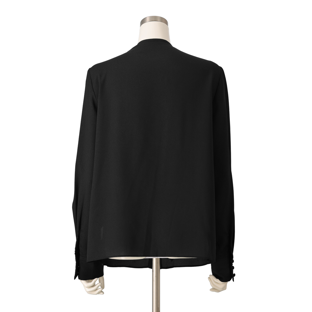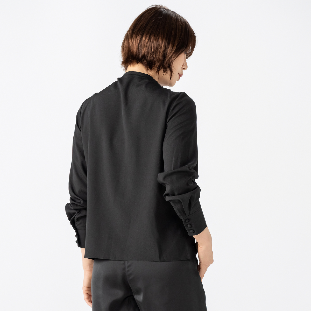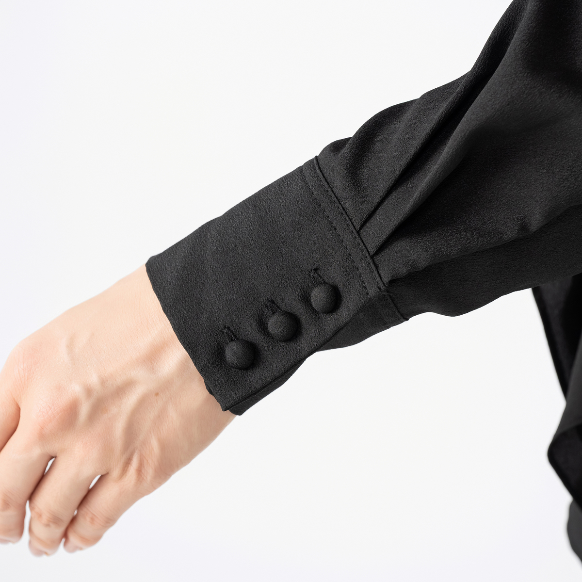 見本の写真だけを見ていたら購入しませんでした。 全くスタイリッシュではないからです。一番分かりやすい着画がリボン結びだったと思うので仕方がないのかと思いますが、マサゴさんご自身はリボン結びをなさらないとのことでしたので、よりデザイナーの想いを汲んだ着画掲載を望みます。タイを緩くひとつ結びか、垂らして着用予定です。袖のくるみボタンがクラシカルでした。ボタンの比翼仕立てがタイを垂らした時に出来るラインの邪魔をせずに、考えられていますね。