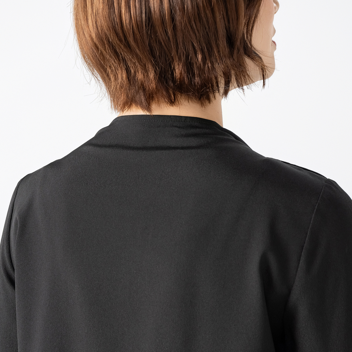このデザインなら素材がシフォンのような柔らかい素材の方がエレガントで女性らしい感じが出てオシャレだと思いました 梨地のこの素材が残念でした ボウタイも色々工夫して巻けそうでいいなあと思いましたが意外とタイがあしらいにくいので返品します
