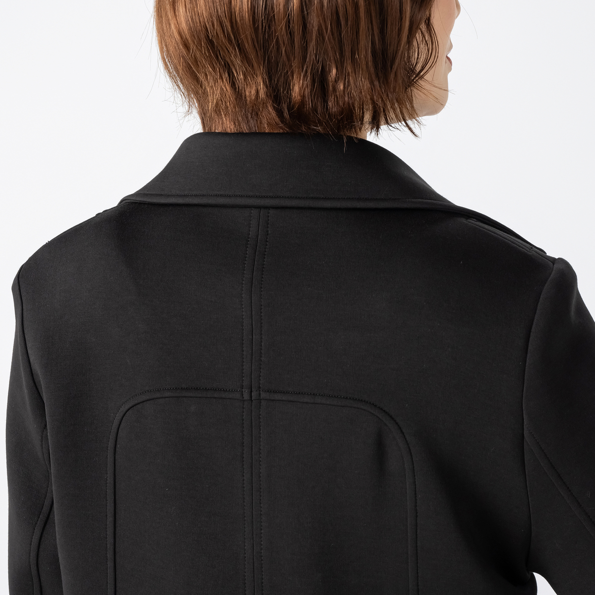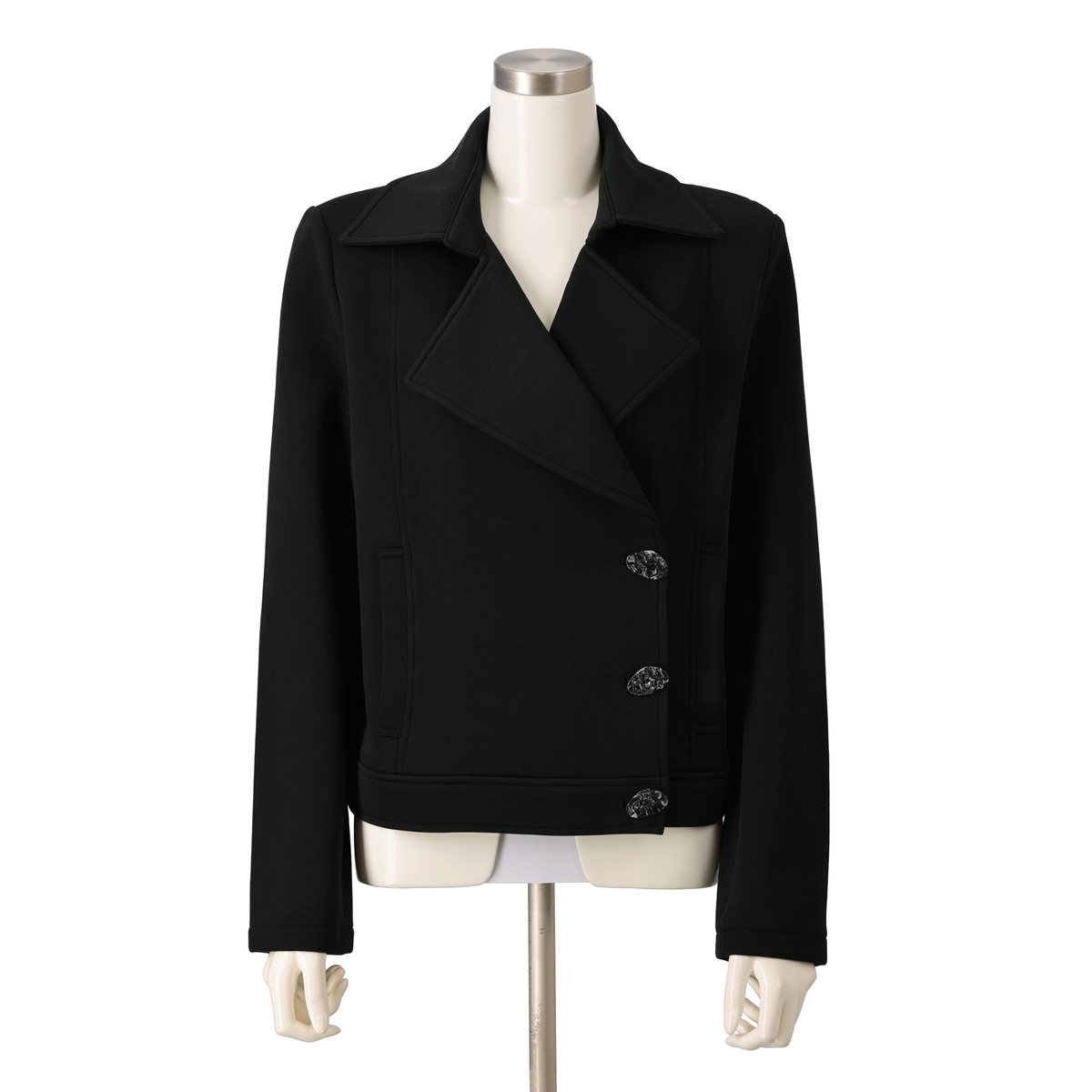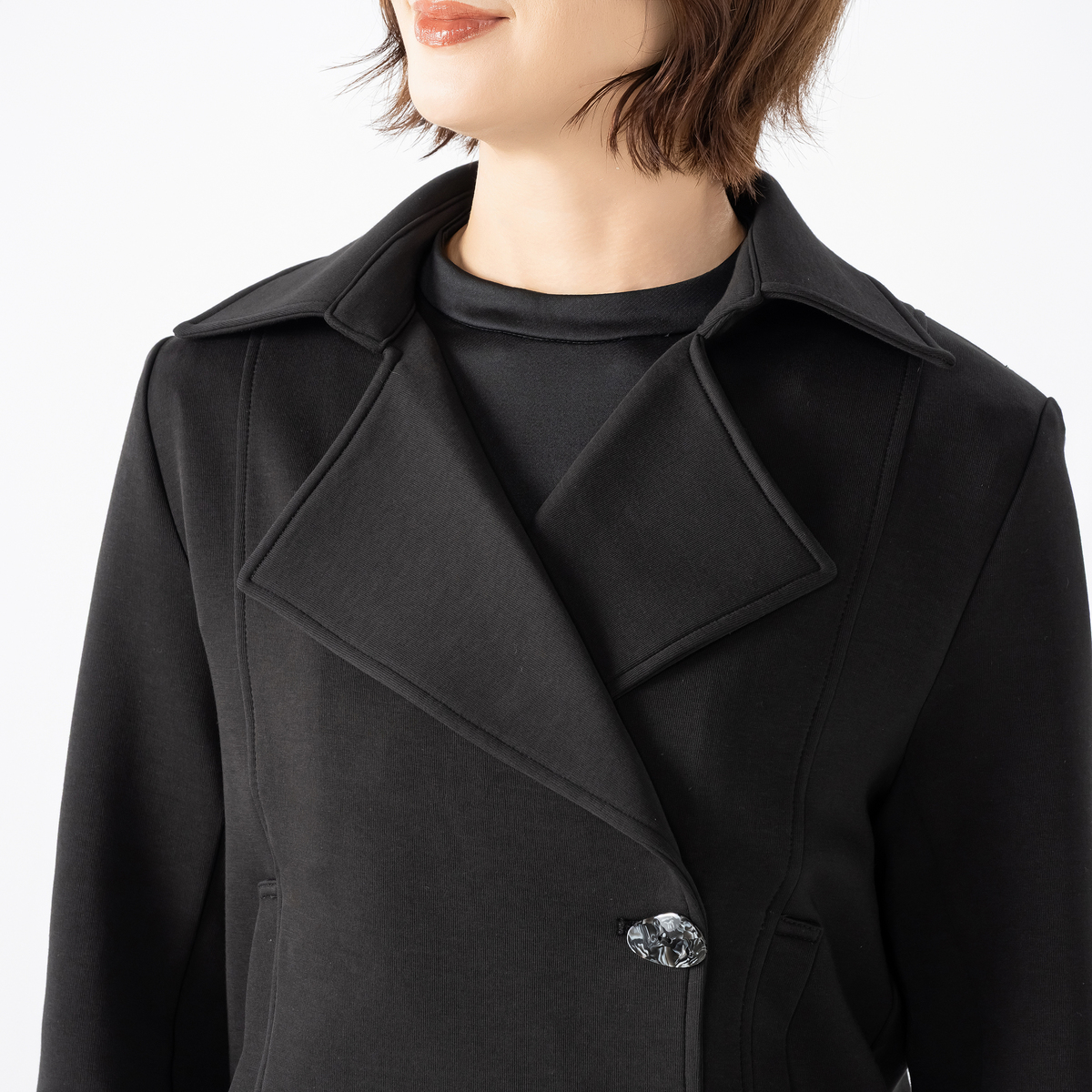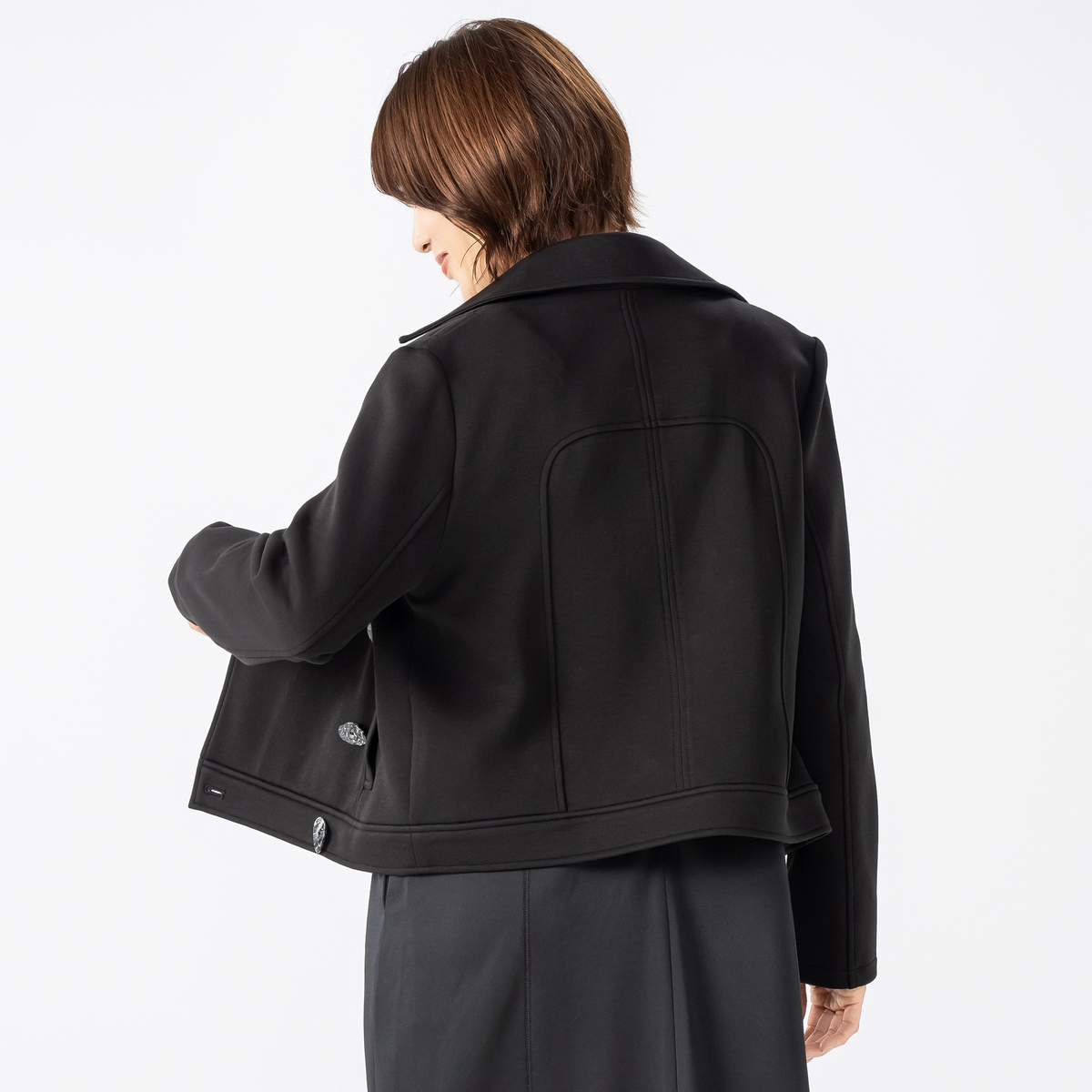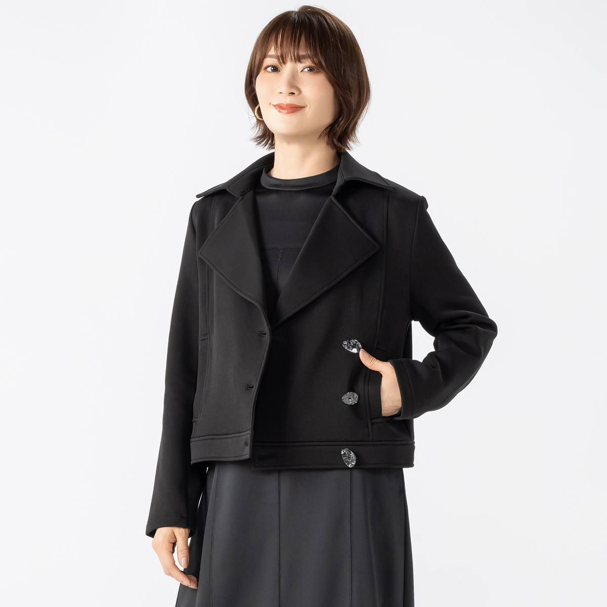大きめの衿が印象的なショートダブルジャケット。磨き上げられたデザインが着る人の個性を引き立て、上品な装いを演出します。ファッションを楽しみたい方にぴったりです