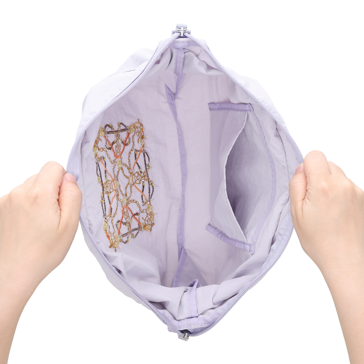 約195グラムの軽量タイプ。フェミニンなボタニカル柄とエレガントなベルト柄、それぞれの刺繍が魅力。開口部はジッパー仕様に。内側には便利なインナーポケット付きです