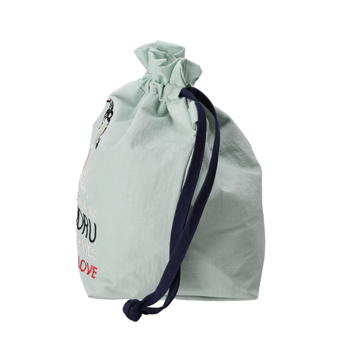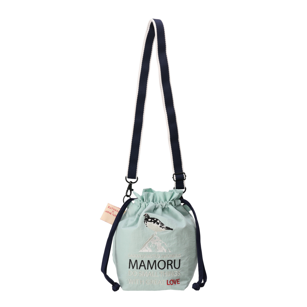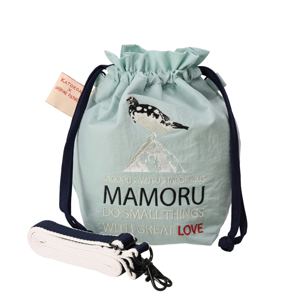 絶滅危惧「1」B類(EN)のライチョウを大胆な刺繍であしらった巾着ポーチ。デザインを通じて絶滅のおそれのある日本の生きものを紹介するブランド「KATOKOA mamoru」のアイテムです
