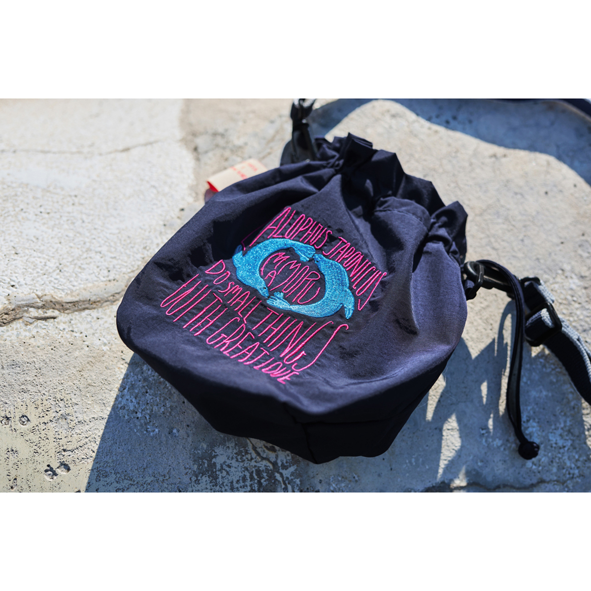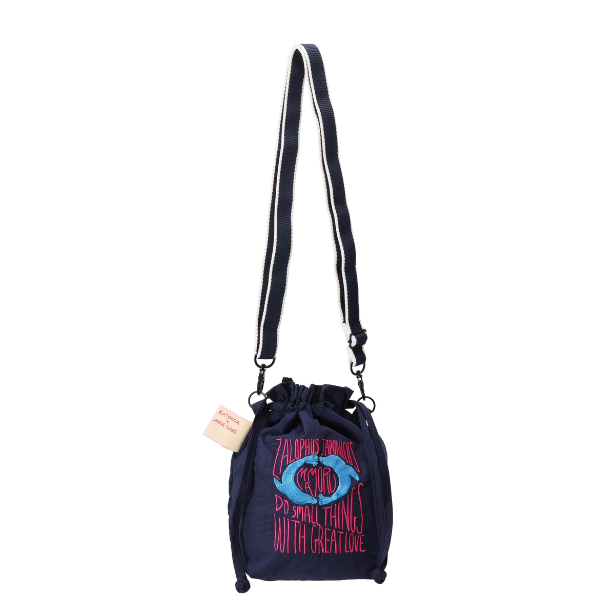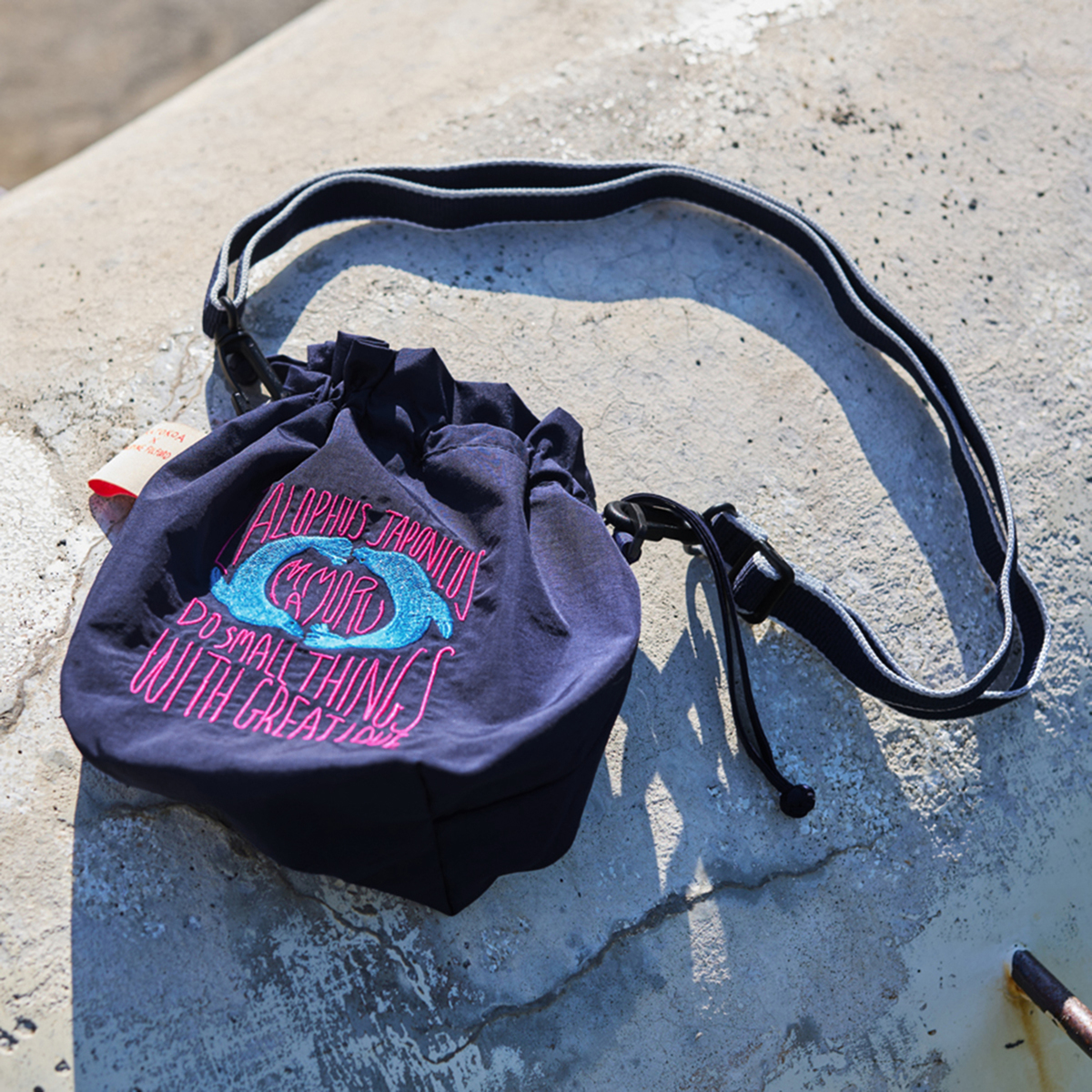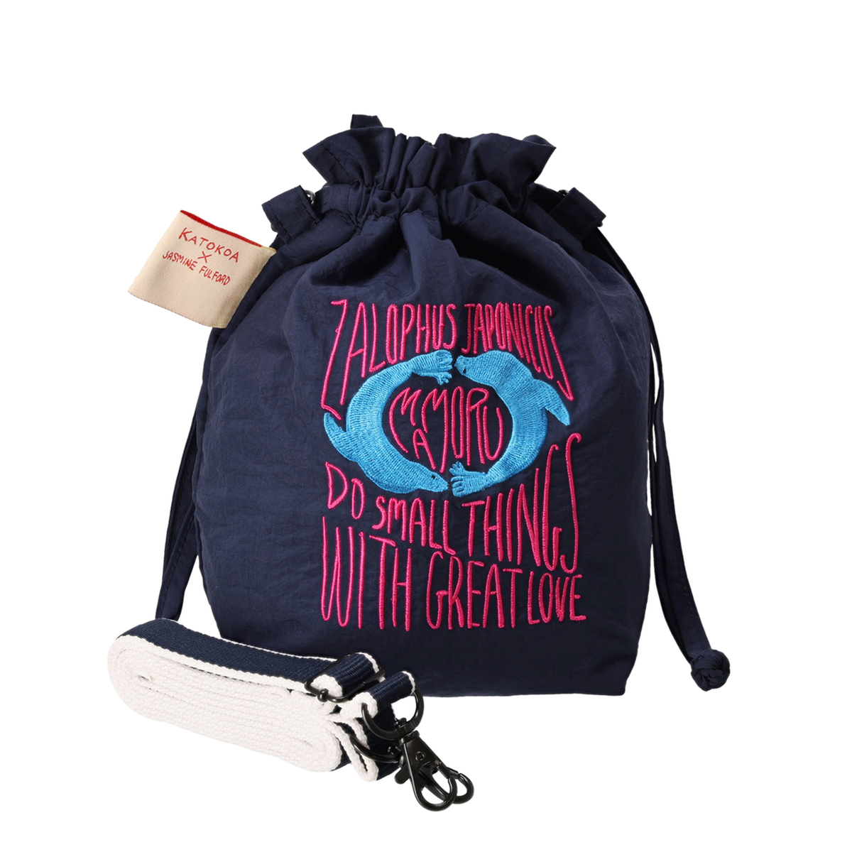 絶滅危惧「1」A類(CR) 剥製さえも世界で10体ほどしか残っていないニホンアシカを刺繍であしらった巾着ポーチ。デザインを通じて絶滅のおそれのある日本の生きものを紹介するブランド「KATOKOA mamoru」のアイテムです