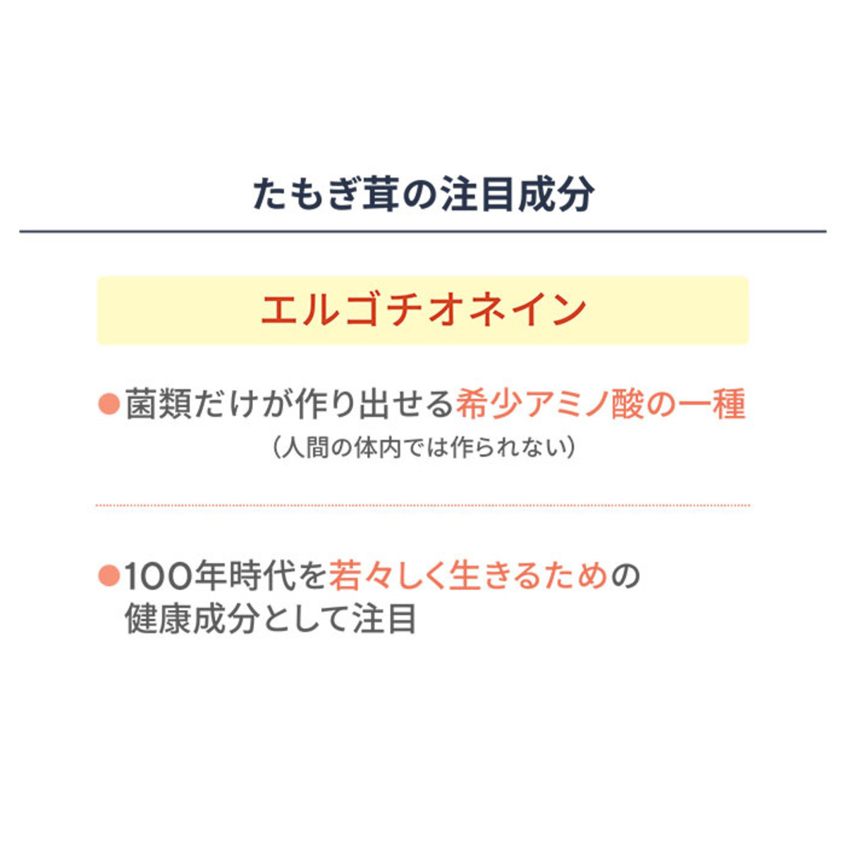 国産のたもぎ茸粉末を配合。本品に配合しているたもぎ茸粉末は、国内で製造しています。1日3〜6粒を目安に水または白湯と一緒にお召し上がりください