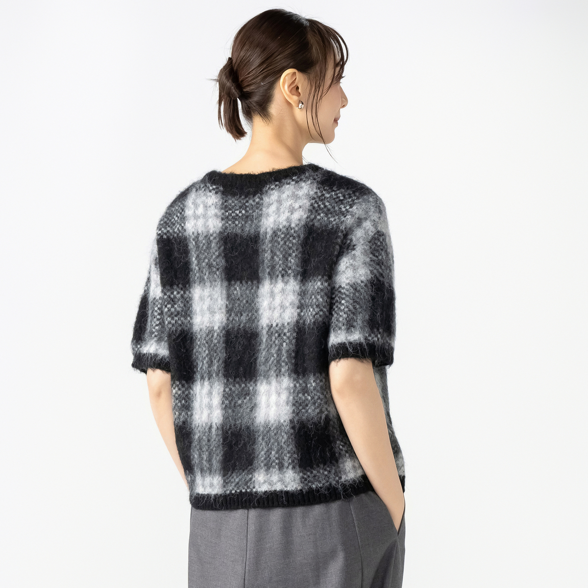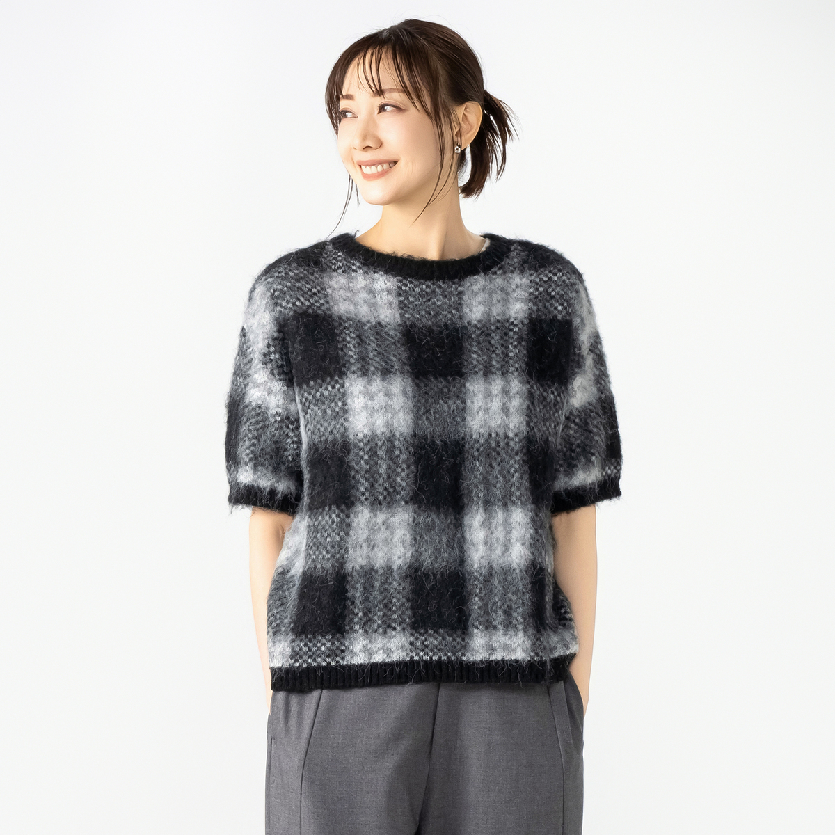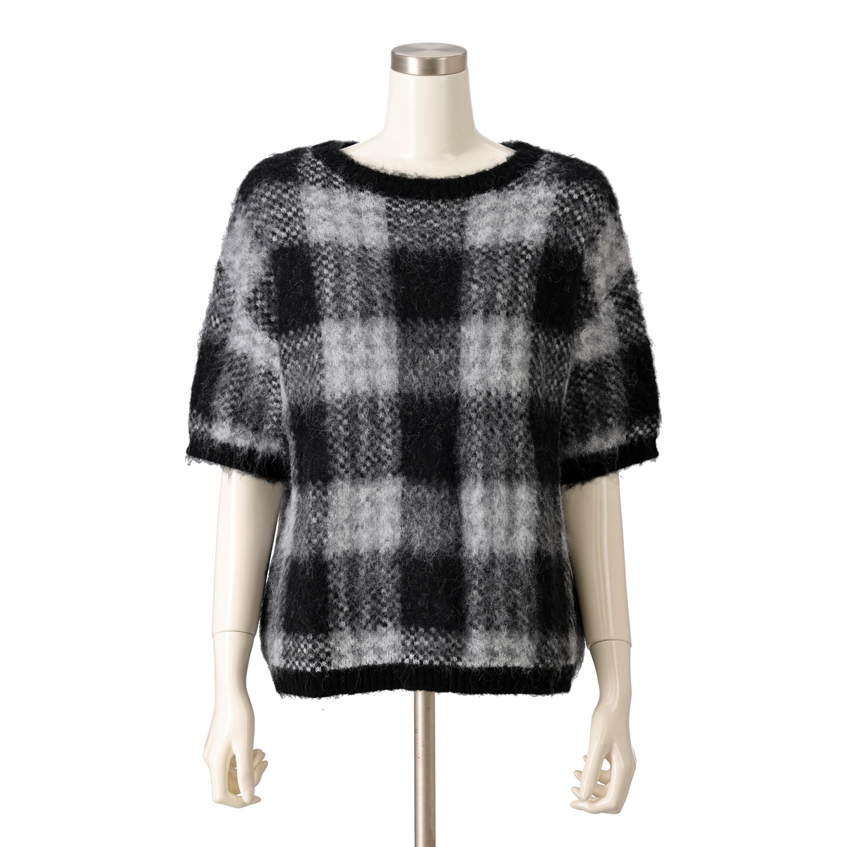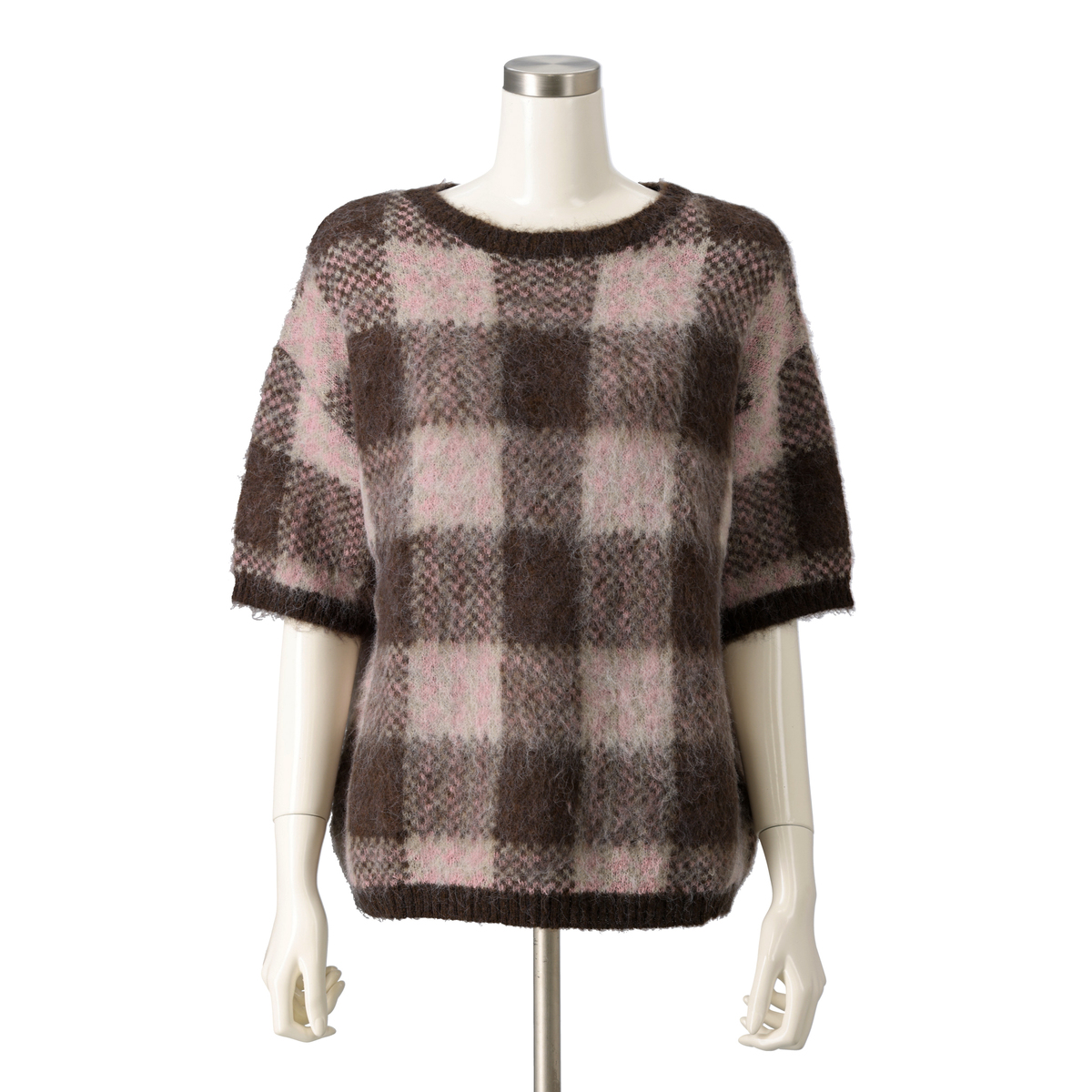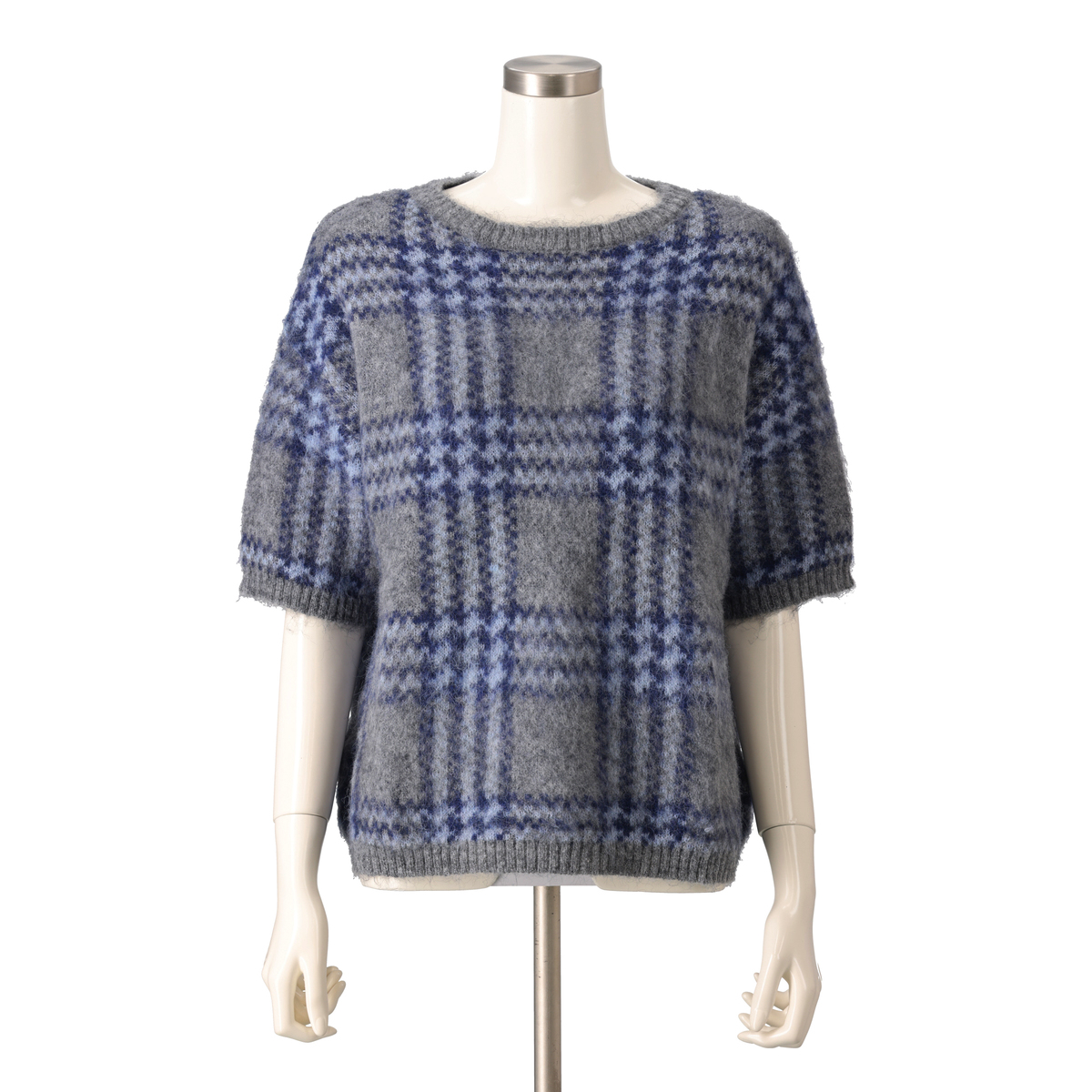 ミドルゲージで編んだジャガードニットプルオーバー。チェック柄と柔らかいヘアリー感のある糸を組合せた、軽やかな仕上がりです。半袖デザインで、インナーとしても使いやすい一枚です