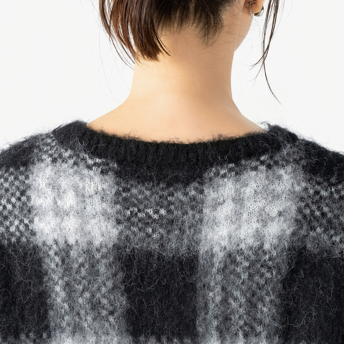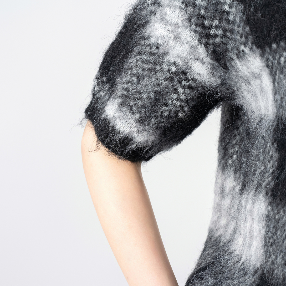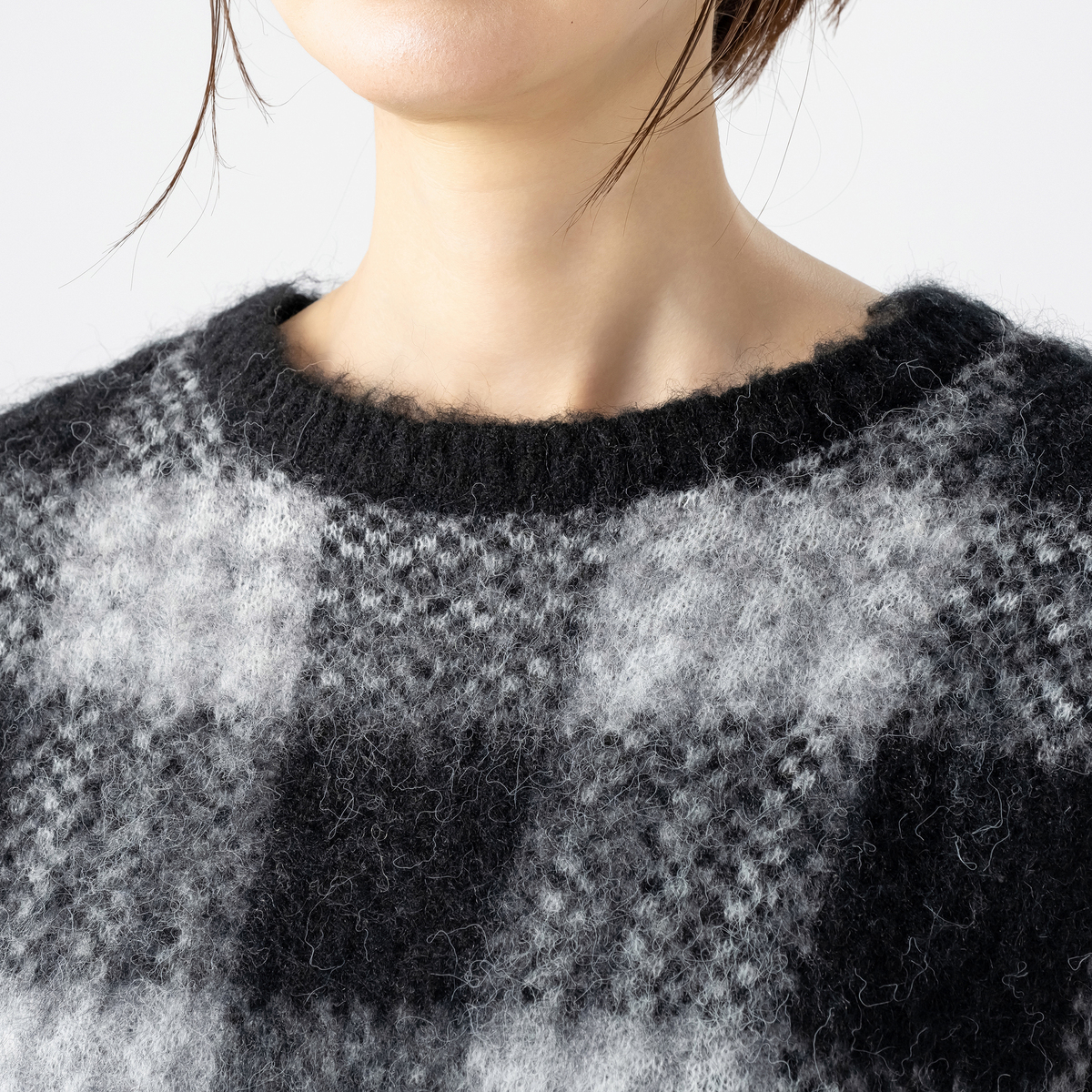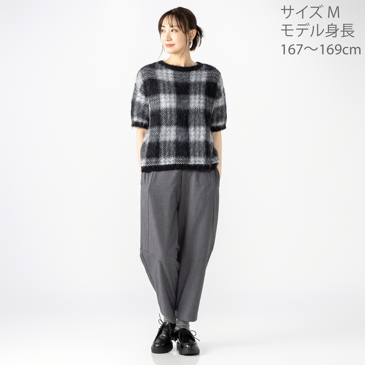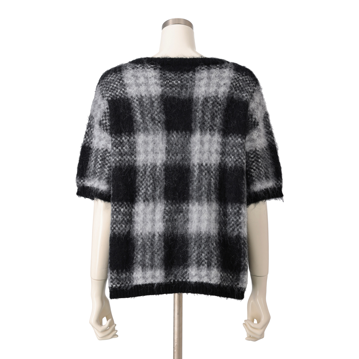 ミドルゲージで編んだジャガードニットプルオーバー。チェック柄と柔らかいヘアリー感のある糸を組合せた、軽やかな仕上がりです。半袖デザインで、インナーとしても使いやすい一枚です