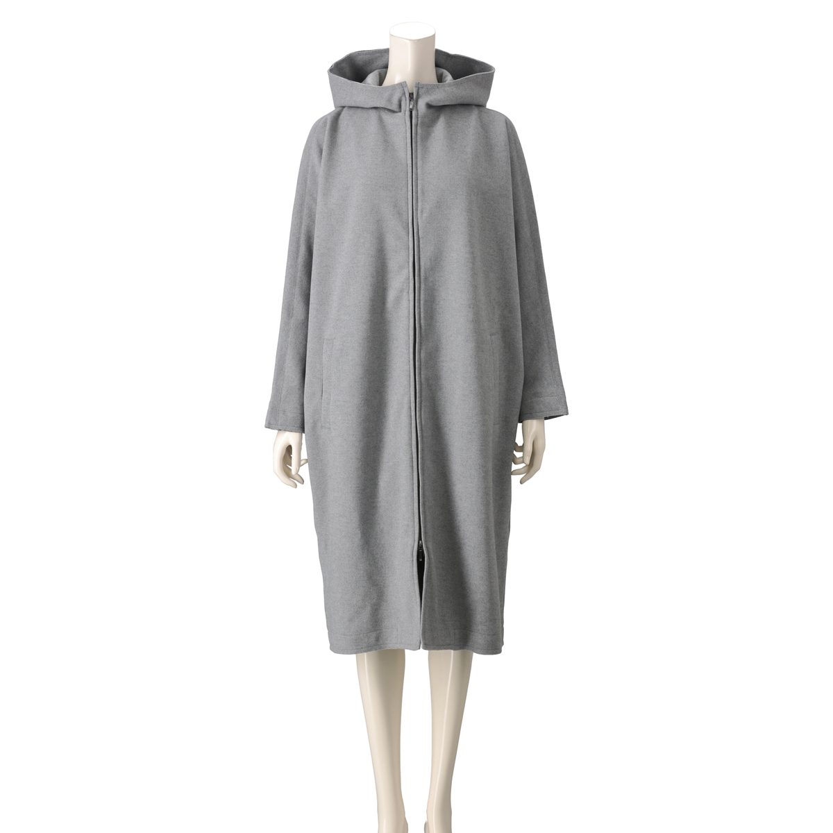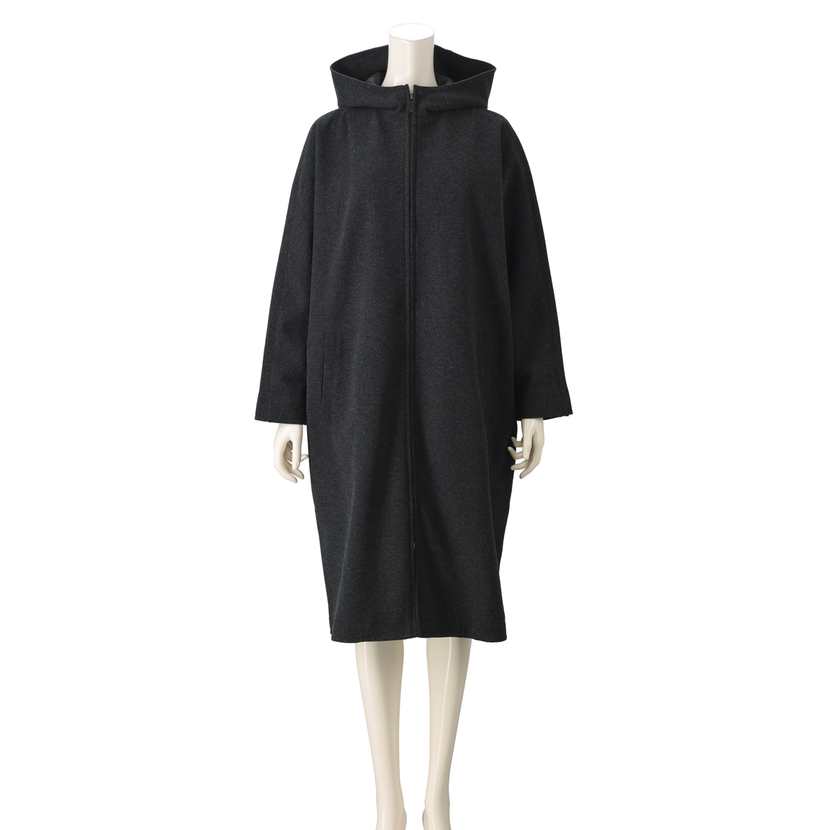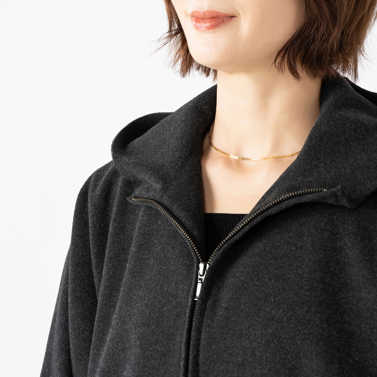 軽い圧縮素材を使ったジャケットコート。分量感のあるゆったりとしたシルエットです。フード付きで、カジュアルとエレガンスを組合せたデザインが特徴です