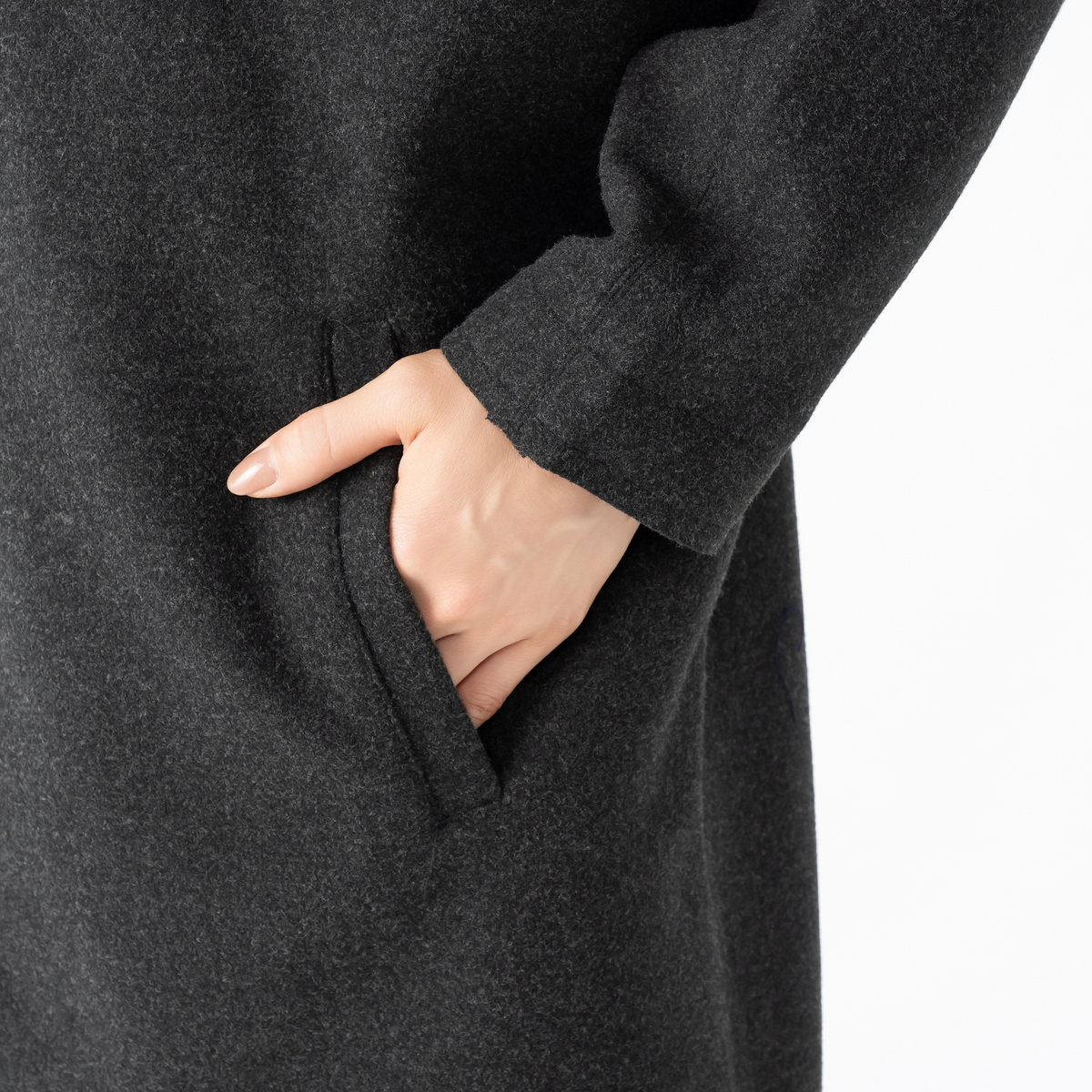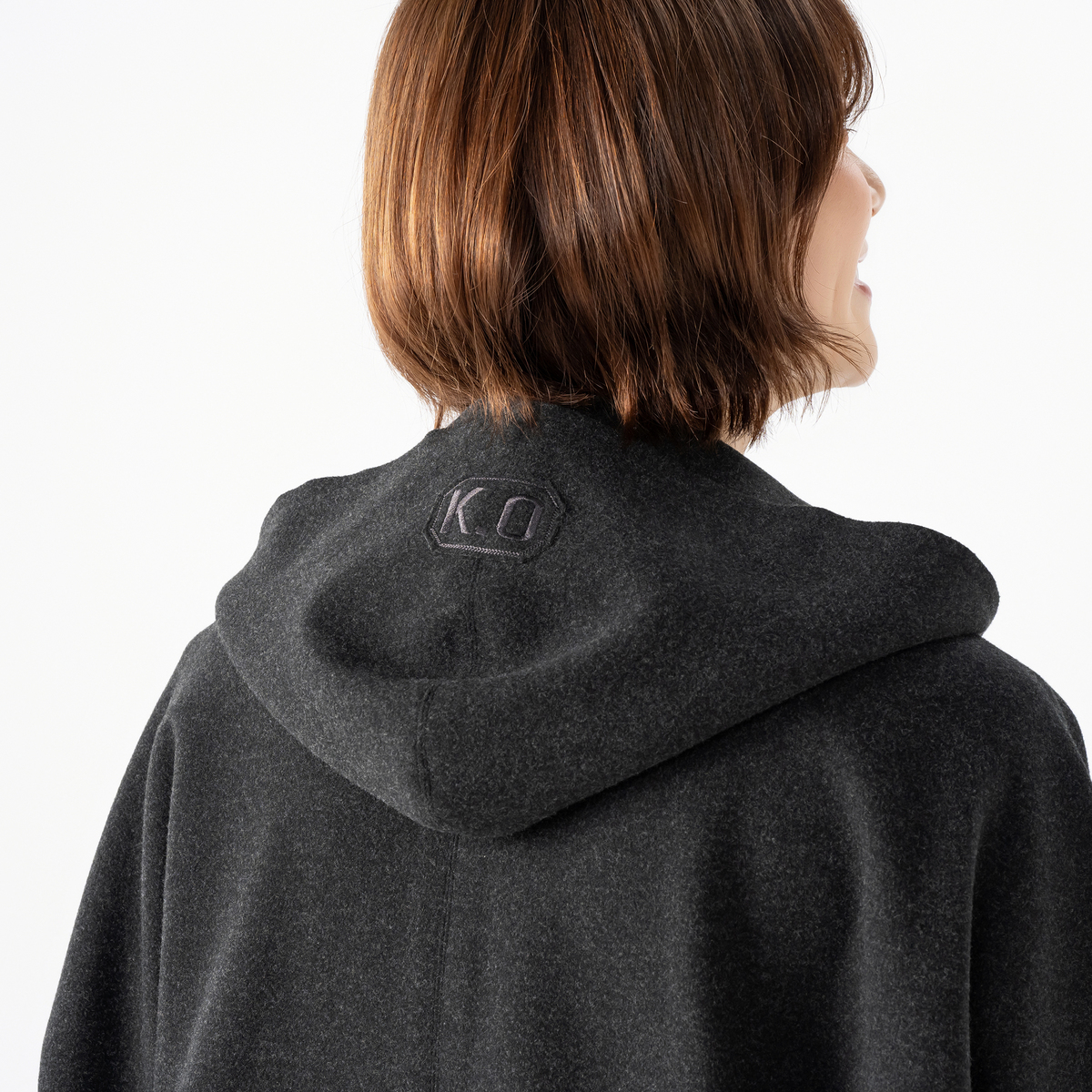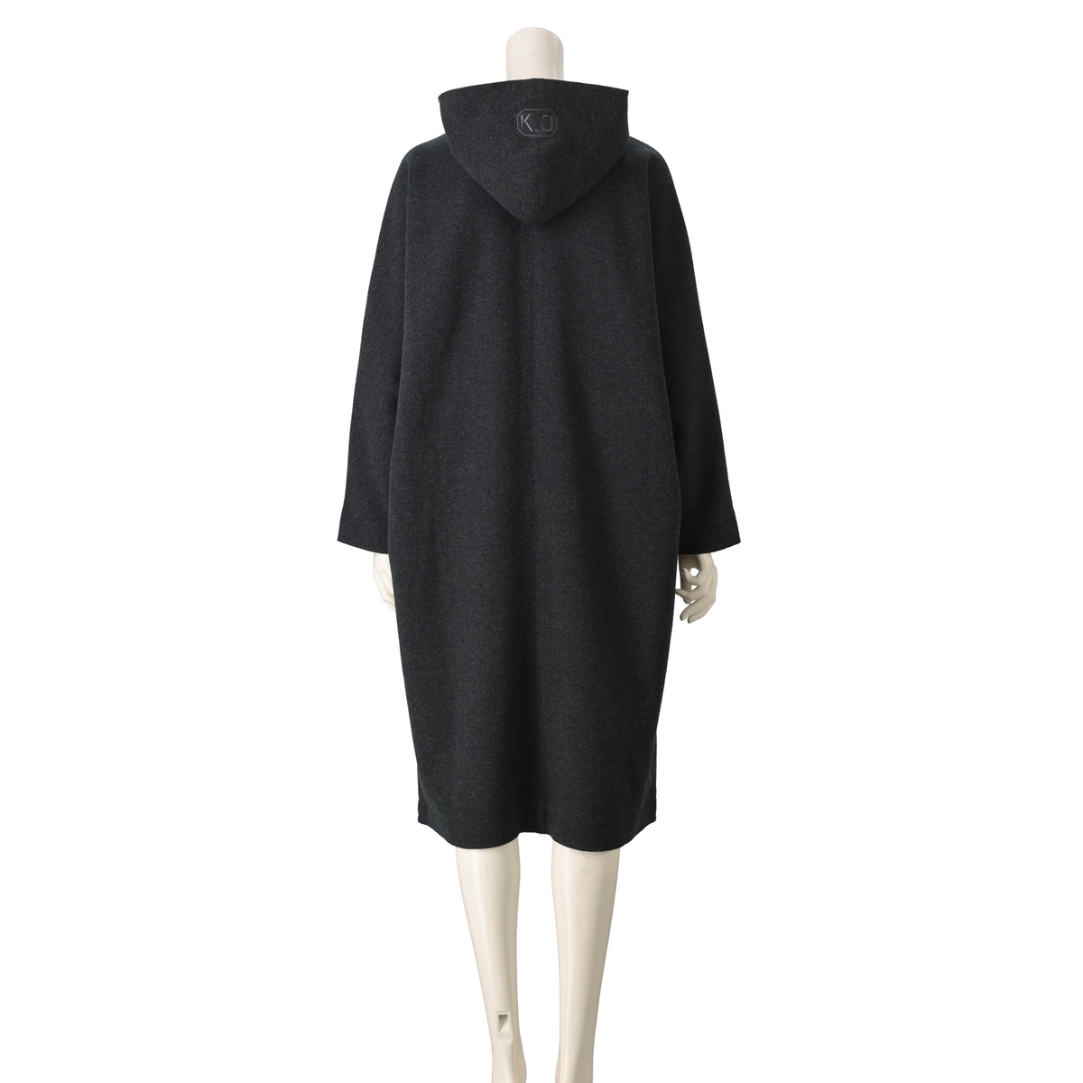 軽い圧縮素材を使ったジャケットコート。分量感のあるゆったりとしたシルエットです。フード付きで、カジュアルとエレガンスを組合せたデザインが特徴です