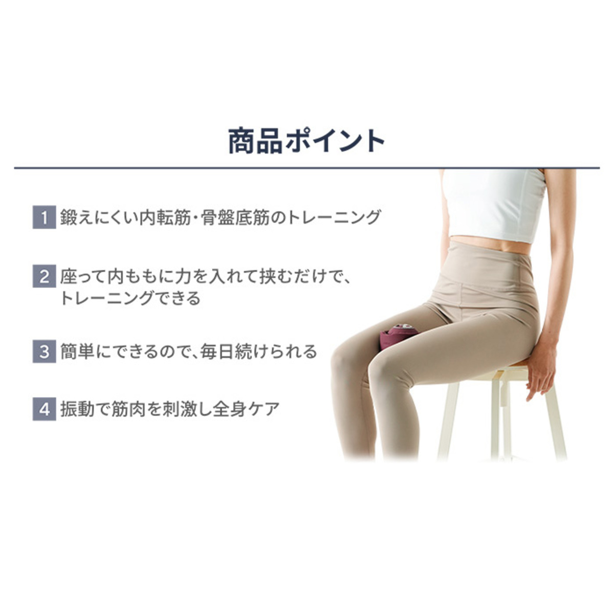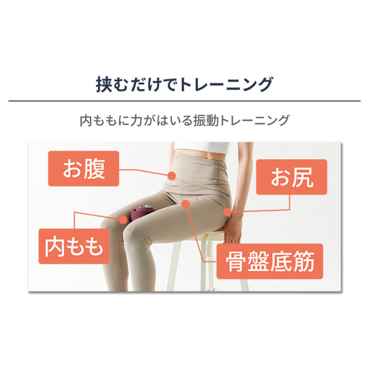 本体が振動することにより、接する部位の筋肉に刺激を与えながらトレーニングを行うことができる運動補助器具です。座ったり寝た状態で脚にボールを挟み太ももの内側に力を入れる運動で、お腹、お尻、内もも、骨盤底筋が鍛えられます