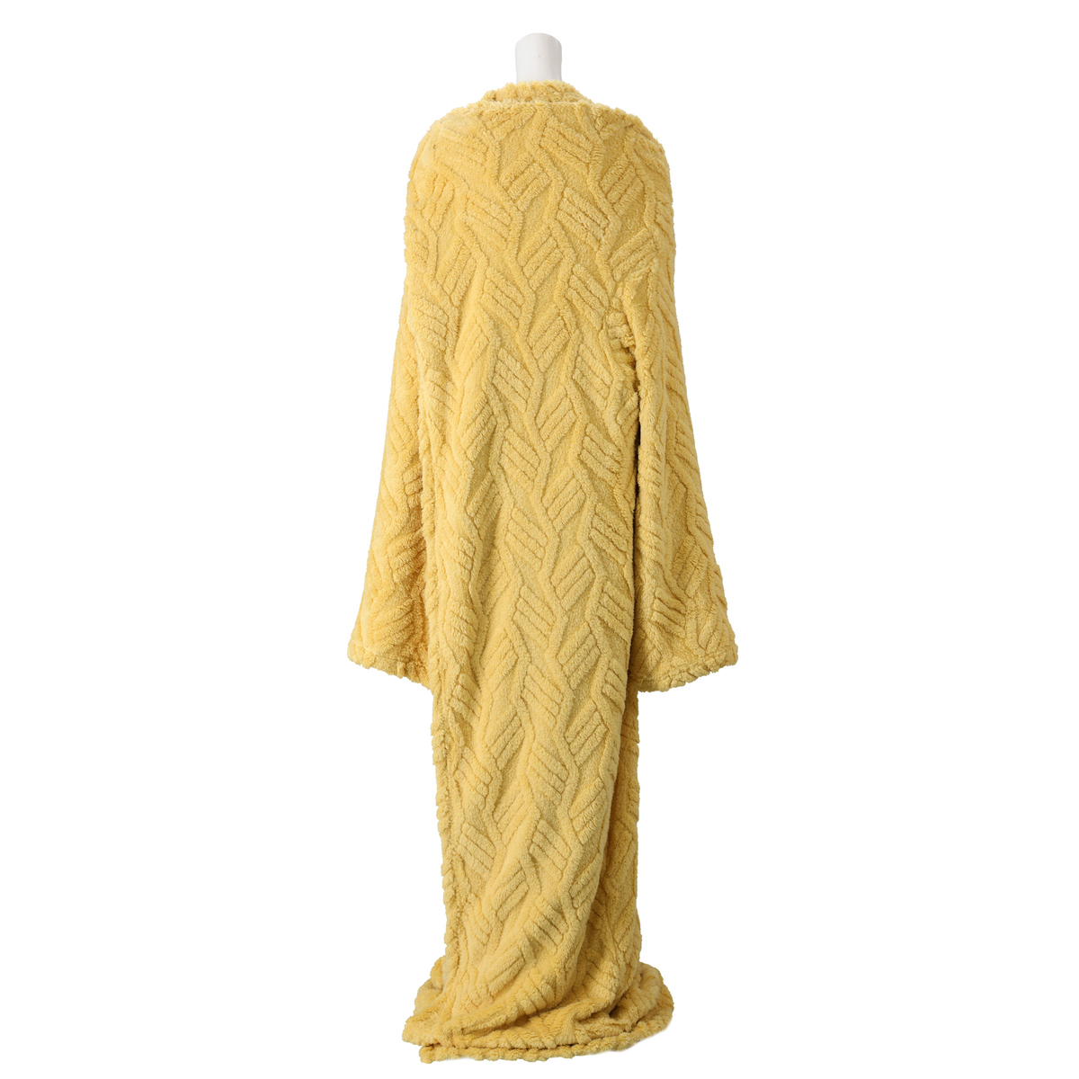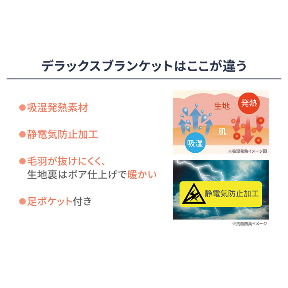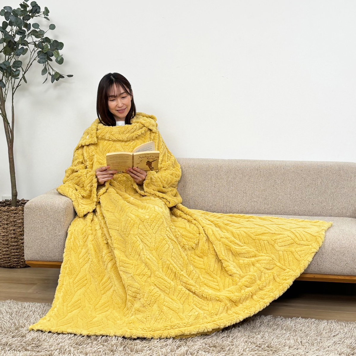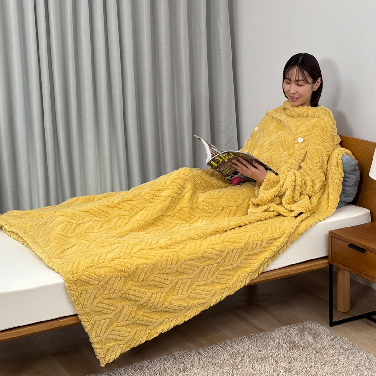 手が自由に使えるように大きくルーズな袖の付いた、フリースのブランケットです。パイル部分にマイクロファイバー(ポリエステル)の糸を使用。生地裏はボアにしてあたたかく。吸湿発熱加工や静電気防止加工も施しています