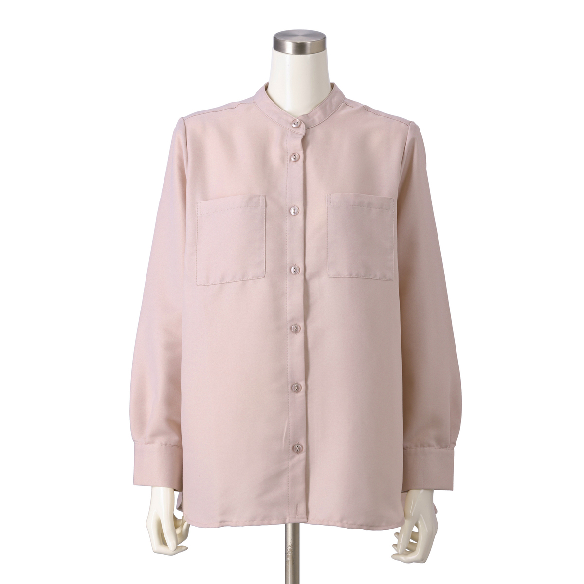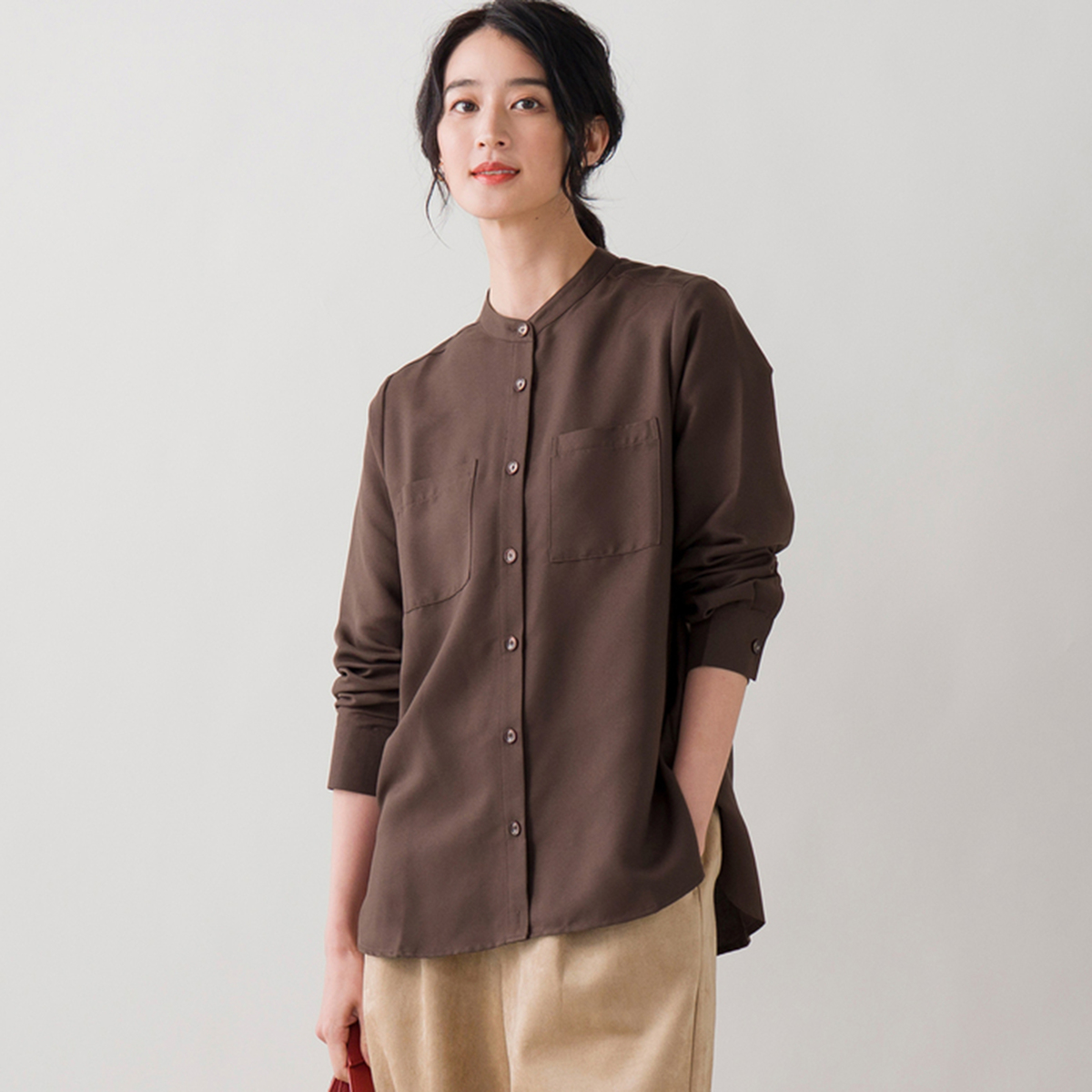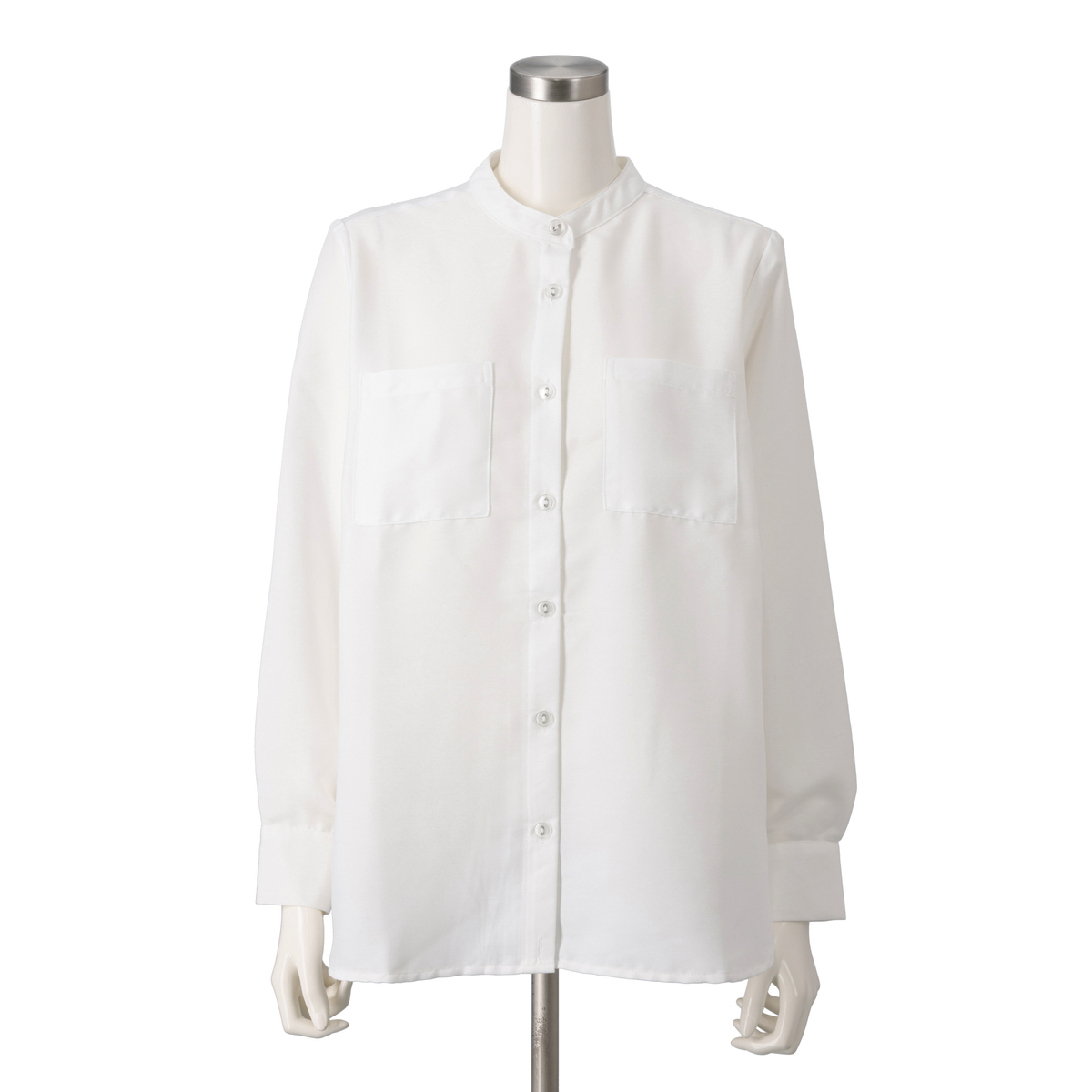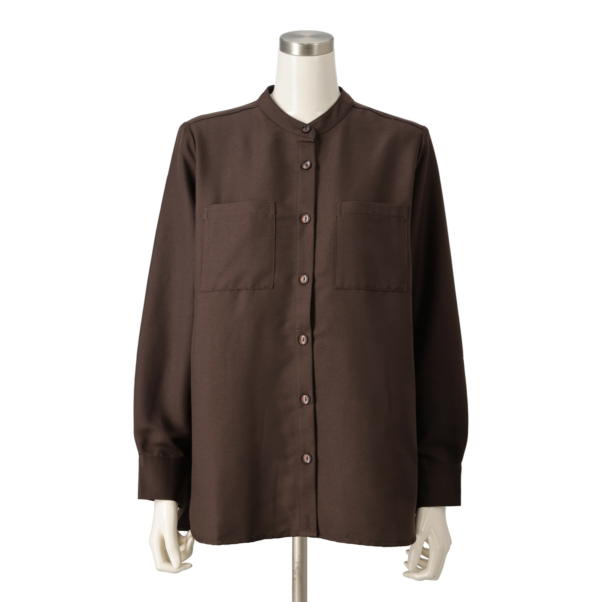 ベーシックなバンドカラーがお顔まわりをすっきり見せ、両胸の大きめポケットが視線をコントロールし、スタイルアップ効果も期待できます。袖はカフス仕様で、ベーシックな一枚袖に。パンツにもスカートにも合わせやすく、羽織りとしても活躍します