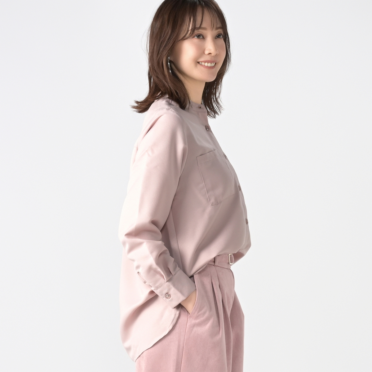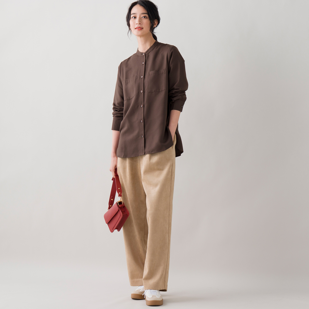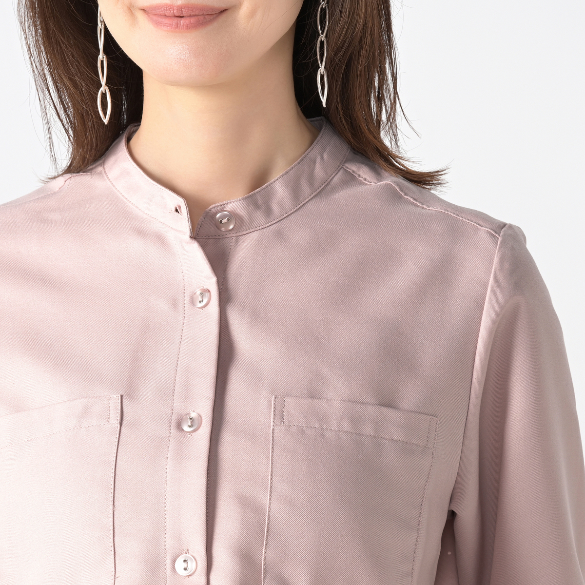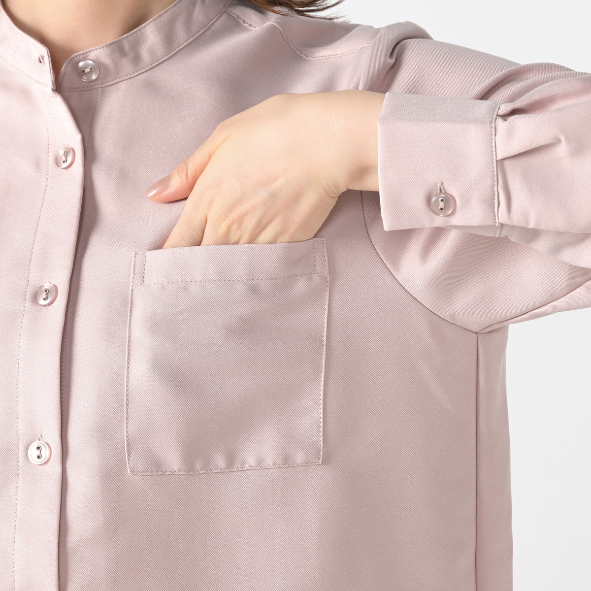 ベーシックなバンドカラーがお顔まわりをすっきり見せ、両胸の大きめポケットが視線をコントロールし、スタイルアップ効果も期待できます。袖はカフス仕様で、ベーシックな一枚袖に。パンツにもスカートにも合わせやすく、羽織りとしても活躍します