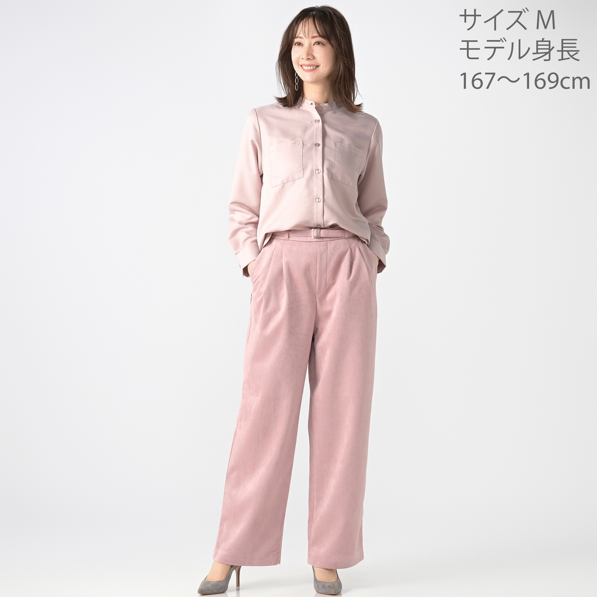 ピンク・L 購入 シルエットも良く綺麗に着こなせます。 色は少し落ち着いたピンクですね。 フロントインにするよりも、そのままの方が細く見える感じしたので、そのまま着てます