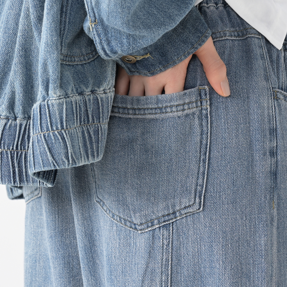 ソフトで軽い仕上がりのデニムパンツです。糸の撚りを甘く織る事で生地に膨らみがある、柔らかでごわつき感の少ないデニムを使用。洗いをかけたネイビー、ブラック、ケミカル、グレーは製品ブリーチ加工の絶妙な色合いがこなれ感を表現しています