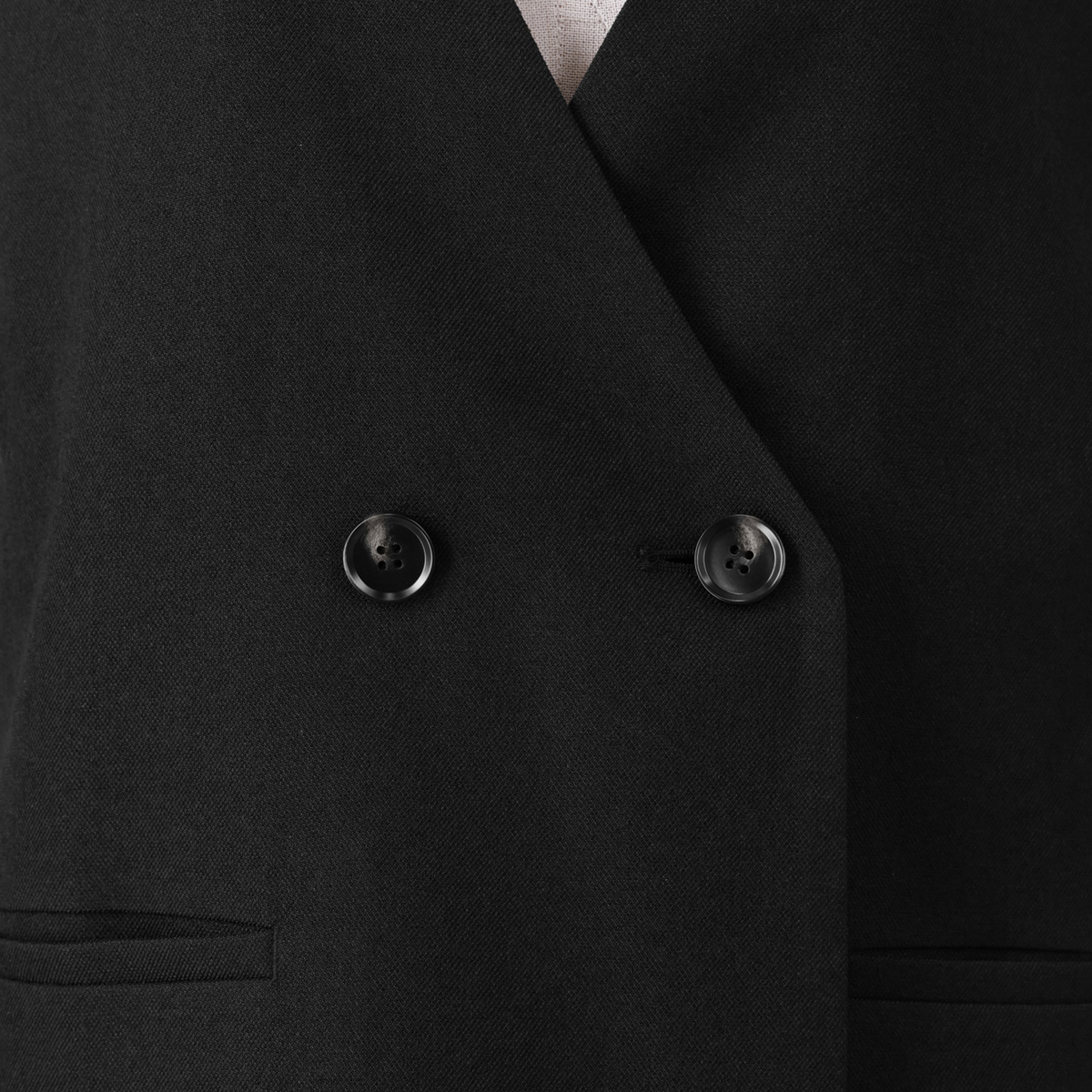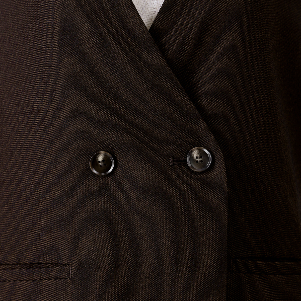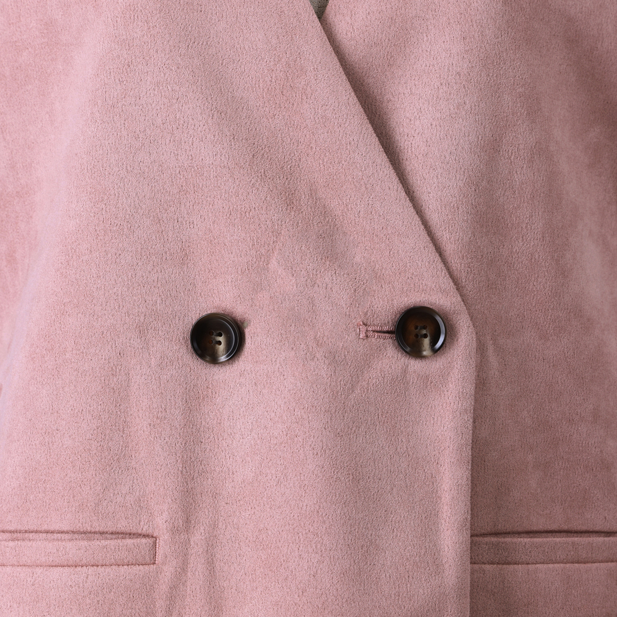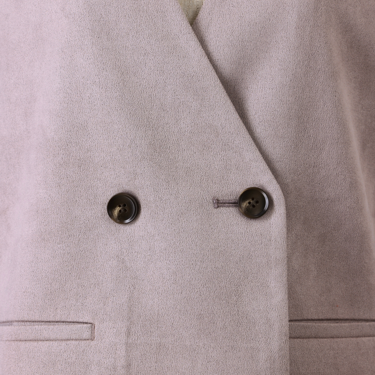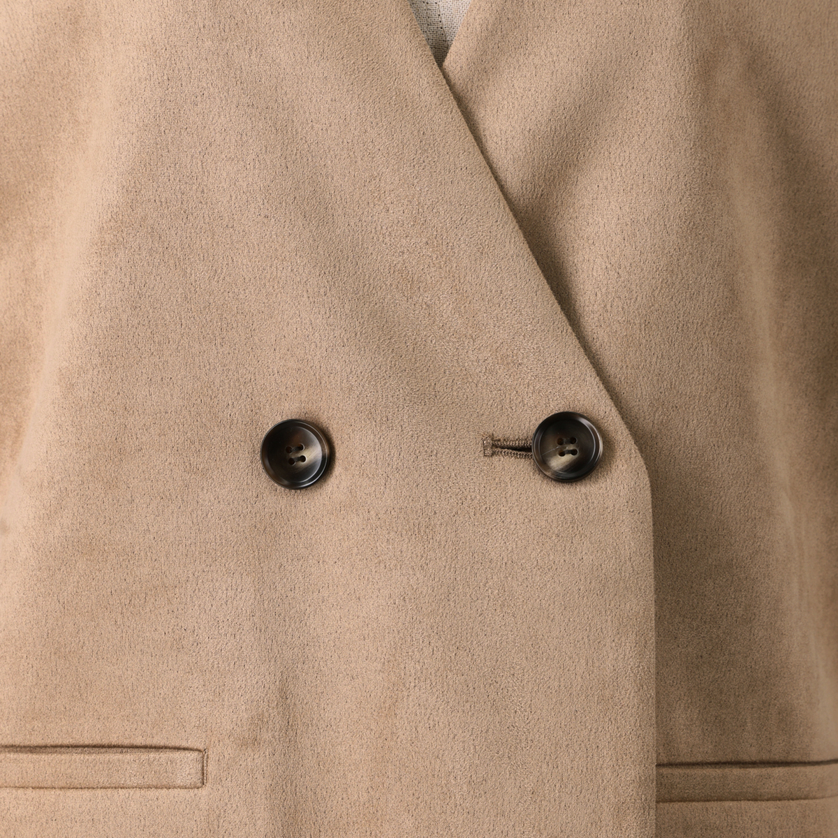前中心はダブル重ねのシングルボタンデザイン。やや高めについた片玉縁のポケットとボタンが腰位置を高く見せてくれます。スエード調素材と杢調素材(ブラック以外)からお選びいただけます