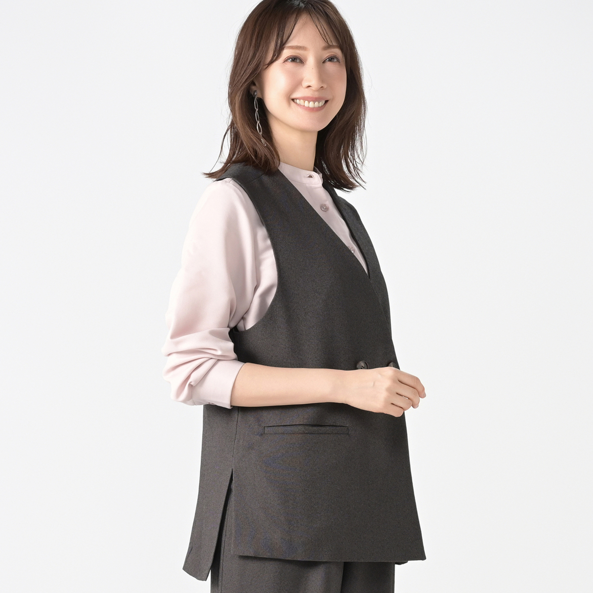 パンツとセットアップで購入しました。 ビジネスシーンにてデキる女見えします! ジレっておばさんのチョッキ風にしかならないと思ってましたがこれはめちゃめちゃ良い!! ぜひジャケットも作っていただき3ピースで着たいですー!!!(ダブル希望!)