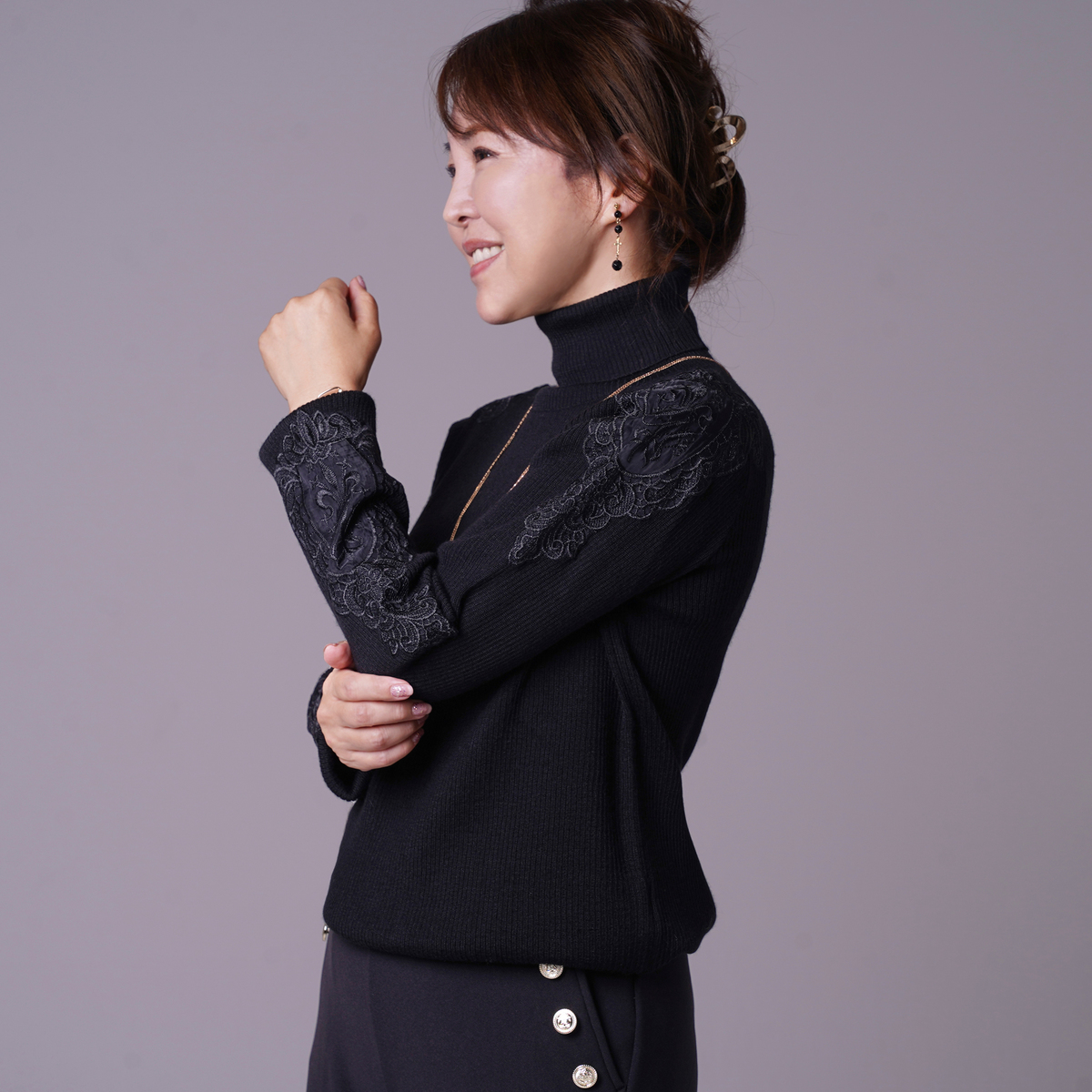 首元や身体のラインがすっきり見えるようにリブの太さやサイズ感にこだわってデザイン。詰まりすぎないタートルネックが首元をきれいに見せます。衿元が柔らかく、窮屈さを感じにくい着心地です