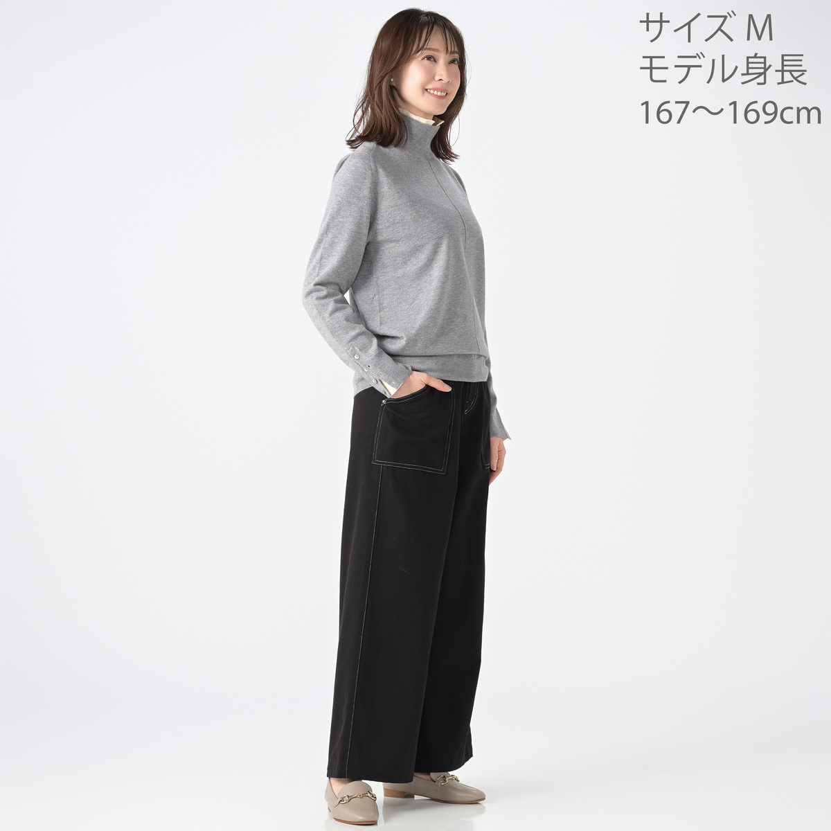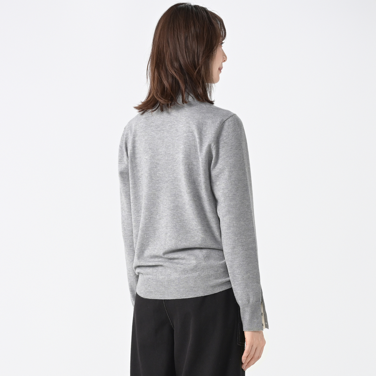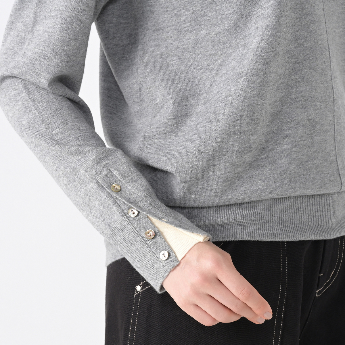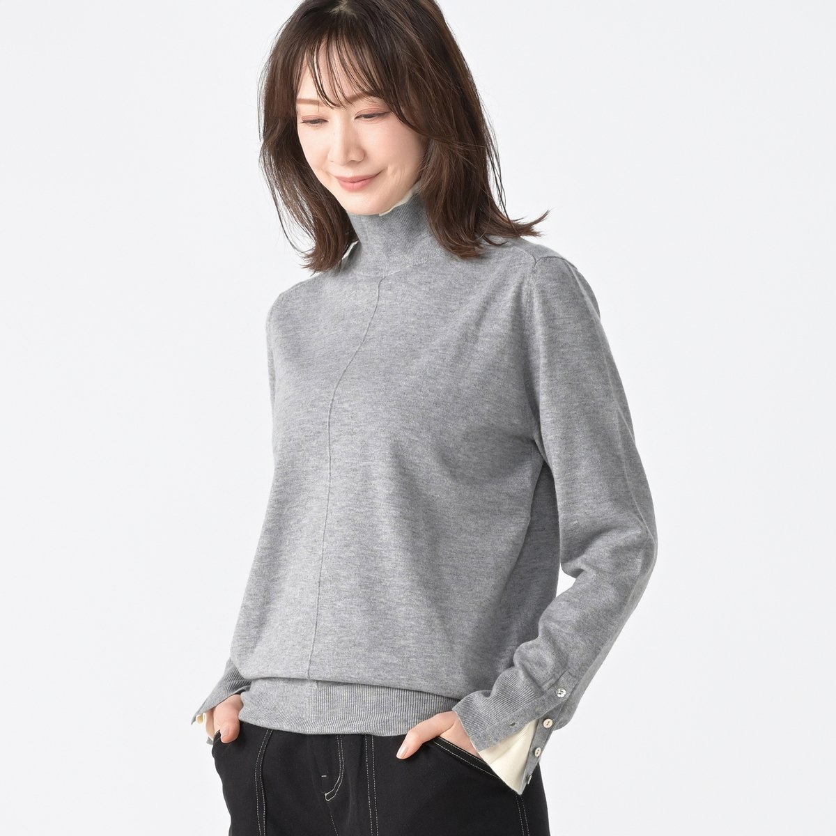 ゲストさんの着用が素敵で、グレーを購入しました。ただのハイネックではなく、折り返すと可愛い襟があり、しかも袖口のボタンを開けつ着ると、襟と同じカラーが見えて、リンクしているのが、とってもオシャレです。ニットも薄めで、柔らかい気持ちの良い着心地です。 袖口のボタンが高級な貝ボタンで、安っぽくないので、気持ちがグーンと上がります。 上質な物を着ているって感じで、購入して大満足です。