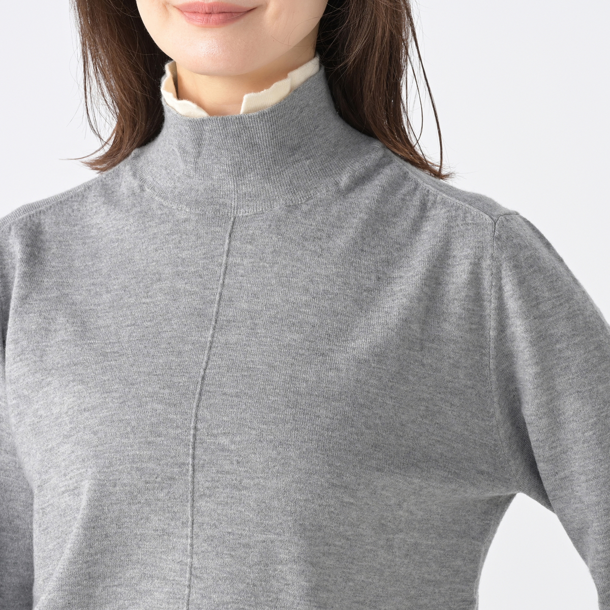 ハイネックの衿が配色のレイヤード風のデザインで、衿の高さも私好みだったのでグレーを迷わず注文しました。 届いて触った瞬間肌あたりが柔らかくて上質な品物だと思ったのですが…??? 一回着ただけで胸の辺りに毛玉のようなものが出来て、良く見ると脇の付け根から裾にかけても擦れたような繊維のヨレが目立ってしまって。 上に着たジャケットとの摩擦が原因だと思いますが素材の問題もありますね。 二回目は何とか着たものの三回目は無理です。サヨナラします。 高い買い物でした。