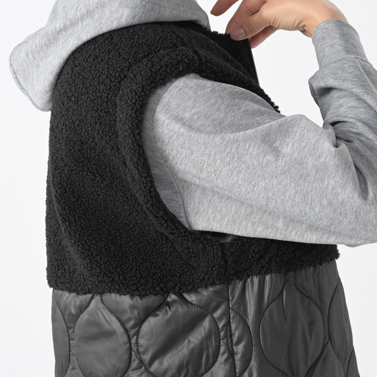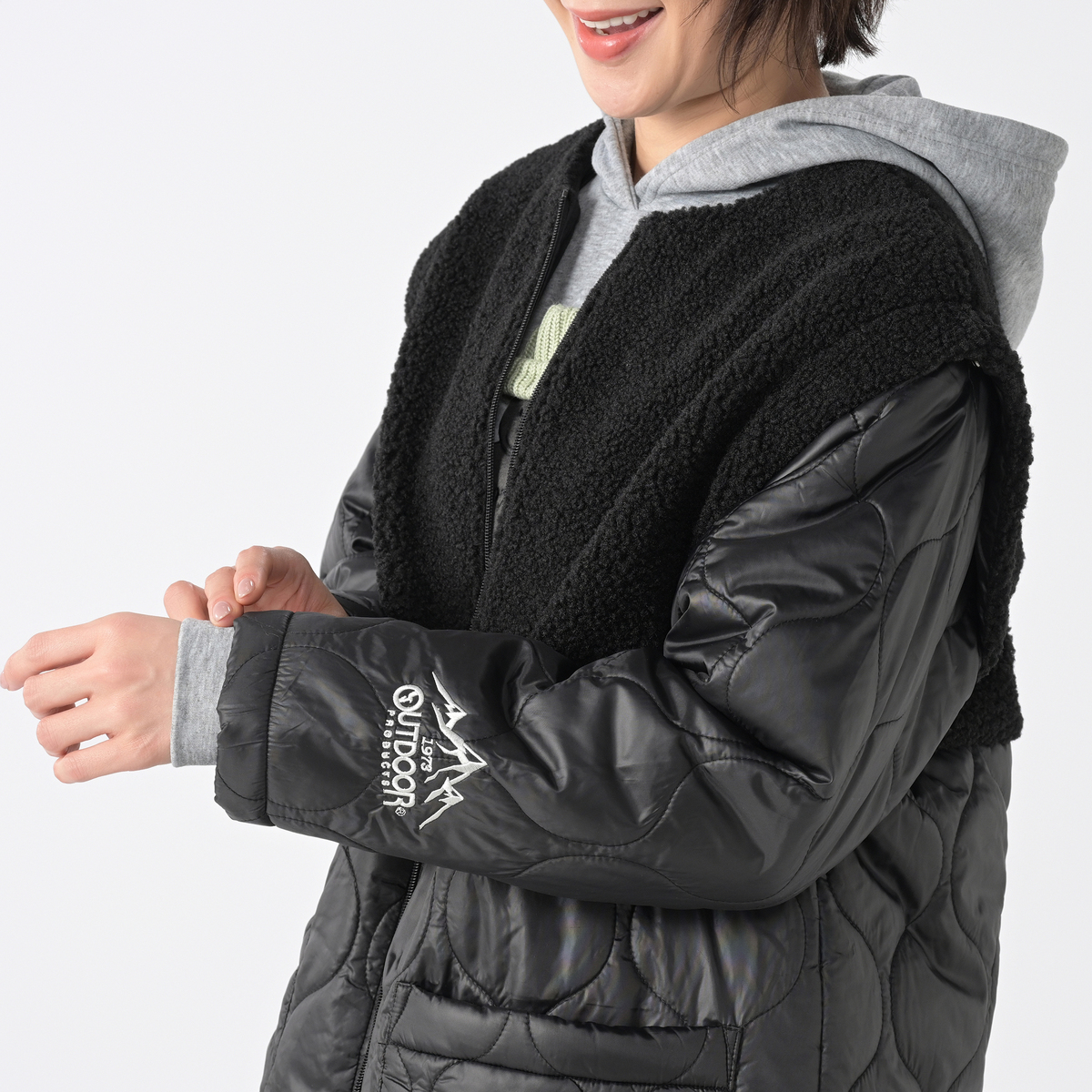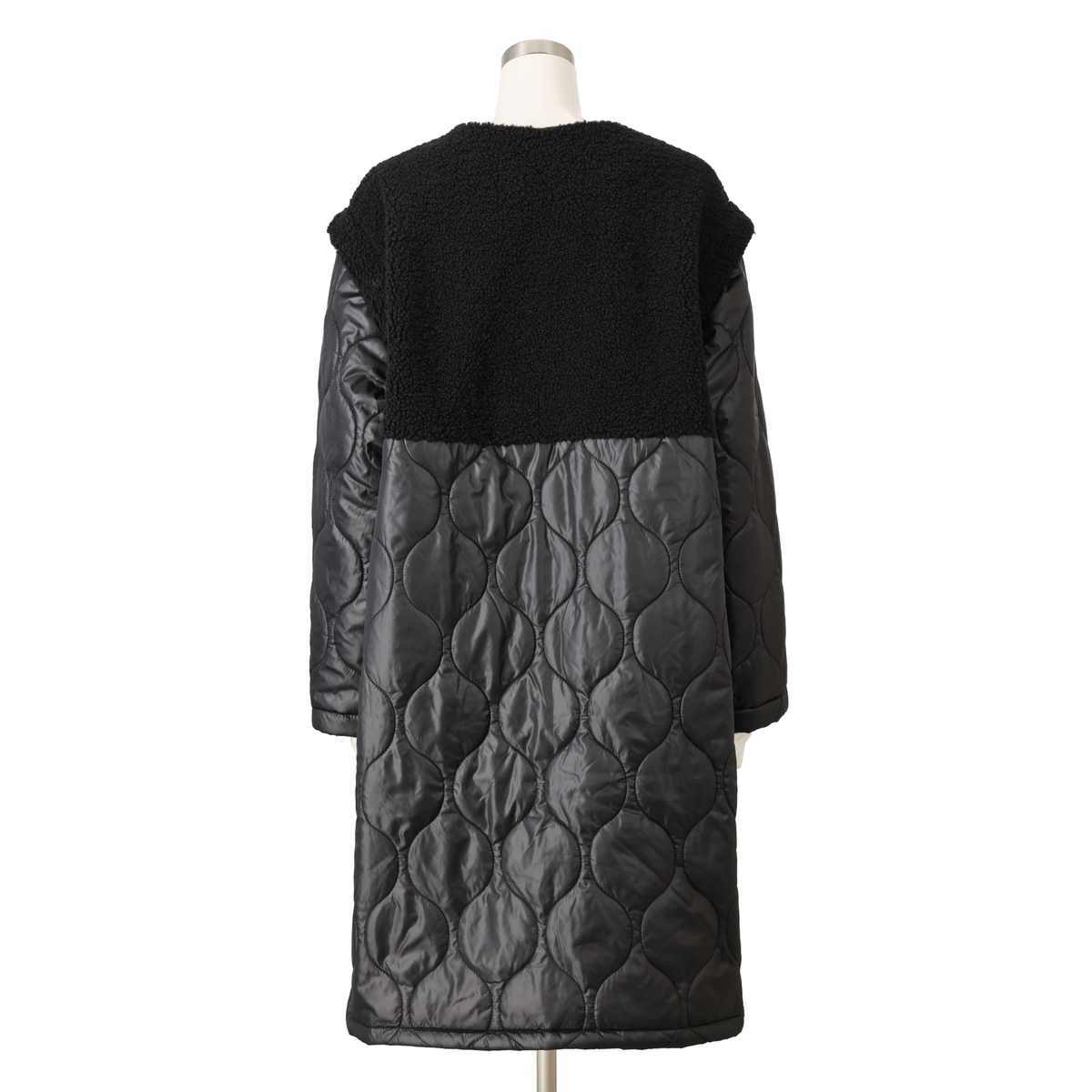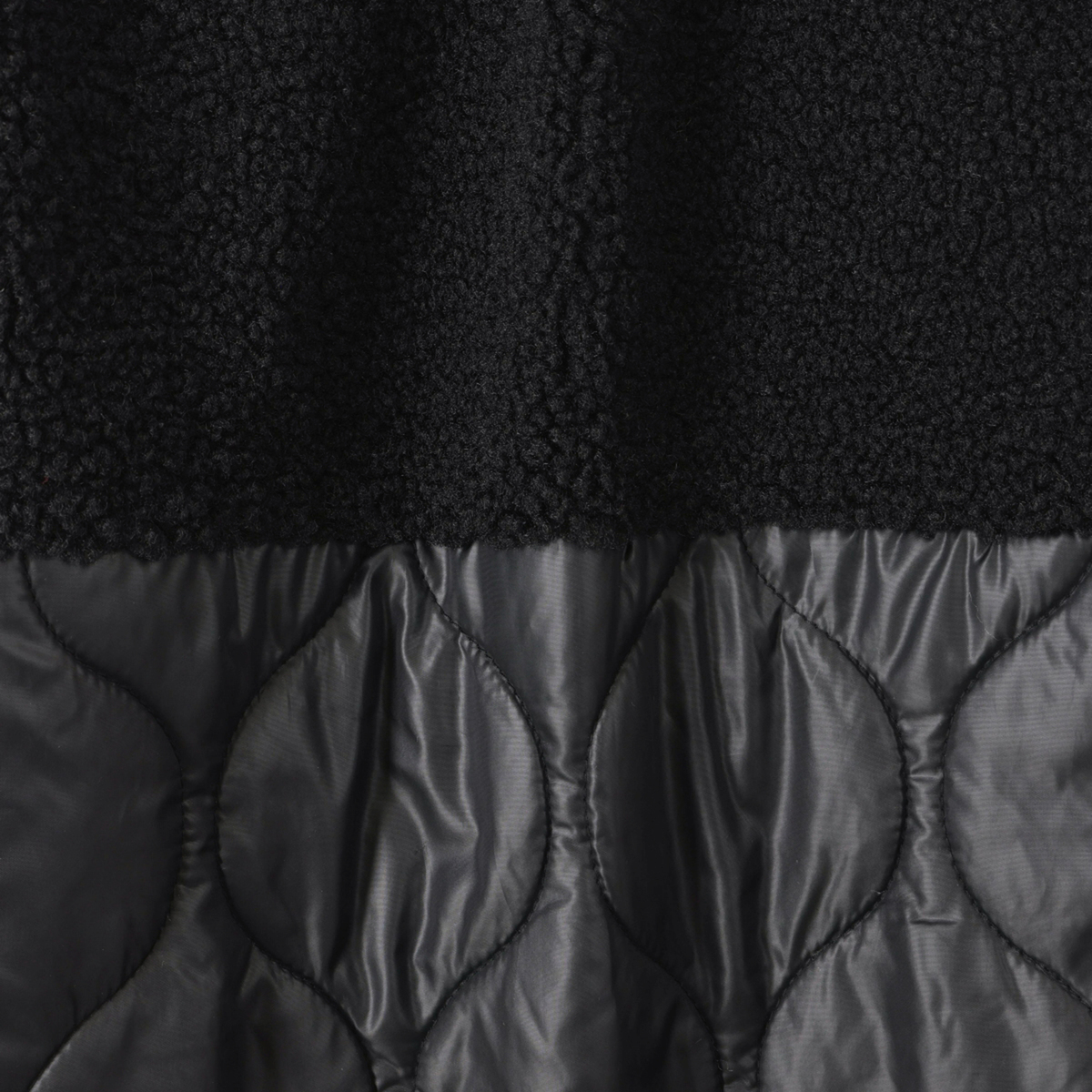 全体的にタフタ素材を使用。また発熱中綿を使用しているので寒さ対策にも。胸上はふんわりとしたシープボア切替で柔らかい印象に。メインのタフタとの異素材コントラストがポイントです