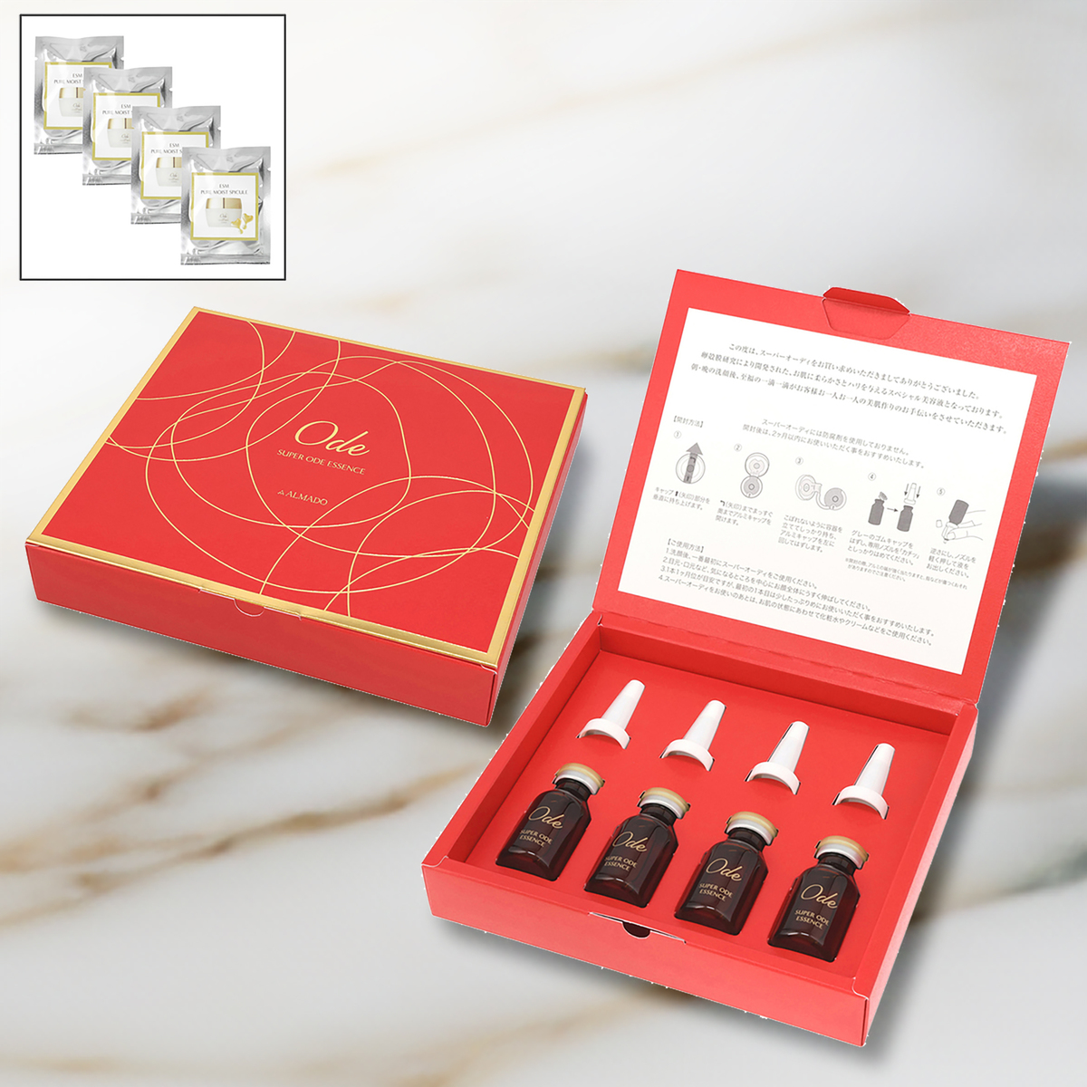 [使用方法] <スーパーオーディエクストラリッチ> 1.洗顔後、一番最初にスーパーオーディをご使用ください 2.目元、口元など、気になるところを中心にお顔全体にうすく伸ばしてください 3.1本1ヶ月位が目安ですが、最初の1本目は少したっぷりめにお使いいただく事をおすすめいたします 4.スーパーオーディをお使いのあとは、お肌の状態にあわせて化粧水やクリームなどをご使用ください <オーディ ESMピュアモイストスピクル+> 1.カプセルの先端をハサミで切ってください 2.カプセルを押し少量ずつ指先にとります 3.お肌の気になるところにトントンとのせて優しく馴染ませます 4.お手持ちの美容液または化粧水と本品を馴染ませながら、スピクルを浸透(角質層まで)させます ※ 角質層まで 【日本製】 [注意事項] <共通> ※お肌に異常が生じていないかよく注意して使用してください。化粧品がお肌に合わないとき即ち次のような場合には、使用を中止してください。そのまま化粧品類の使用を続けますと、症状を悪化させることがありますので、皮膚科専門医等にご相談されることをおすすめします (1)使用中、赤味、はれ、かゆみ、刺激、色抜け(白斑等)や黒ずみ等の異常があらわれた場合 (2)使用したお肌に、直射日光があたって上記のような異常があらわれた場合 ※傷やはれもの、しっしん等、異常のある部位にはお使いにならないでください ※目に入らないようにご注意ください。もし目に入った場合は、こすらずにすぐ水又はぬるま湯で洗い流してください。目に異物感が残る場合は、眼科医にご相談ください ※お子様の手の届かない所に保管してください ※極端に高温または低温の場所には保管しないでください<スーパーオーディエクストラリッチ> ※高濃度のため卵殻膜が沈遊・沈殿する場合がございます。白濁したように見えることもございますが品質には問題ございませんのでそのような場合は振ってからご使用ください ※本製品は防腐剤を使用しておりません。開封後は2ヶ月以内のご使用をお願い致します [セット内容] ・スーパーオーディ 15mL×8 ・キャップ×8 ・オーディESMピュアモイストスピクル+ 2カプセルパウチ ×4※プレゼント <オーディ ESMピュアモイストスピクル+> ※本品は食べ物ではありません。口に含まないでください ※直射日光を避け、乾燥した涼しい場所に保管してください ※カプセルは、高温多湿の場所では柔らかく、低温下で硬くなる特性がありますので浴室内などに置かないでください ※製品特徴により香りが変化する場合がございますが品質には問題ございませんのでそのままご使用ください [成分] スーパーオーディエクストラリッチ: 水、BG、加水分解卵殻膜、ヒアルロン酸Na、スクワラン、加水分解シベルリンドネラ多糖体、ポリクオタニウム-51、センチフォリアバラ花油 オーディ ESMピュアモイストスピクル+: スクワラン、パルミチン酸デキストリン、(パルミチン酸/エチルヘキサン酸)デキストリン、加水分解ヒアルロン酸、加水分解卵殻膜、セラミドEOP、セラミドNG、セラミドNP、セラミドAP、オプンチアフィクスインジカ果実エキス、ホホバ種子油、月見草油、バオバブ種子油、スクレロカリアビレア種子油、プリンセピアウチリス種子油、オレンジ果皮油、ニオイテンジクアオイ油、オクチルドデカノール、エチルヘキシルグリセリン、グリチルレチン酸ステアリル、酢酸トコフェロール
