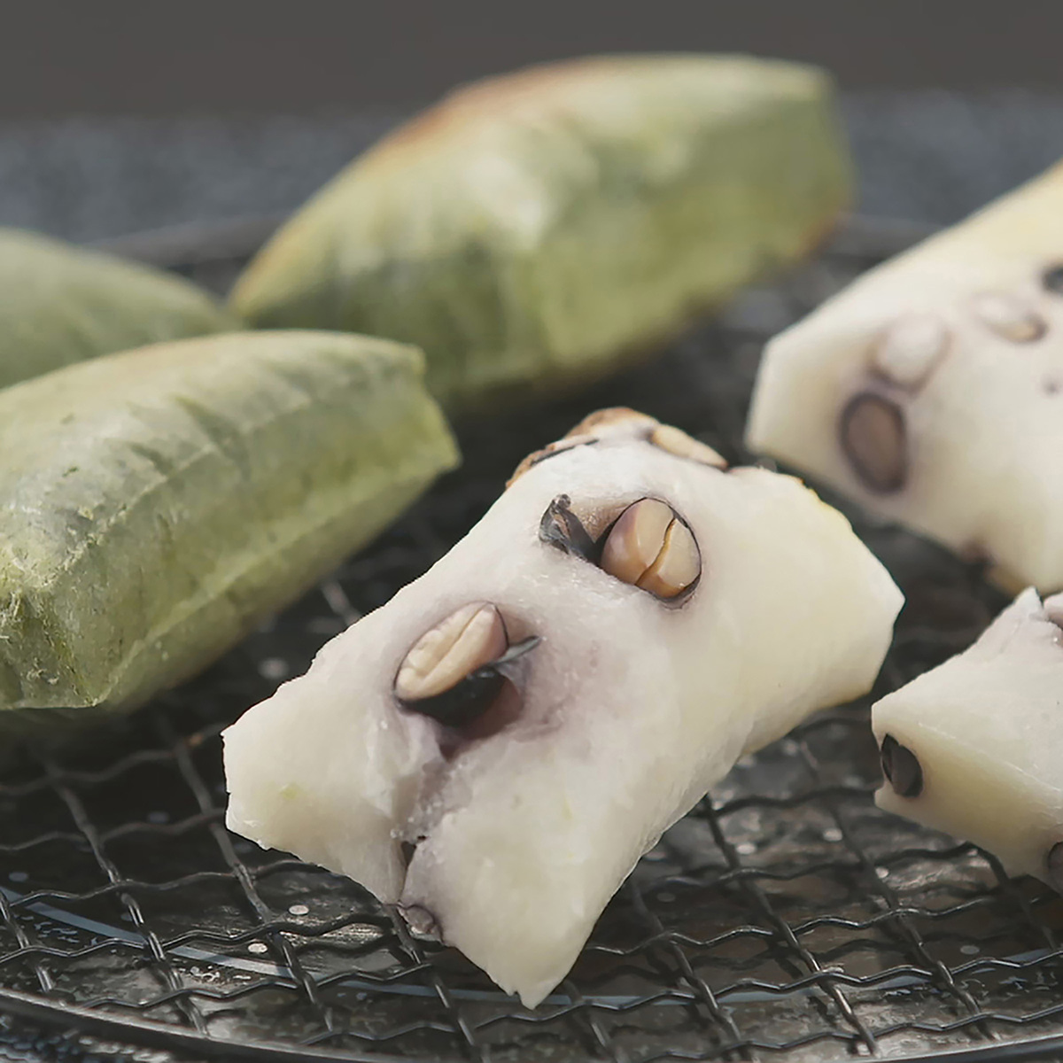 魚沼産のこがねもち米を使用した豆餅と蓬餅。原料のこがねもち米は、化学肥料5割減、農薬5割減にした特別栽培のものを使用しています。黒豆餅の黒豆、蓬餅のよもぎも魚沼産です