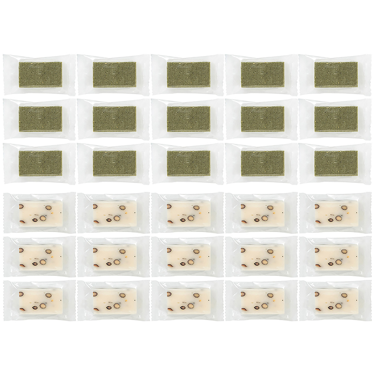 [アレルギー物質特定原材料8品目] なし [商品内容] ・よもぎ餅45g×15個 ・豆餅45g×15個/計1350g [賞味期限] 出荷時点で賞味期限まで35日以上ある商品をお届けします [保存方法] 開封前:直射日光・高温多湿を避け、冷暗所にて保存してください 開封後:冷蔵庫で保管のうえ、なるべくお早めにお召し上がりください [お召し上がり方] オーブントースターなどで焼いてお召し上がりください 湯せんしてもお召し上がりいただけます [注意事項] ※外気の温度変により袋の中に水滴が発生する事がありますが、品質には問題ありません ※開封後はきっちり封をし、冷蔵庫で保管してください [原料原産地] 水稲もち米(新潟県魚沼産100%) [原産国] 日本 [原材料] よもぎ餅: 水稲もち米(新潟県魚沼産100%)、よもぎ、食塩 豆餅: 水稲もち米(新潟県魚沼産100%)、大豆(黒豆)、食塩