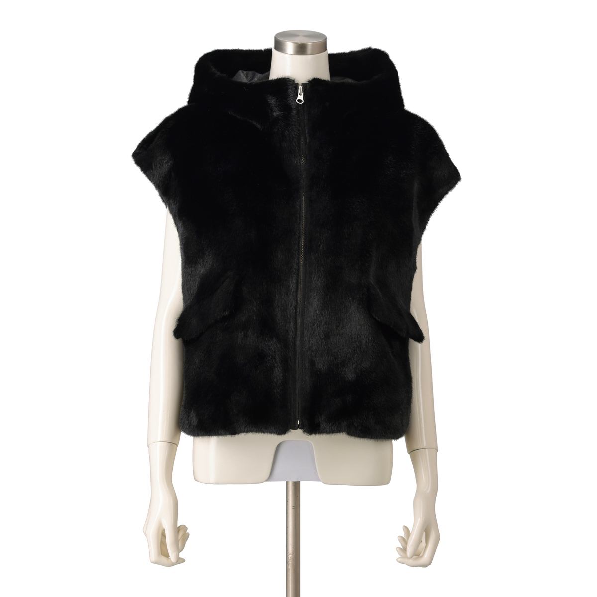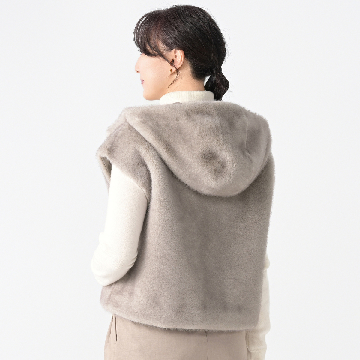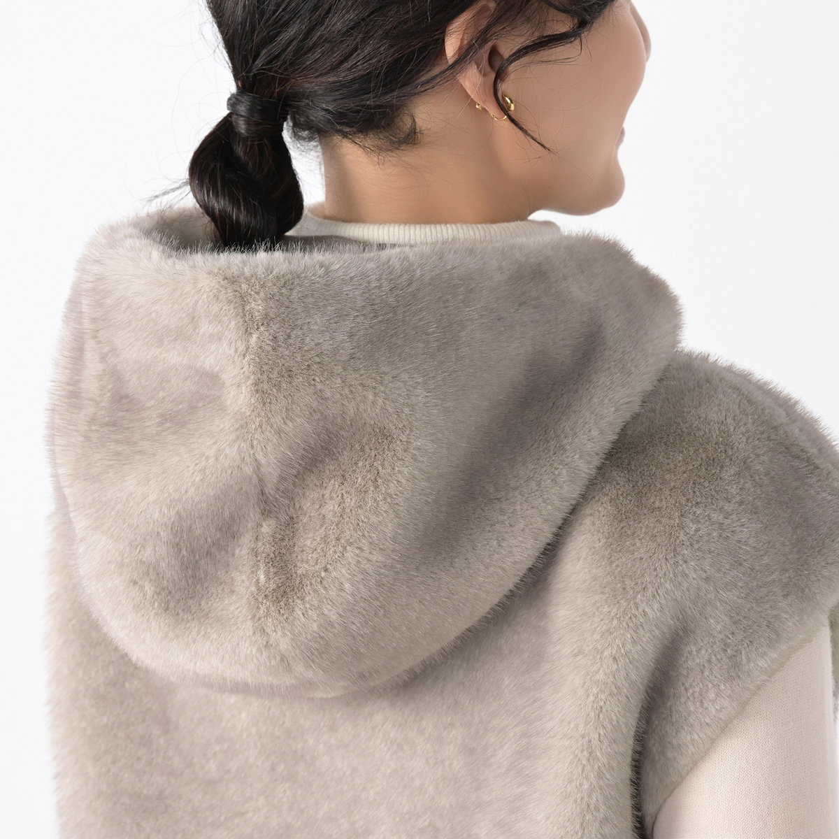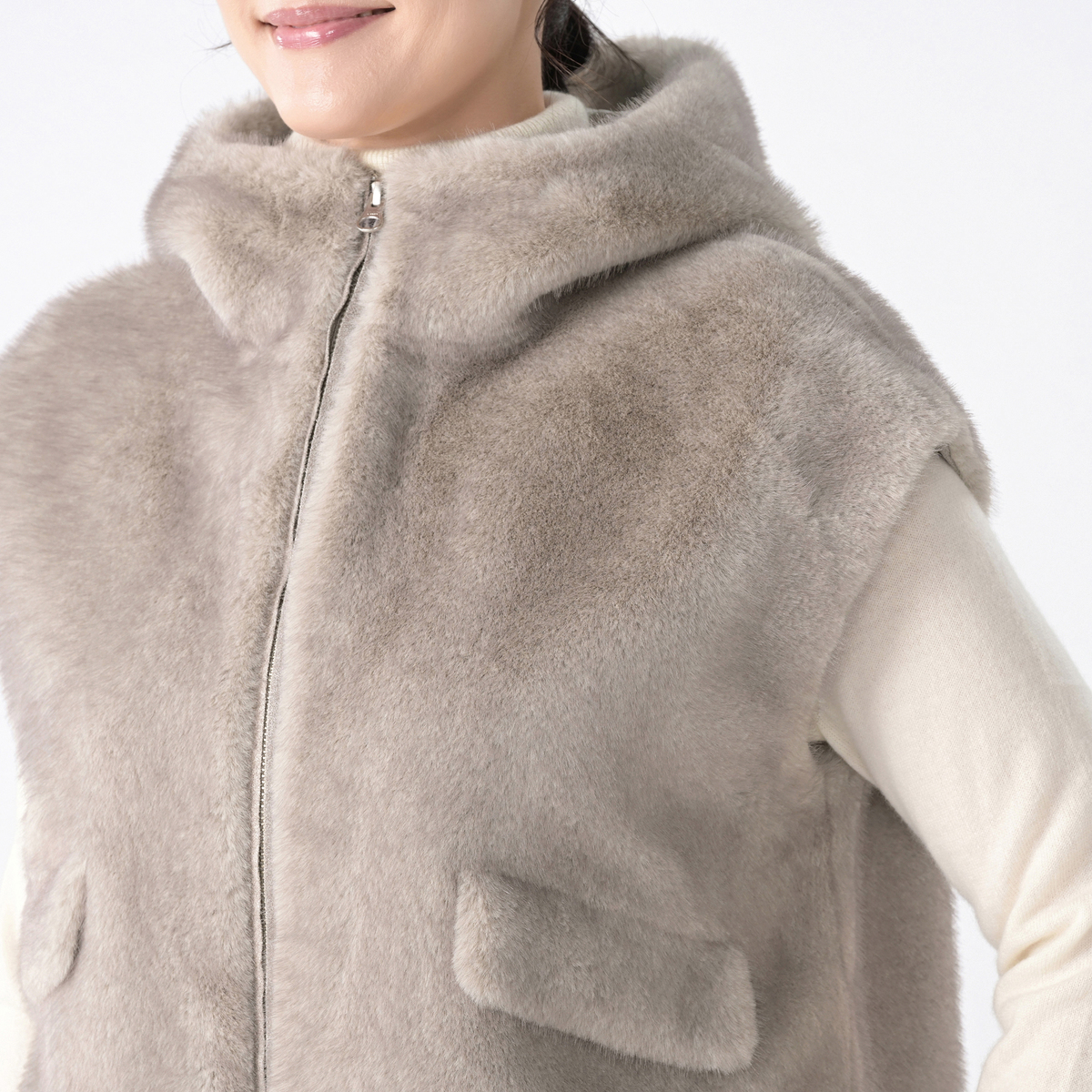ミンクのような光沢と手触りを持つエコファー素材のフーディーベスト。カジュアルさと上質な佇まいが絶妙に調和し、オンにもオフにも様々なコーデにマッチ。合わせやすい着丈で、裾裏のゴムとアジャスターでシルエットの調整も楽しめます