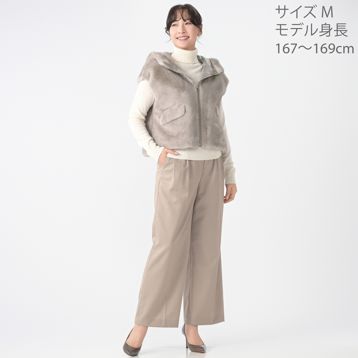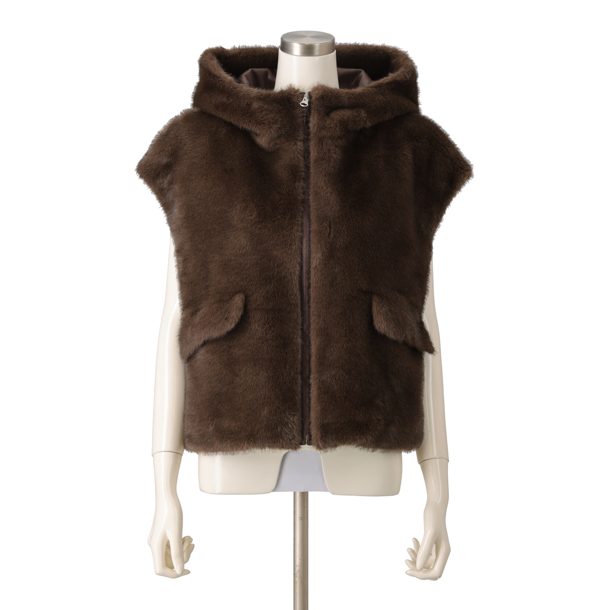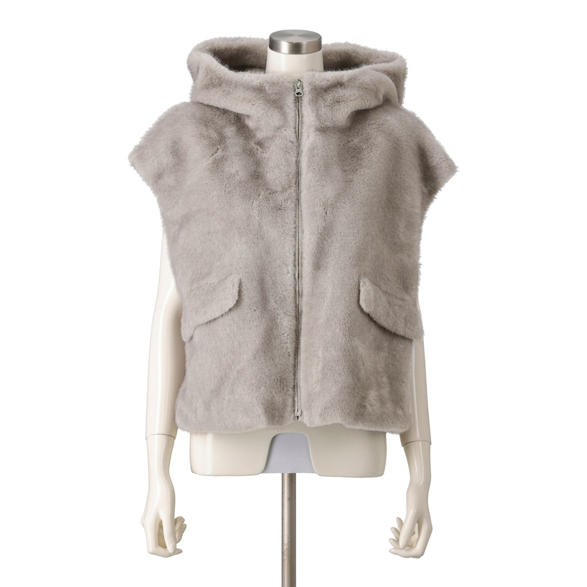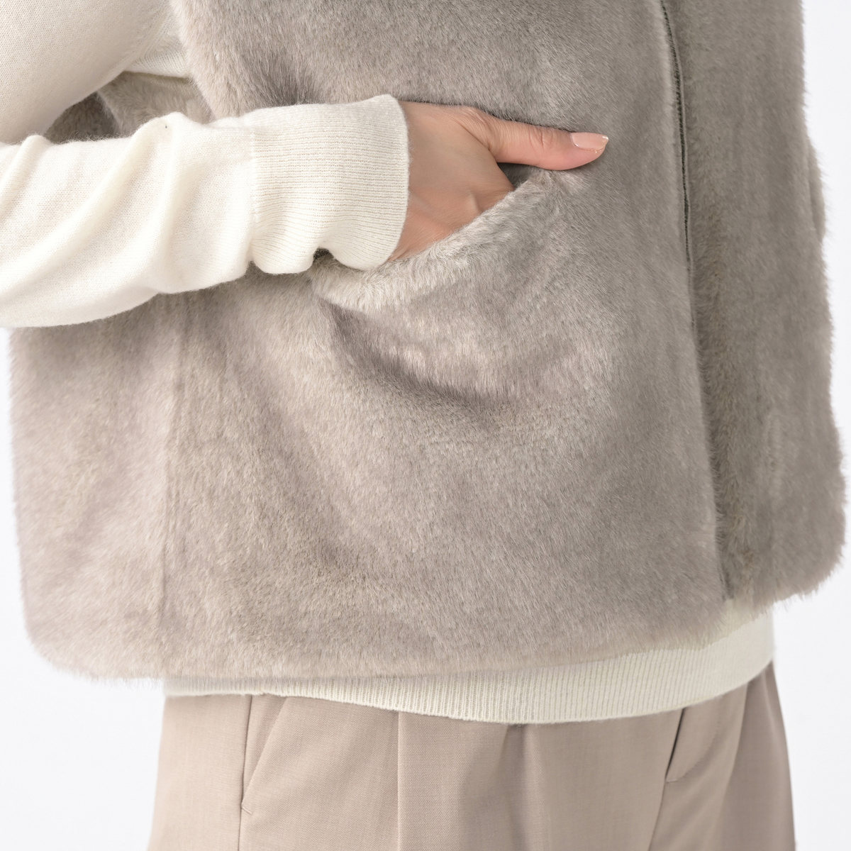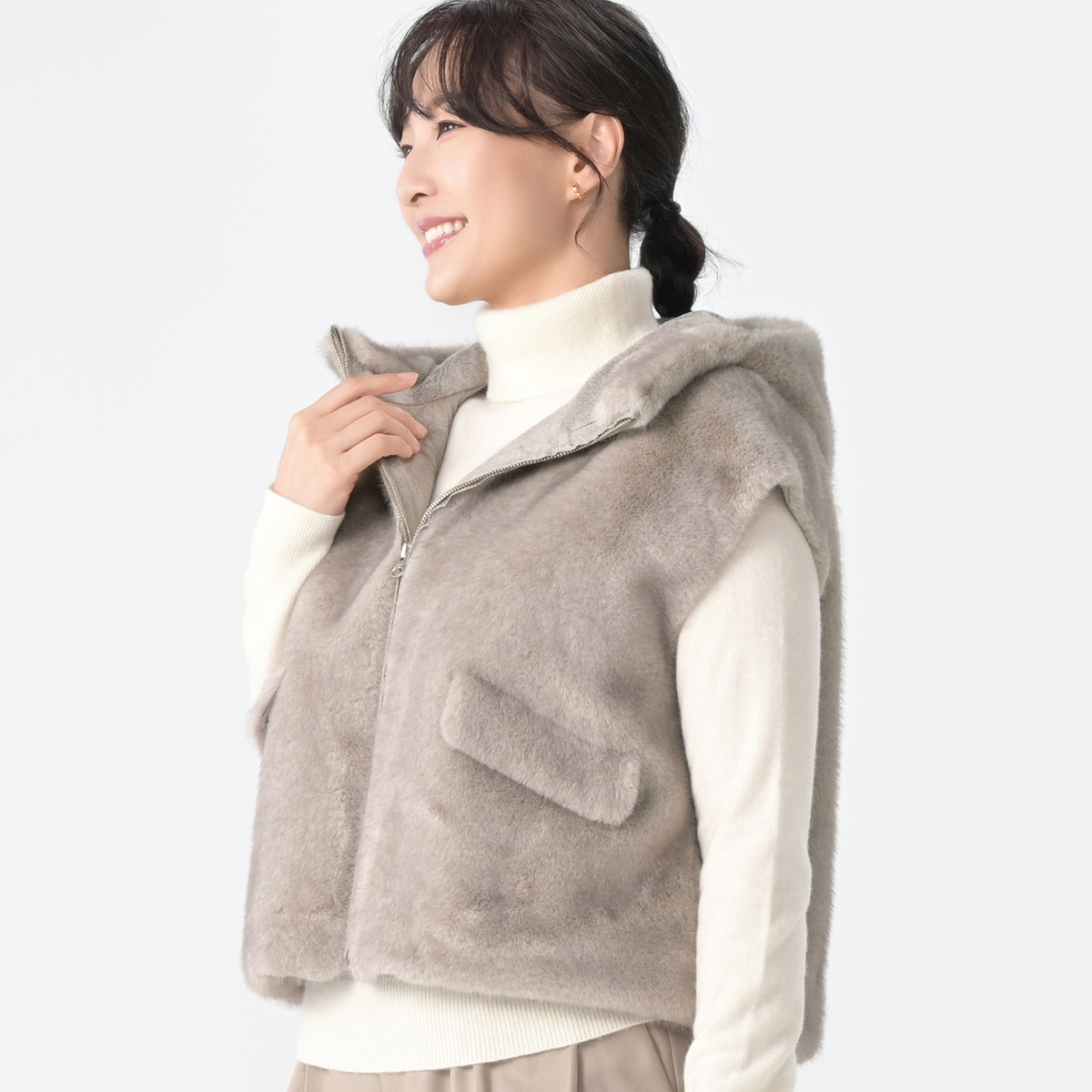 ミンクのような光沢と手触りを持つエコファー素材のフーディーベスト。カジュアルさと上質な佇まいが絶妙に調和し、オンにもオフにも様々なコーデにマッチ。合わせやすい着丈で、裾裏のゴムとアジャスターでシルエットの調整も楽しめます
