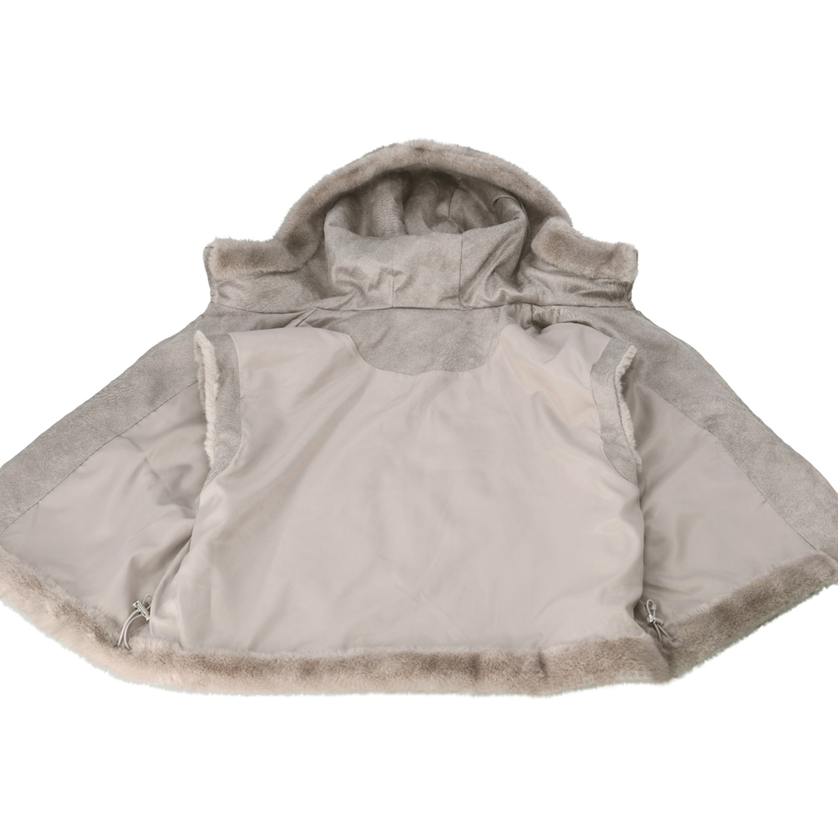 ポリエステルのエコファーで、フード裏や前合わせ裏にはレザー風の生地を配し、異素材の組合せがアクセントになっています