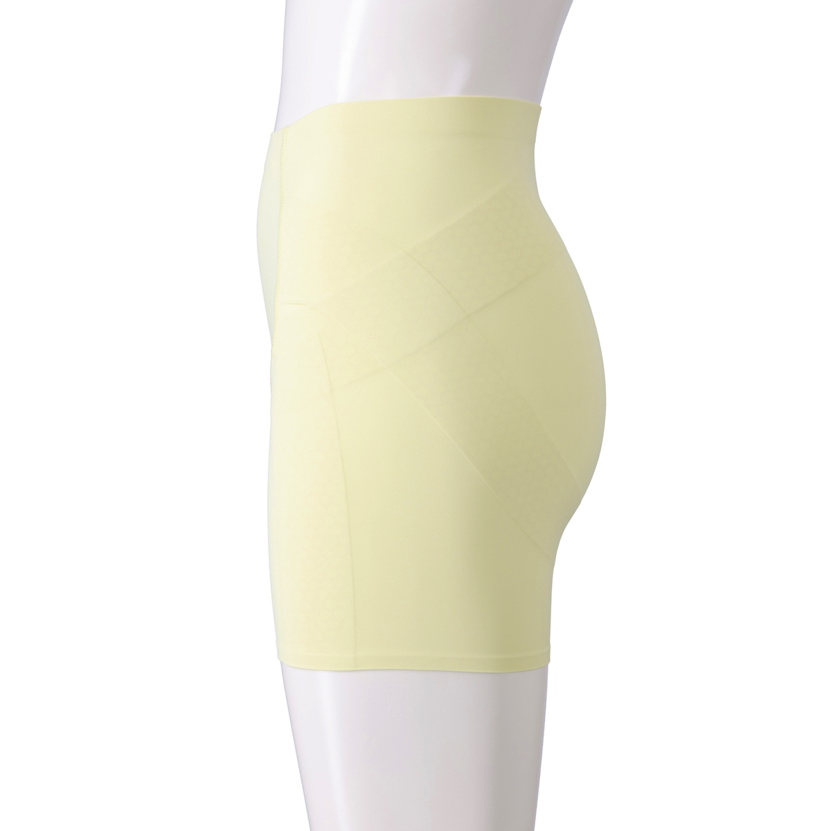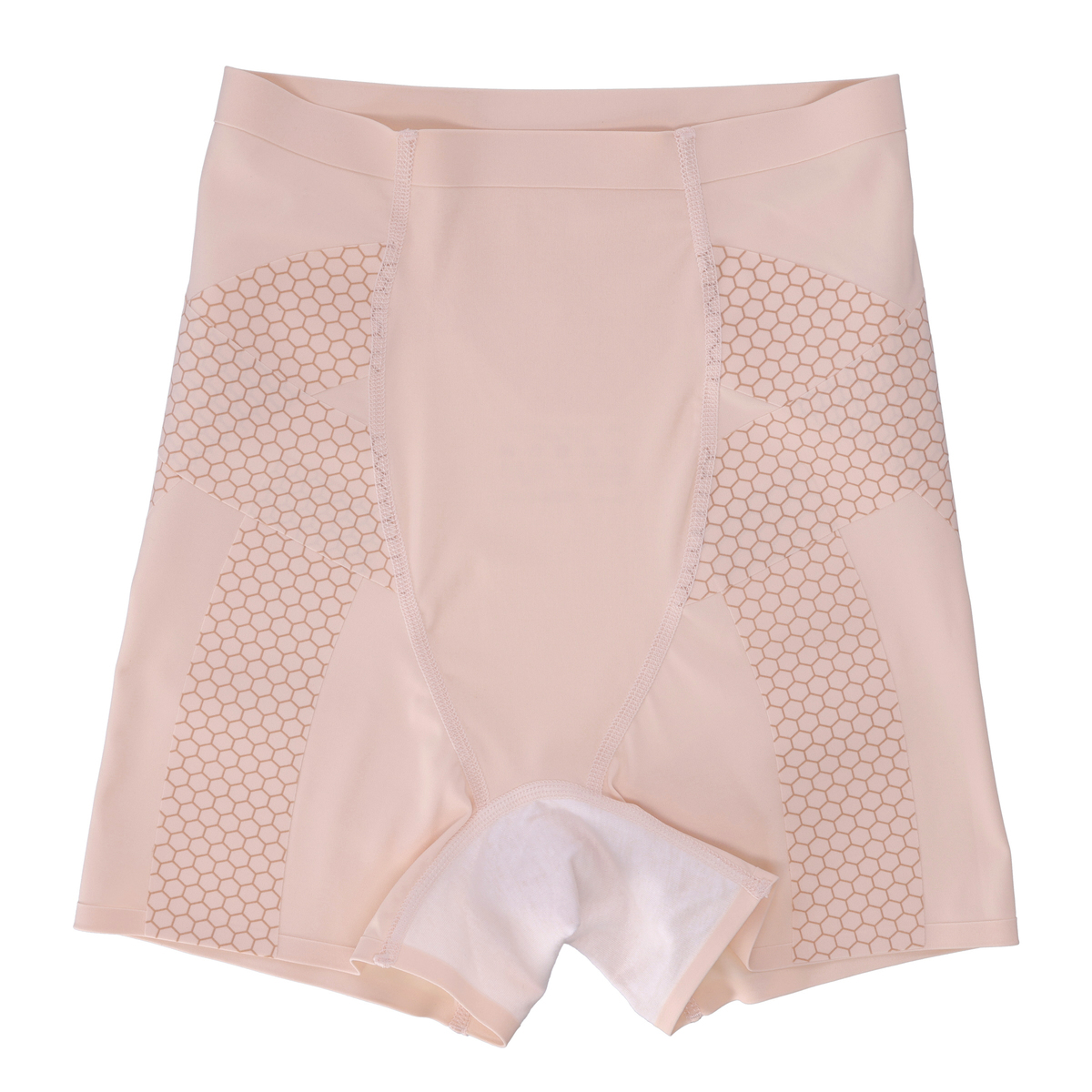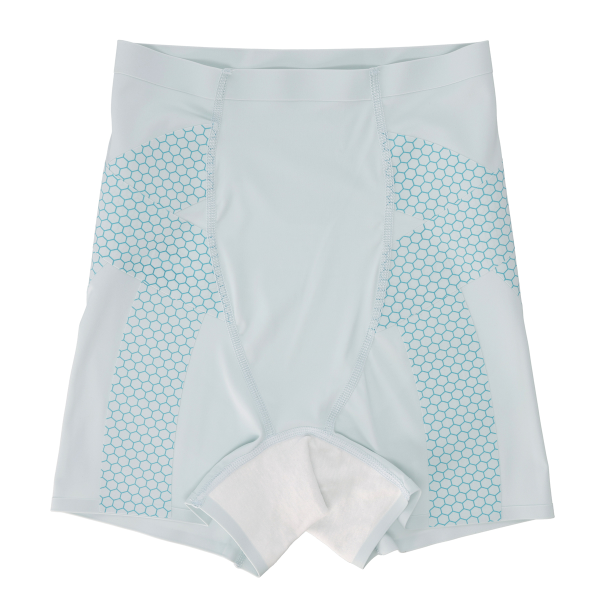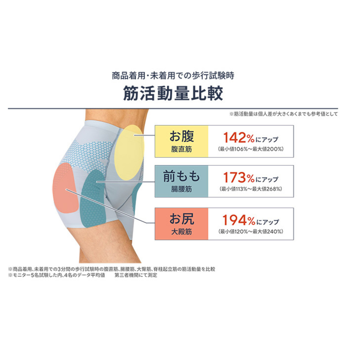 腹部までカバーできるようなハイウエスト、歩きやすいように二分丈を採用。ヒップラインのサポートにより体型カバーも。身生地部分は伸びが良く、ハニカムプリント部分は伸びにくい仕様にすることで、締め付けないサポートが可能です