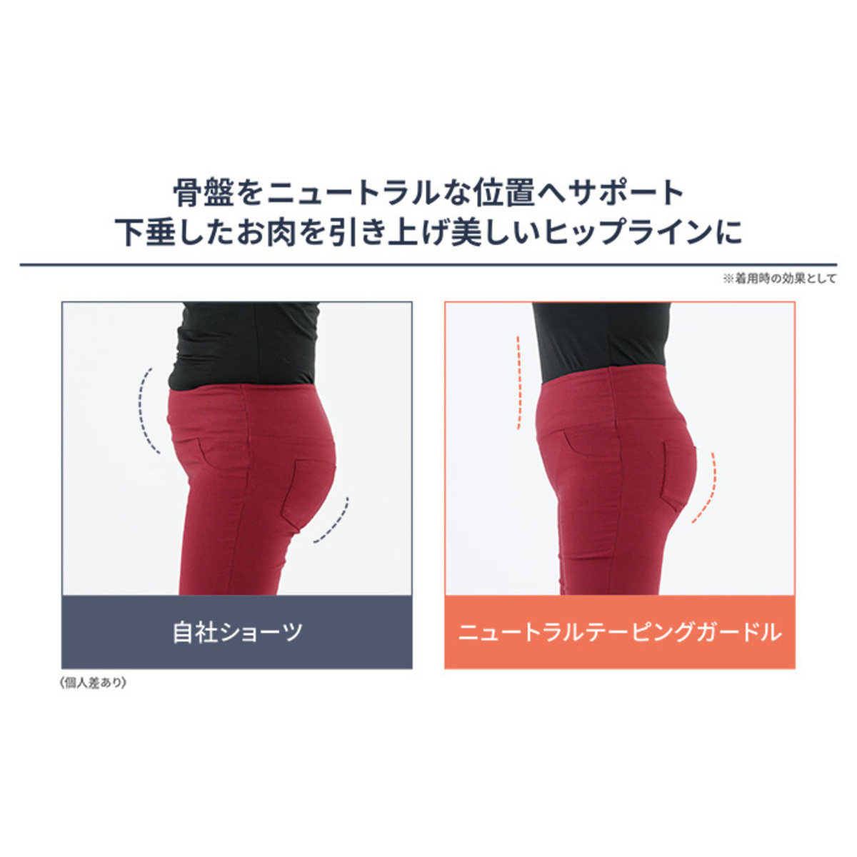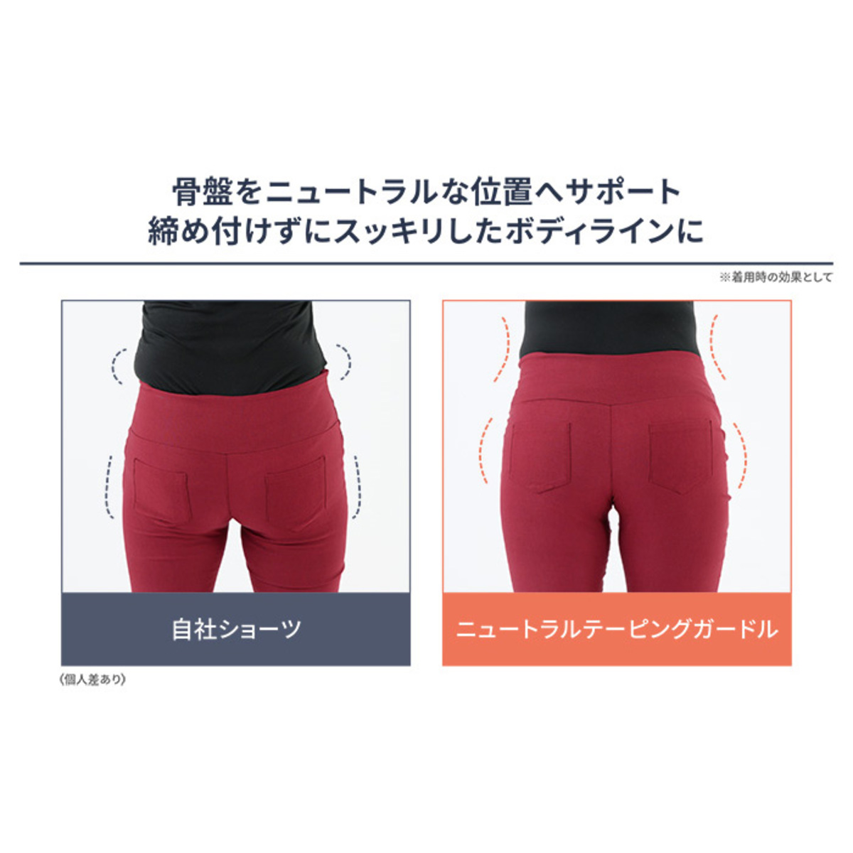 骨盤をニュートラルな位置に保ち、継続的にサポートすることを重視。サポートする位置のみにハニカムプリントを施したテーピングベルトを配置することで、それ以外の箇所は締め付けず股関節周りを固定・サポートします